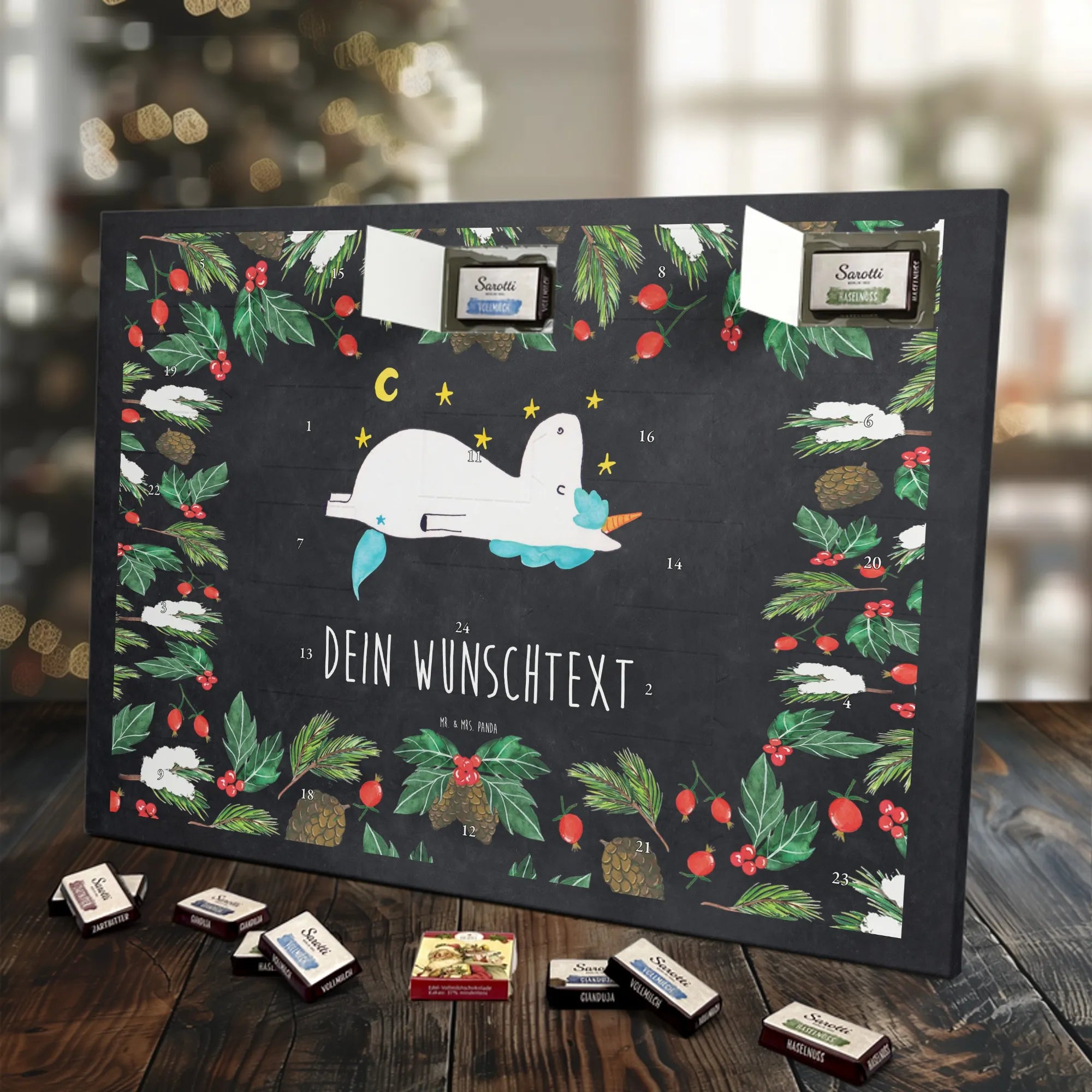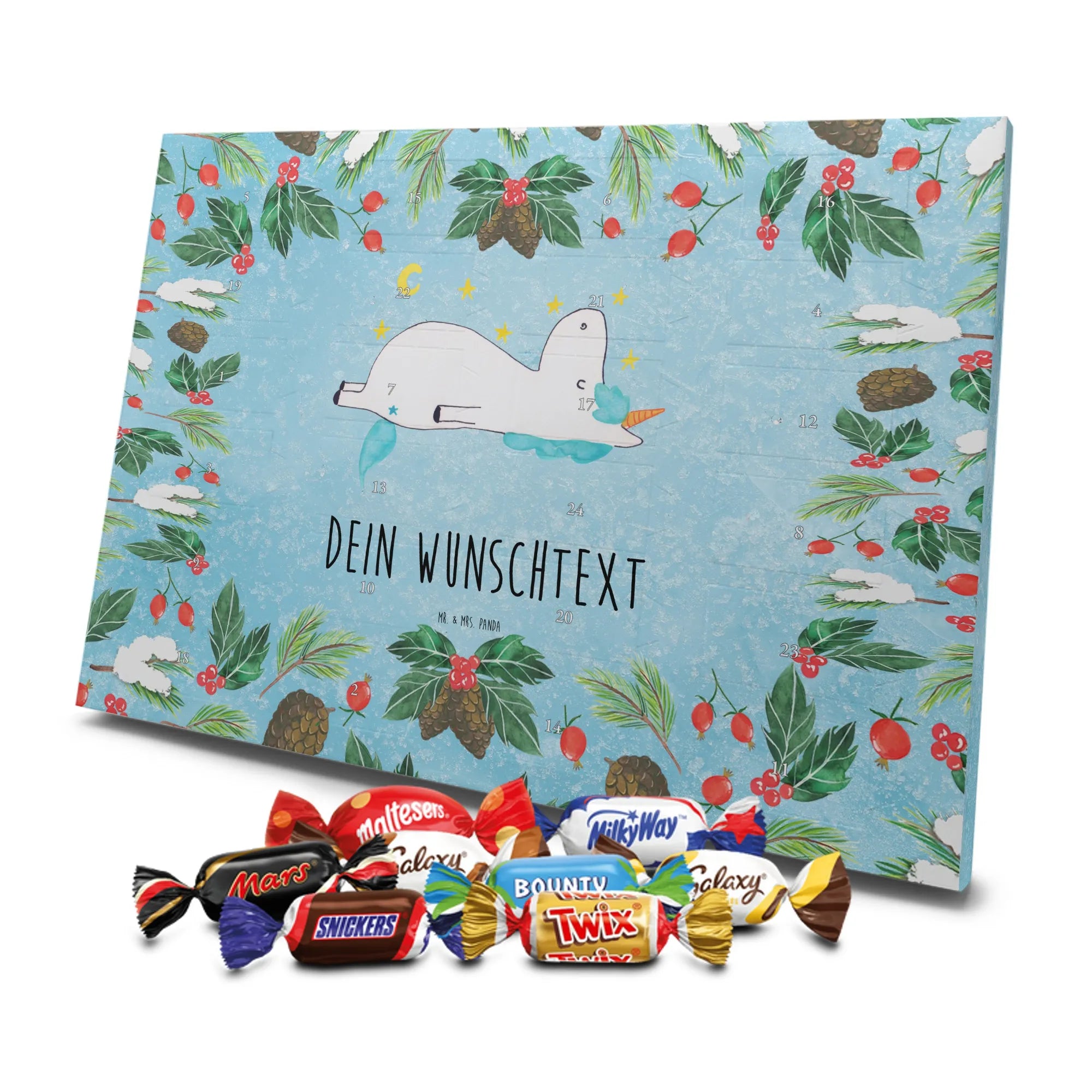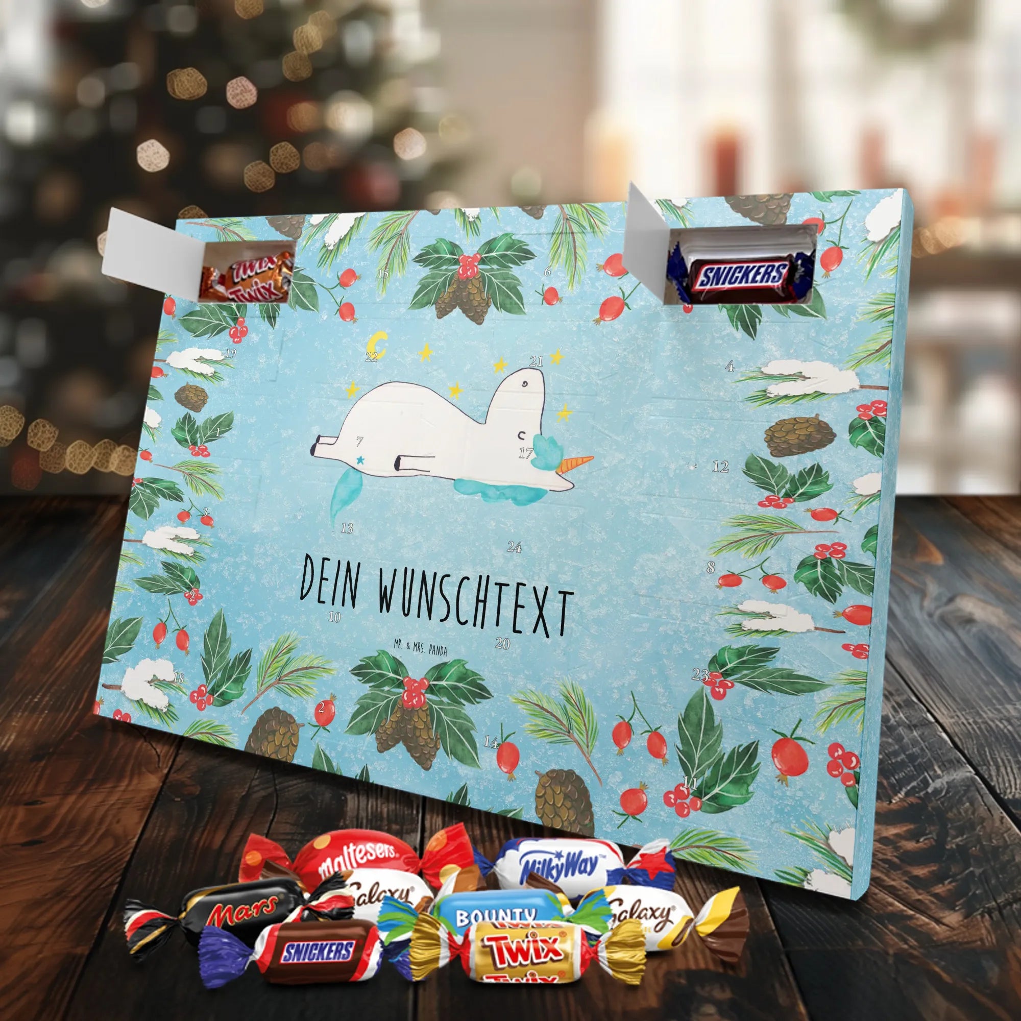 Personalisierter Schoko-Adventskalender von Mr. & Mrs. Panda – liebevoll gestaltet und ideal als individuelles Geschenk in der Adventszeit. Wir bedrucken den Kalender mit zauberhaften Motiven & herzlichen Sprüchen und personalisieren ihn mit deinem Wunschnamen oder Wunschtext. Die hochwertige Druckqualität kombiniert mit einer seidenmatten Oberflächenveredelung sorgt für ein edles Erscheinungsbild, und die bedruckten Seitenflächen geben dem Motiv zusätzlichen Charme. Der Kalender kann aufgehängt oder aufgestellt werden, sodass du ihn flexibel platzieren kannst. Gefüllt ist der Kalender mit Celebrations, die 24 hochwertige Überraschungen in 8 verschiedenen Sorten beinhalten: Maltesers, Mars, Snickers, Twix, Milky Way, Bounty, Galaxy und Galaxy Caramel. Maße: 325 mm x 225 mm x 27 mm – handlich und doch großzügig für die kleinen Leckereien hinter den Türchen. Ob für Kinder, Partner oder beste Freunde: dieser personalisierte Schoko-Adventskalender macht das Warten auf Weihnachten bunter und leckerer. Verschenke eine persönliche Erinnerung und jeden Tag ein kleines Schokoladen-Glück!