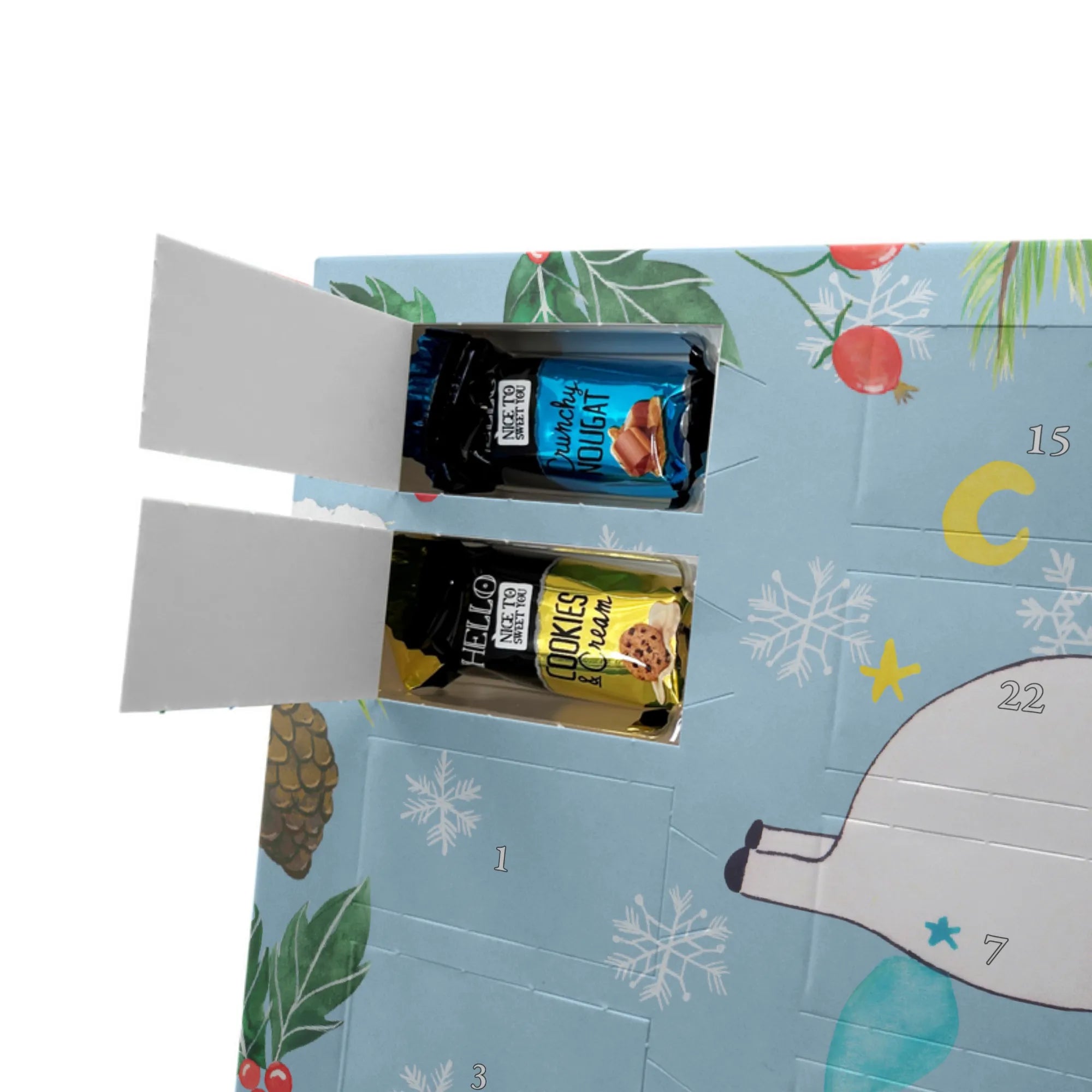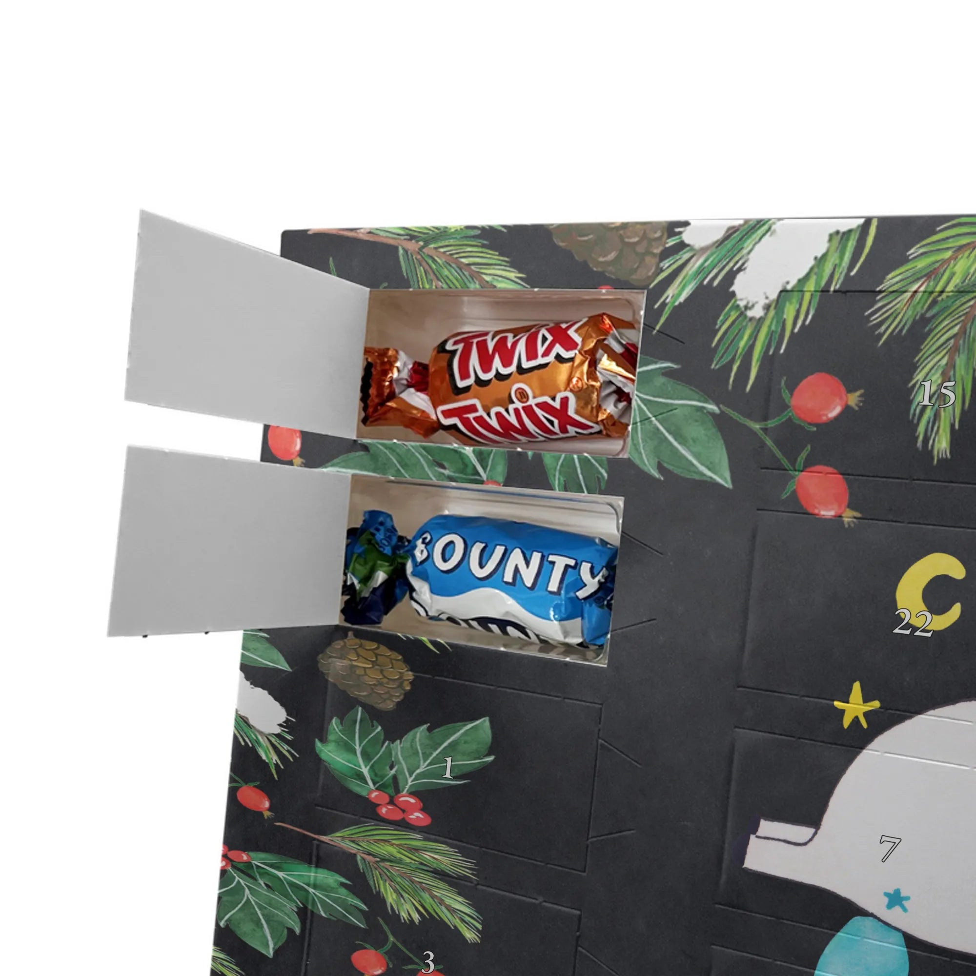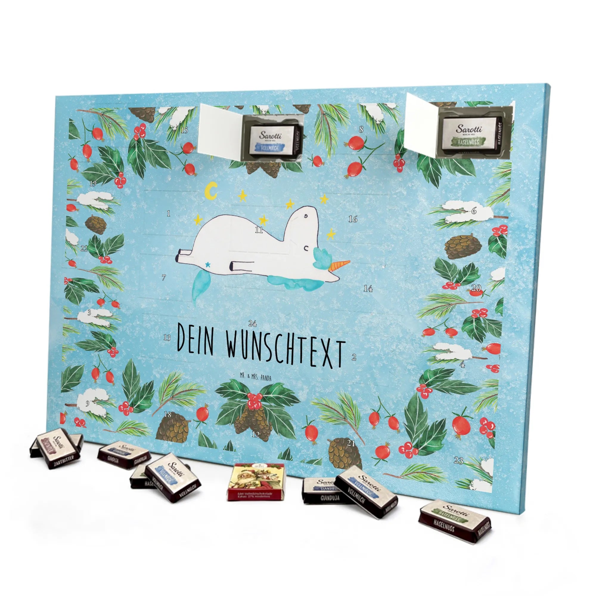 Personalisierter Schoko-Adventskalender von Mr. & Mrs. Panda – liebevoll gestaltet und ideal als individuelles Geschenk in der Adventszeit. Wir bedrucken den Kalender mit zauberhaften Motiven & herzlichen Sprüchen und personalisieren ihn mit deinem Wunschnamen oder Wunschtext. Die hochwertige Druckqualität kombiniert mit einer seidenmatten Oberflächenveredelung sorgt für ein edles Erscheinungsbild, und die bedruckten Seitenflächen geben dem Motiv zusätzlichen Charme. Der Kalender kann aufgehängt oder aufgestellt werden, sodass du ihn flexibel platzieren kannst. Gefüllt ist der Kalender mit Celebrations, die 24 hochwertige Überraschungen in 8 verschiedenen Sorten beinhalten: Maltesers, Mars, Snickers, Twix, Milky Way, Bounty, Galaxy und Galaxy Caramel. Maße: 325 mm x 225 mm x 27 mm – handlich und doch großzügig für die kleinen Leckereien hinter den Türchen. Ob für Kinder, Partner oder beste Freunde: dieser personalisierte Schoko-Adventskalender macht das Warten auf Weihnachten bunter und leckerer. Verschenke eine persönliche Erinnerung und jeden Tag ein kleines Schokoladen-Glück!