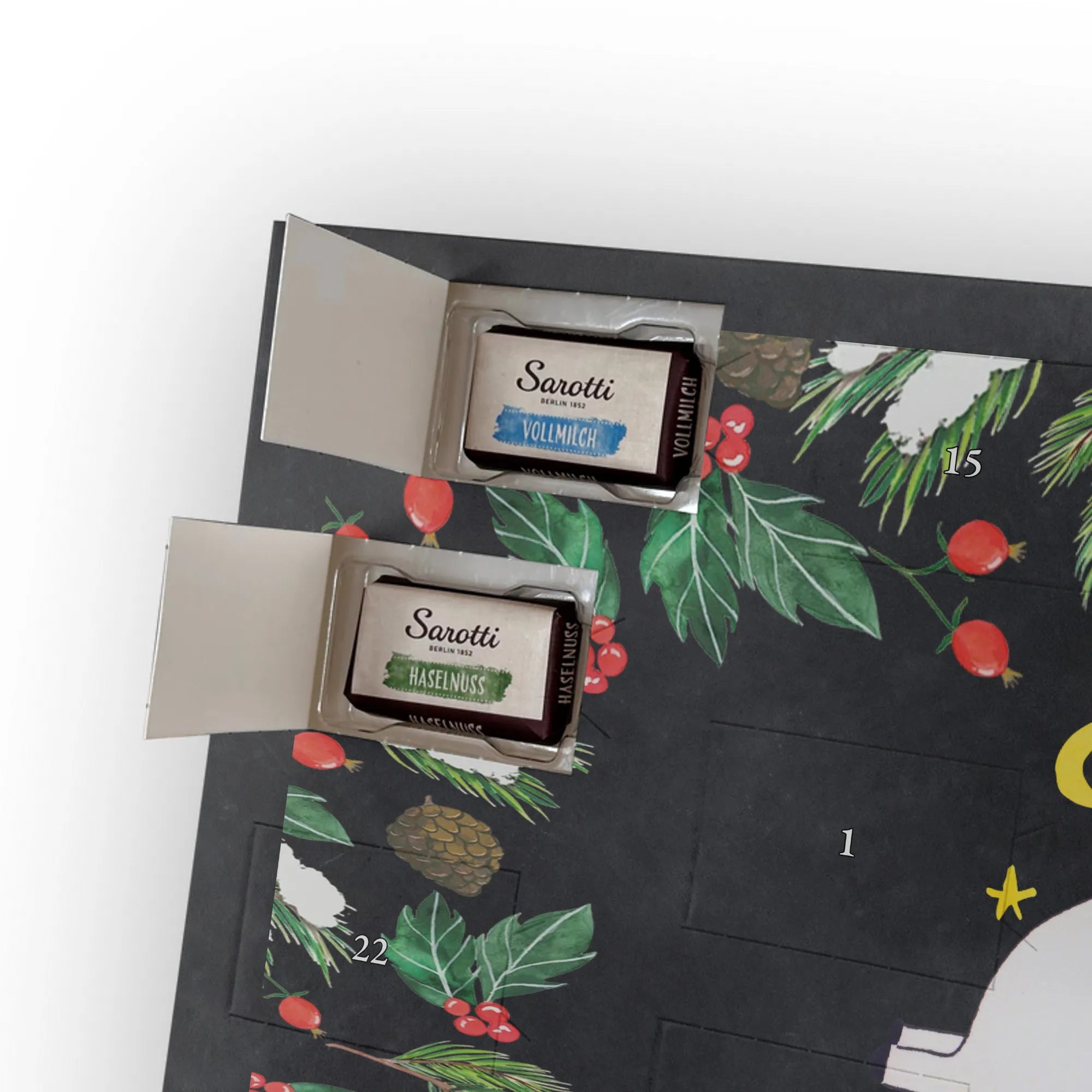 Gefüllt ist er mit 24 einzeln verpackten Täfelchen der Markenschokolade Sarotti® und Confiserie Heidel® in den Geschmacksrichtungen Vollmilch, Nougat, Zartbitter und Haselnuss. Insgesamt enthält der Kalender 107 g Markenschokolade – ideal für kleine Genussmomente im Advent.