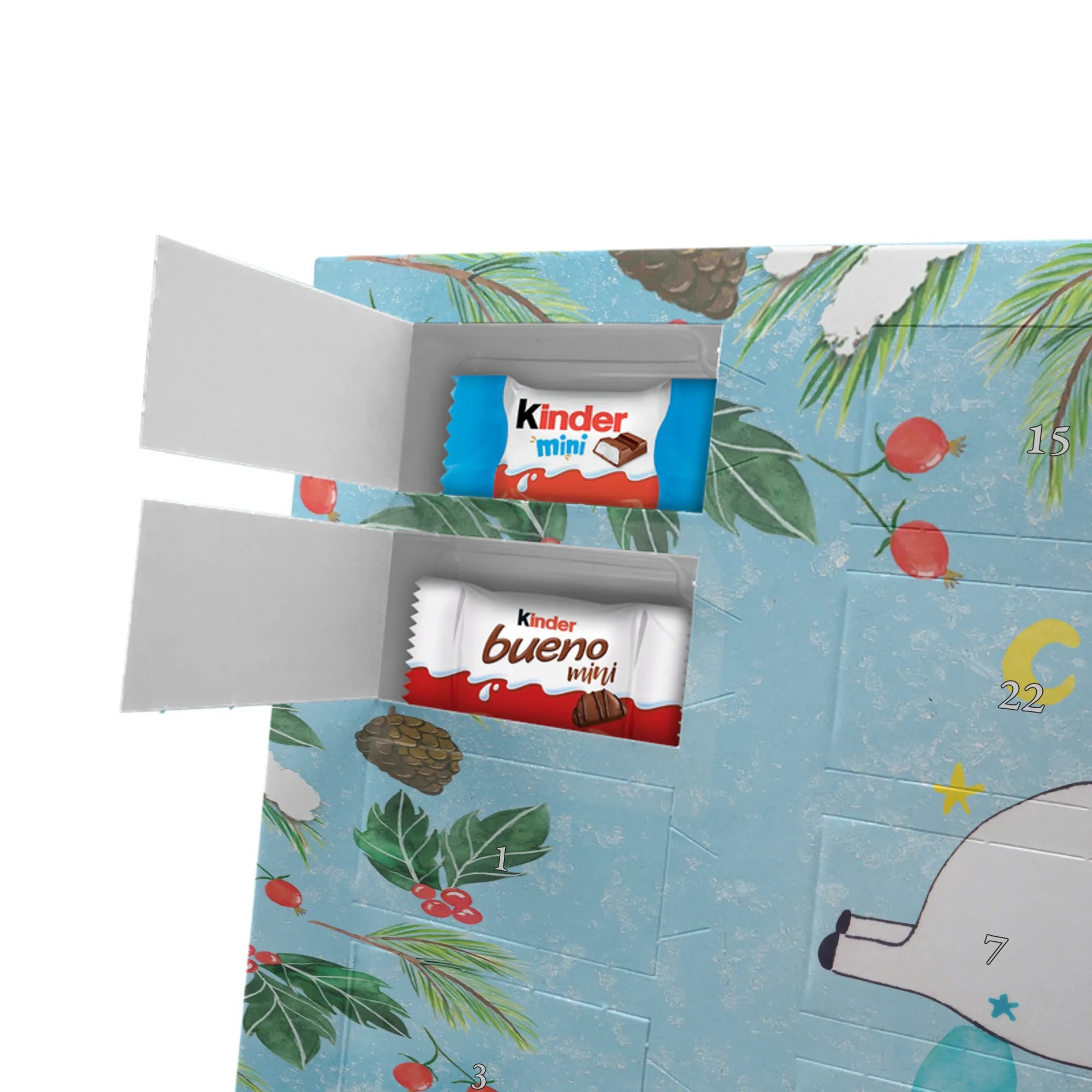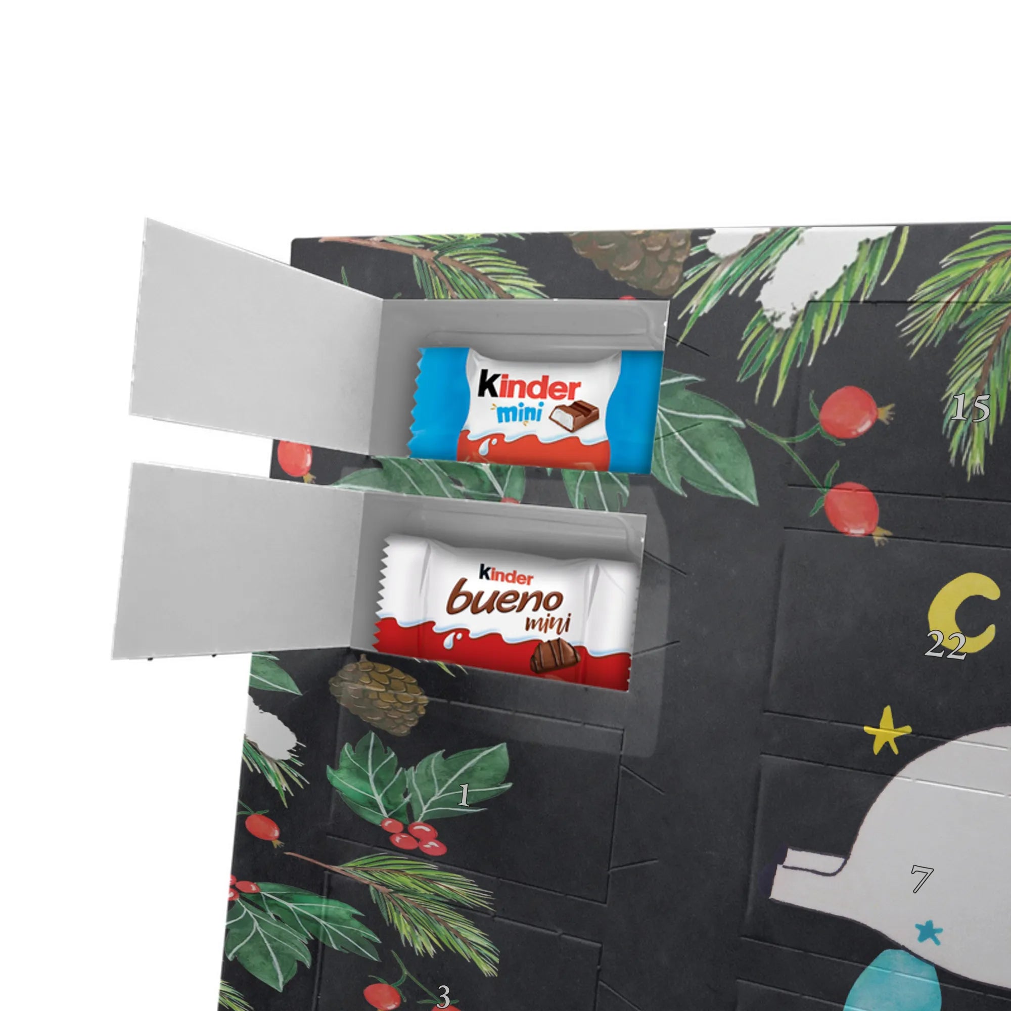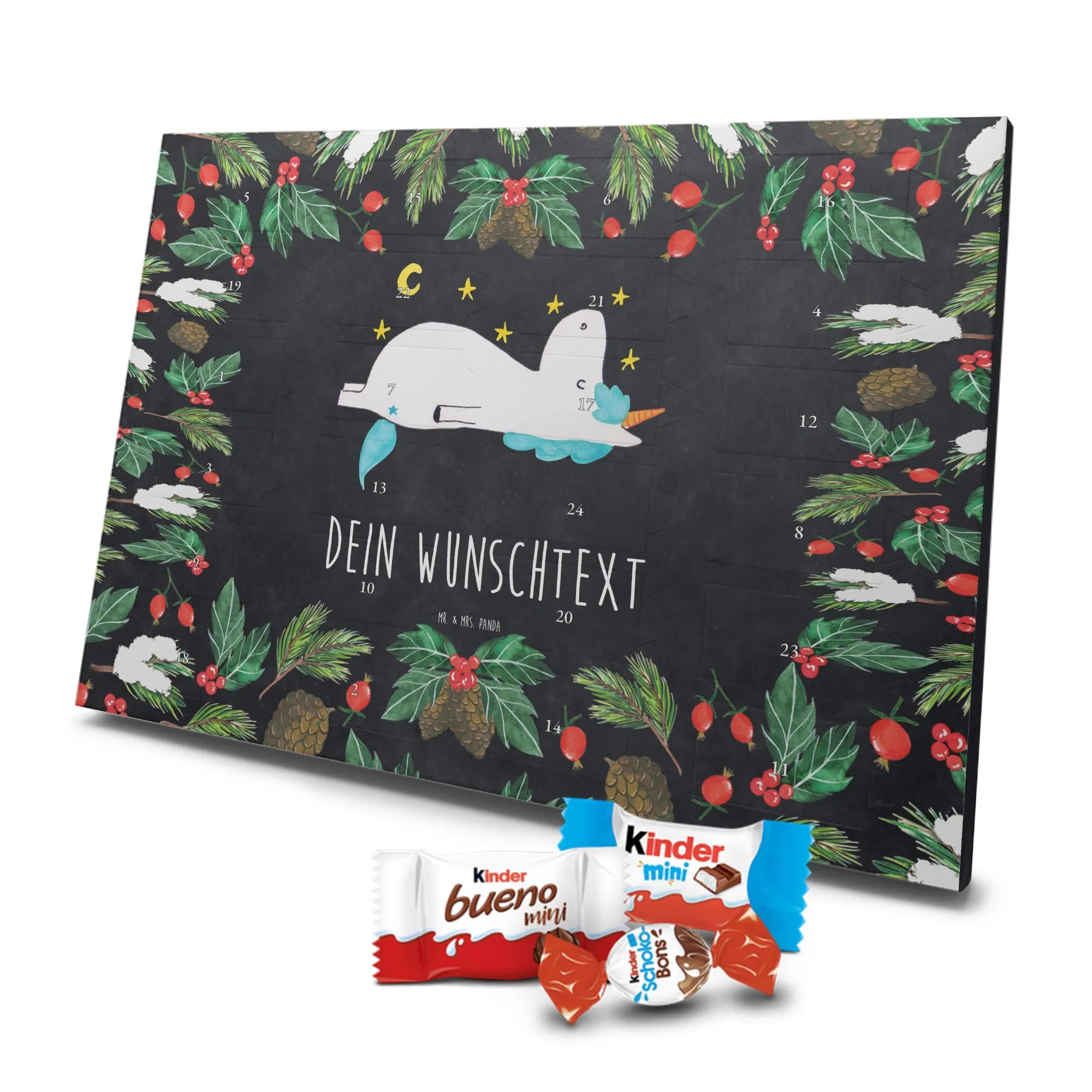 Wunderschöner Personalisierter Schoko Adventskalender von Mr. & Mrs. Panda – perfekt, um die Vorweihnachtszeit besonders persönlich zu gestalten. Unser liebevoll gestalteter Adventskalender ist bedruckt mit wunderschönen Motiven & Sprüchen von Mr. & Mrs. Panda und lässt sich mit deinem Wunschnamen oder Wunschtext personalisieren. Die brillante Druckqualität mit seidenmatter Oberflächenveredelung sorgt für einen edlen Look, und auch die Seitenflächen sind bedruckt, sodass der Kalender von allen Seiten ein Hingucker ist. Du kannst ihn sowohl aufgehängt als auch aufgestellt verwenden, je nachdem, wie es bei dir am besten passt. Maße: 355 mm x 245 mm x 11 mm – kompakt genug, um überall Platz zu finden, und groß genug für eine schöne Überraschung hinter jedem Türchen. Besonderheit: kann aufgehängt oder aufgestellt werden, ideal für Tisch, Regal oder Wand. Gefüllt mit kinder® Schokolade: Adventskalender gefüllt mit kinder® Schokolade; Inhalt: kinder® Schoko-Bons, kinder® Bueno mini und kinder® Schokolade mini. Ein toller persönlicher Adventsteller für Freunde, Familie oder dich selbst – zaubere jeden Tag ein Lächeln ins Gesicht mit süßen Highlights und einem liebevollen Design von Mr. & Mrs. Panda.