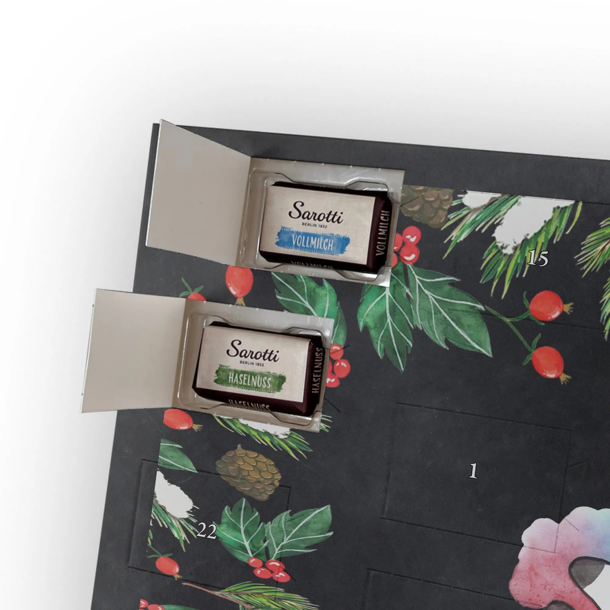 Er verbindet ein wundervolles Design aus der Einhorn - Kollektion mit hochwertiger Schokolade: 24 einzeln verpackte Täfelchen gefüllt mit Markenschokolade von Sarotti® und Confiserie Heidel® in den Geschmacksrichtungen Vollmilch, Nougat, Zartbitter und Haselnuss. Die brillante Druckqualität und die seidenmatte Oberfläche lassen das Aquarell-Motiv von Mrs. Panda besonders hübsch wirken. Bedruckte Seitenflächen und die Möglichkeit, den Kalender aufzuhängen oder aufzustellen, machen ihn besonders vielseitig.