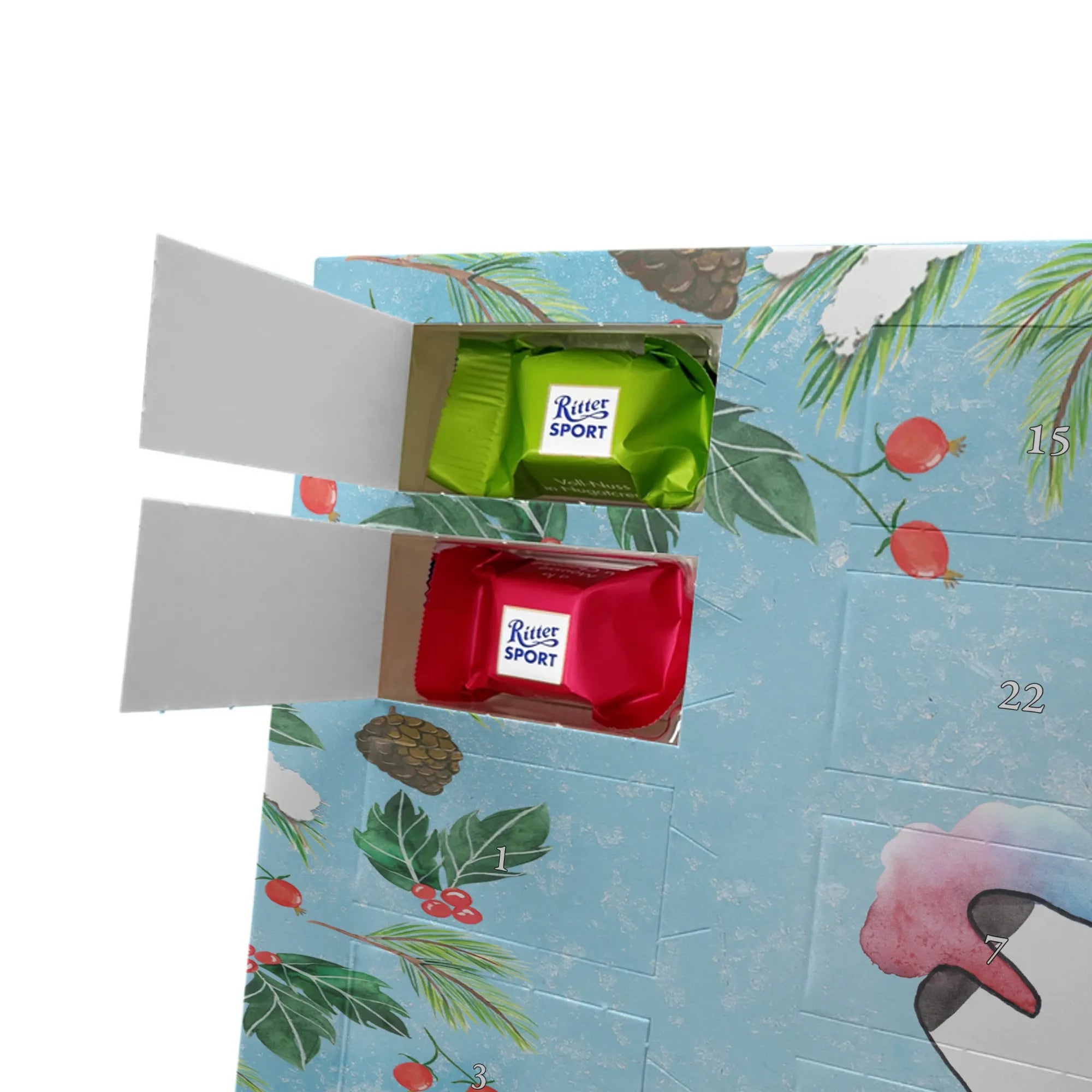 Verschenke Vorfreude mit unserem liebevoll gestalteten Personalisierter Schoko Adventskalender von Mr. & Mrs. Panda. Jeder Kalender wird mit deinem Wunschtext oder Namen personalisiert und ist ein echter Blickfang – dank der fröhlichen Illustrationen und Kurzsprüche, die typisch für Mr. & Mrs. Panda sind. Die Druckqualität ist hervorragend, ergänzt durch eine seidenmatte Oberflächenveredelung, die das Motiv besonders edel erscheinen lässt. Auch die Seiten sind bedruckt, sodass kein Blickwinkel verloren geht. Der Kalender ist flexibel einsetzbar: du kannst ihn aufstellen oder platzsparend aufhängen. Hinter den 24 Türchen verstecken sich Ritter Sport Schokowürfel in folgenden leckeren Geschmacksrichtungen: Mousse au Chocolat, Schoko Crisp, Voll-Nuss in Nougatcreme, Karamell Duo, Joghurt und Erdbeer-Joghurt – für jeden Geschmack ist etwas dabei. Maße: 325 mm x 225 mm x 27 mm. Ein tolles Geschenk für Familie, Freunde oder für dich selbst, das jeden Dezembertag etwas süßer macht.