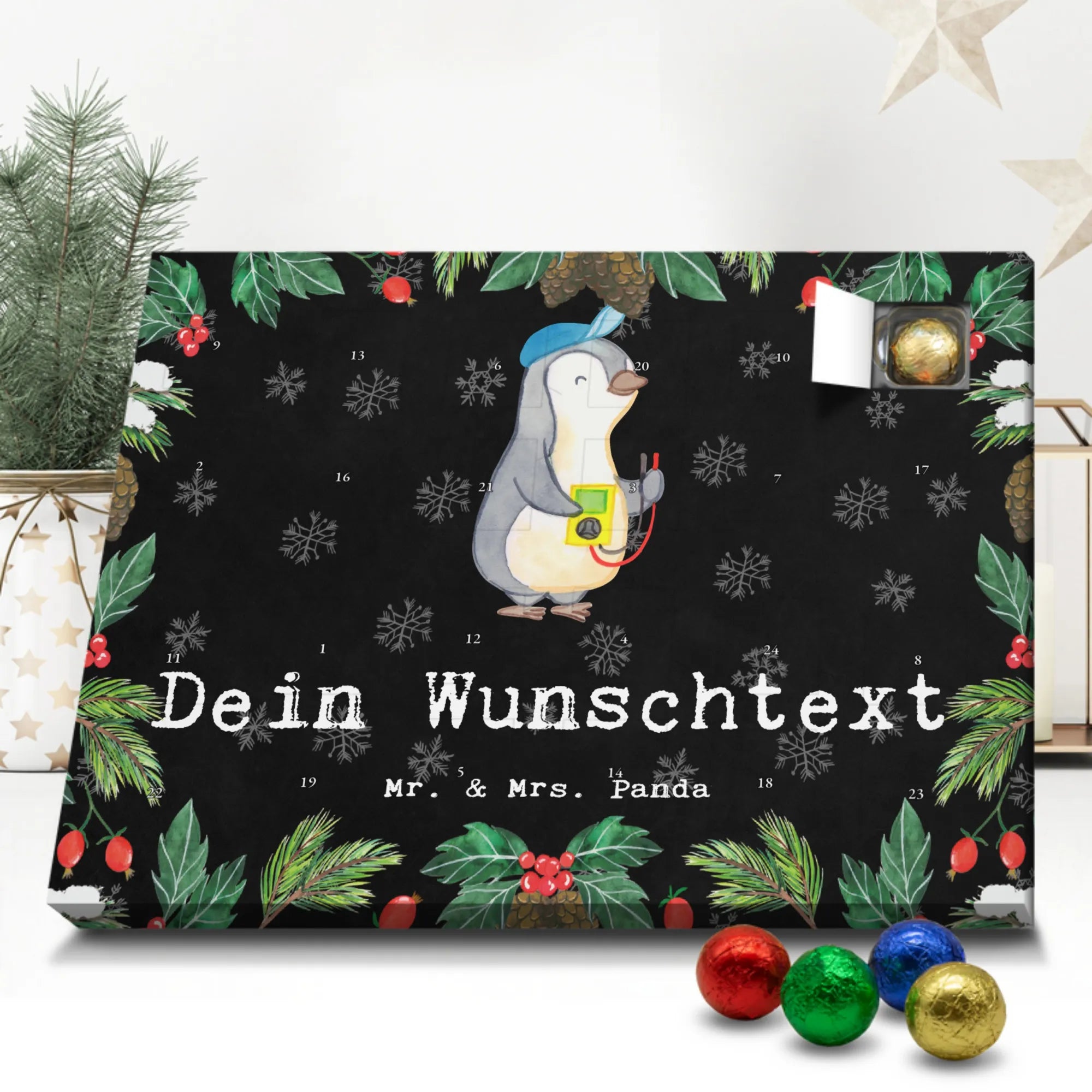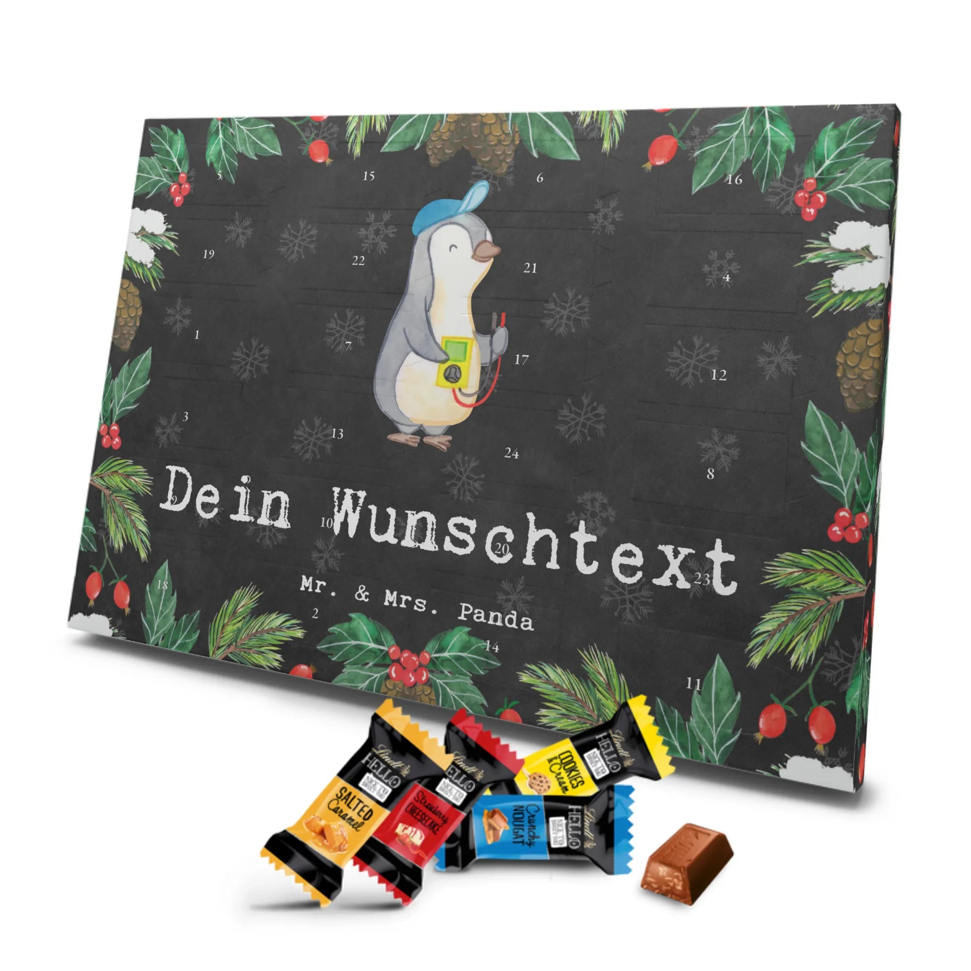 Mach die Adventszeit persönlich mit unserem Personalisierter Adventskalender mit Schokolade von Mr. & Mrs. Panda. Jeder Kalender ist liebevoll illustriert und bedruckt mit charmanten Sprüchen und Motiven – perfekt als Geschenk oder Deko für dein Zuhause. Du kannst deinen Wunschname oder einen kurzen Text hinzufügen, damit der Kalender ganz individuell wird. Die brillante Druckqualität und die seidenmatte Oberflächenveredelung sorgen für eine edle Optik, und auch die Seitenflächen sind komplett bedruckt. Maße: 233 mm x 178 mm x 24 mm. Die clevere Konstruktion erlaubt es, den Kalender aufzuhängen oder aufzustellen – flexibel und dekorativ zugleich. Gefüllt mit MARKENNAMEN Schokolade sowie köstlichen Schokoladenkugeln ist jeder Tag im Advent eine süße Überraschung. Wichtiger Hinweis: (Kann Spuren von Haselnüssen, Mandeln, Gluten und Soja enthalten!), kühl und trocken lagern! Egal ob für Kinder, Partner oder beste Freundin – dieser personalisierte Adventskalender bringt ein Lächeln und zaubert gemütliche Vorfreude. Bestell jetzt und gestalte deine Adventszeit mit einem Hauch Mr. & Mrs. Panda.