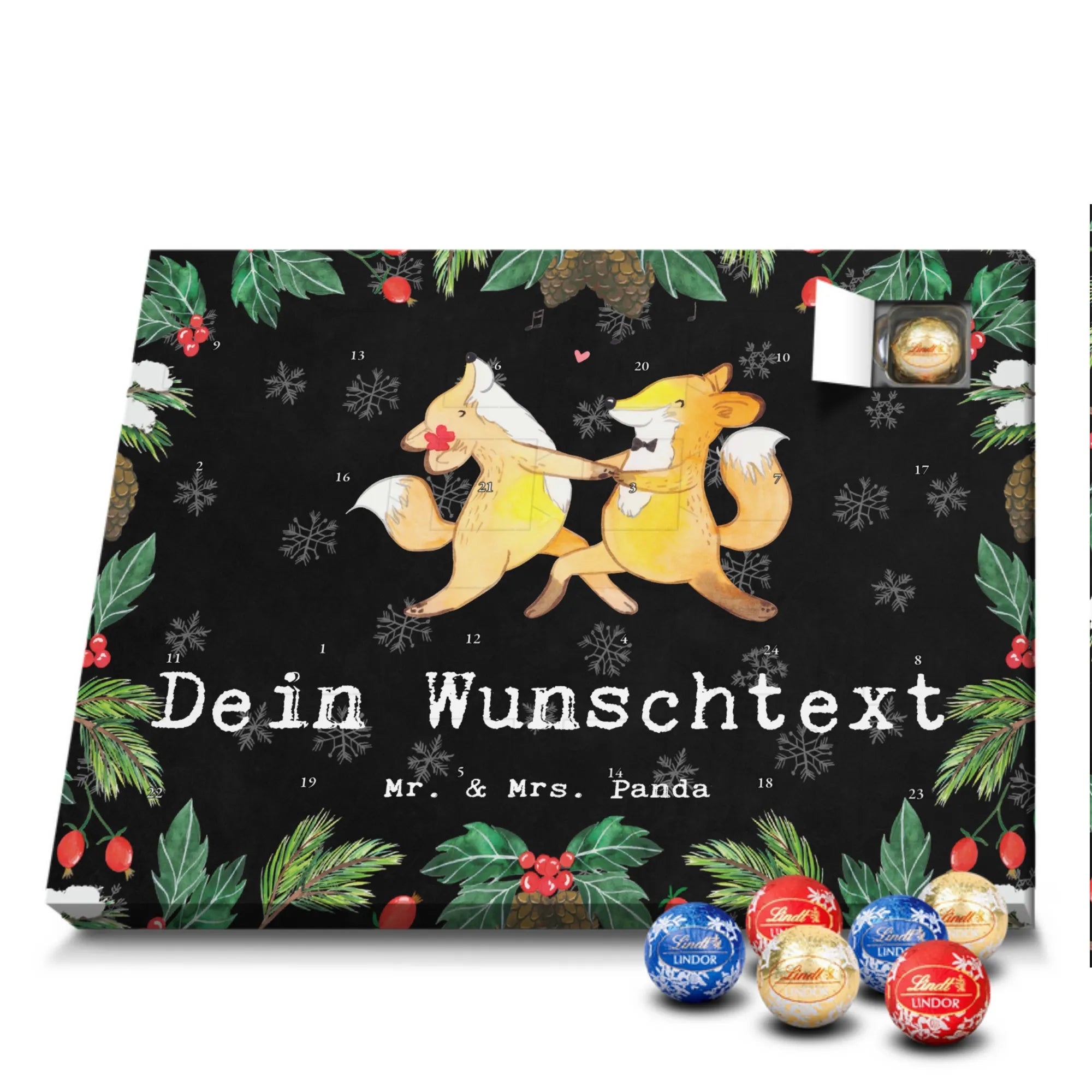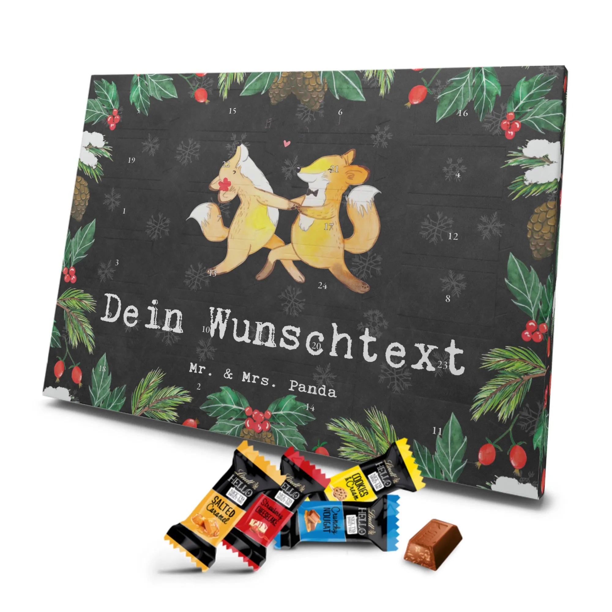 Personalisierter Schokoladen Adventskalender von Mr. & Mrs. Panda – perfekt für alle, die es süß und persönlich mögen. Unser Adventskalender ist mit liebevollen Illustrationen und charmanten Sprüchen von Mr. & Mrs. Panda bedruckt und kann mit deinem Namen oder Wunschtext individualisiert werden. Die brillante Druckqualität und die seidenmatte Oberflächenveredelung sorgen für ein edles Erscheinungsbild, zudem sind die Seitenflächen bedruckt. Maße: 233 mm x 178 mm x 24 mm. Du kannst den Kalender aufstellen oder aufhängen – je nachdem, wie du ihn am schönsten präsentierst. Gefüllt mit Lindt Lindor Schokolade: 24 einzeln verpackte Markenschokoladen Kugeln in drei köstlichen Sorten. Geschmacksrichtungen: Vollmilch, Feinherb und Weiße Schokolade. Zutaten: Zucker, pflanzliches Fett (Kokosnuss, Palmkern), Kakaobutter, Vollmilchpulver, Kakaomasse, Milchzucker, Magermilchpulver, Butterreinfett, Emulgator (Sojalecithin), Gerstenmalzextrakt, Aromen. Besondere Hinweise: Kann Haselnüsse und Mandeln enthalten. Ob als Advents-Überraschung für deine Liebsten oder als kleines Geschenk für Kollegen – dieser Kalender bringt personalisierten Genuss in die Vorweihnachtszeit.