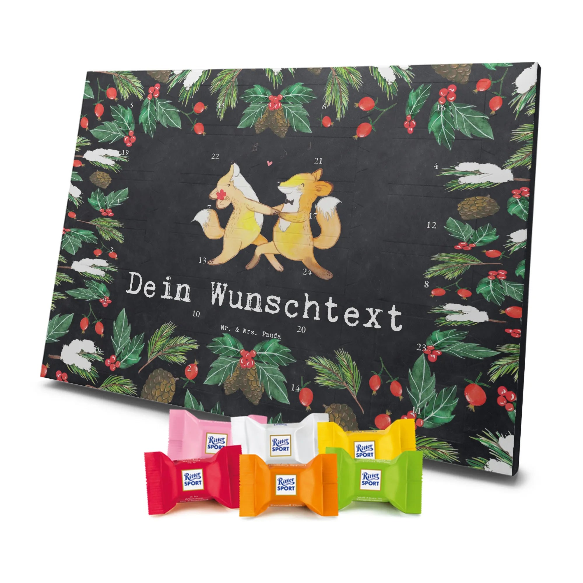 Suchst du einen besonderen Adventskalender, der persönlich und hochwertig ist? Unser Adventskalender mit Namen von Mr. & Mrs. Panda ist genau das – individualisierbar mit dem Namen deiner Liebsten oder einem kurzen Spruch und bedruckt mit unseren beliebten, charmanten Motiven. Die Druckqualität ist brillant, die seidenmatte Oberflächenveredelung verleiht dem Kalender eine elegante Haptik. Auch die Seitenflächen sind liebevoll bedruckt, sodass das Design rundum überzeugt. Du kannst den Kalender aufstellen oder an einer Stelle aufhängen, die du magst – die besondere Form macht beides möglich. Gefüllt ist der Kalender mit Ritter Sport Schokowürfeln in sechs beliebten Sorten: Mousse au Chocolat, Schoko Crisp, Voll-Nuss in Nougatcreme, Karamell Duo, Joghurt und Erdbeer-Joghurt. So gibt es hinter jedem Türchen eine kleine, leckere Überraschung. Maße: 325 mm x 225 mm x 27 mm – kompakt genug, um überall Platz zu finden, groß genug für 24 sorgfältig verpackte Schokowürfel.
