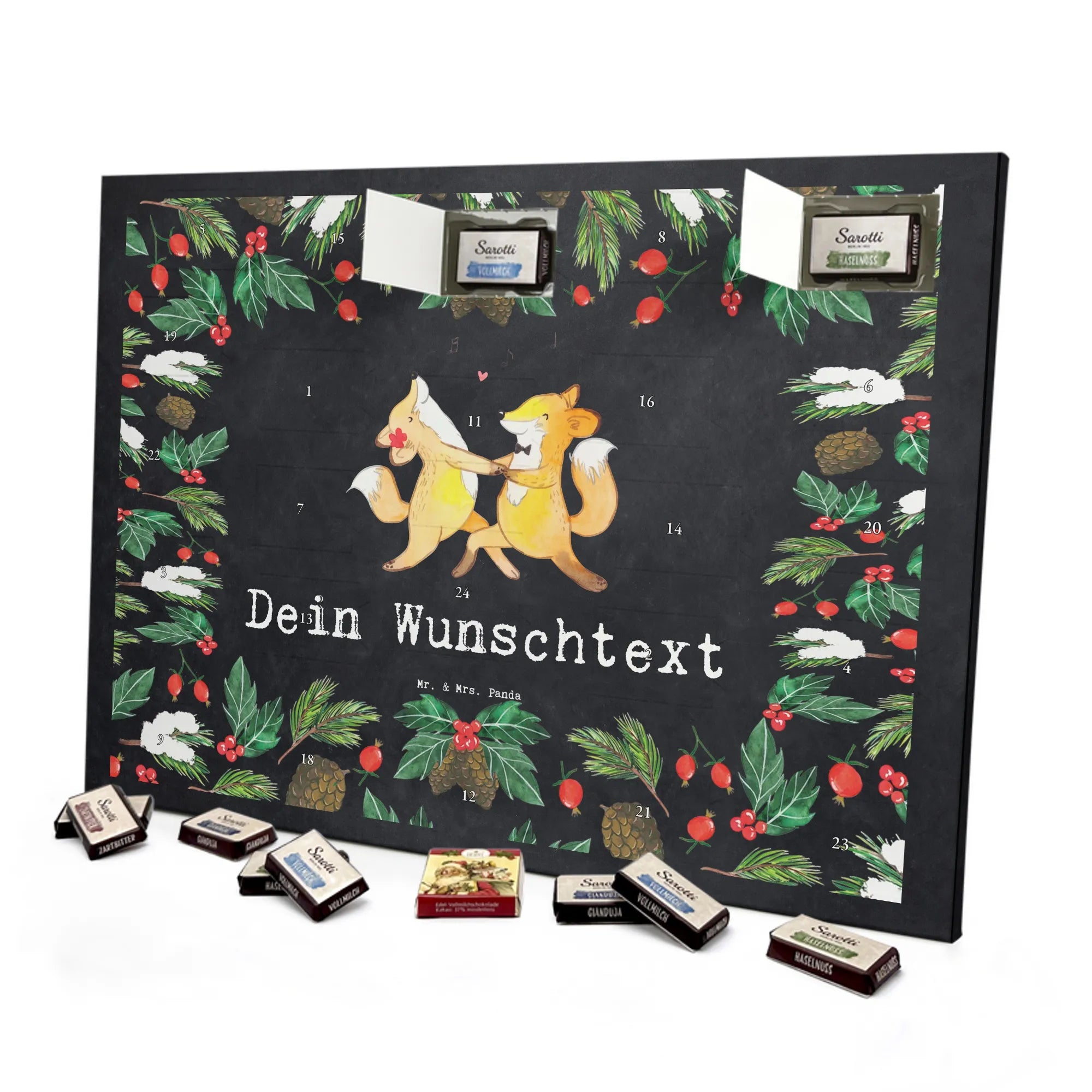 Der perfekte Adventskalender für individuelle Geschenkideen: Adventskalender mit Namen von Mr. & Mrs. Panda. Dieser Kalender ist mit liebevollen Motiven und frechen Sprüchen bedruckt und kann mit deinem Wunschtext oder Namen personalisiert werden – so wird jedes Türchen zur persönlichen Überraschung. Die brillante Druckqualität und die seidenmatte Oberflächenveredelung geben dem Kalender ein hochwertiges Aussehen, und die bedruckten Seitenflächen runden das Design ab. Maße: 355 mm x 245 mm x 11 mm. Du kannst den Kalender an die Wand hängen oder einfach aufstellen – praktisch und schön zugleich. Gefüllt ist er mit 24 einzeln verpackten Schokoladentäfelchen in vier köstlichen Geschmacksrichtungen. Insgesamt enthält er 107 g Markenschokolade von Sarotti® und Confiserie Heidel® in den Sorten Vollmilch, Nougat, Zartbitter und Haselnuss. Hinweis: Es handelt sich um einen Kalender gefüllt mit Sarotti® und Confiserie Heidel® Markenschokolade. Ob als liebevolles Geschenk für Kinder, Partner oder Freundinnen und Freunde – dieser Adventskalender sorgt für tägliche Vorfreude und süße Genussmomente.