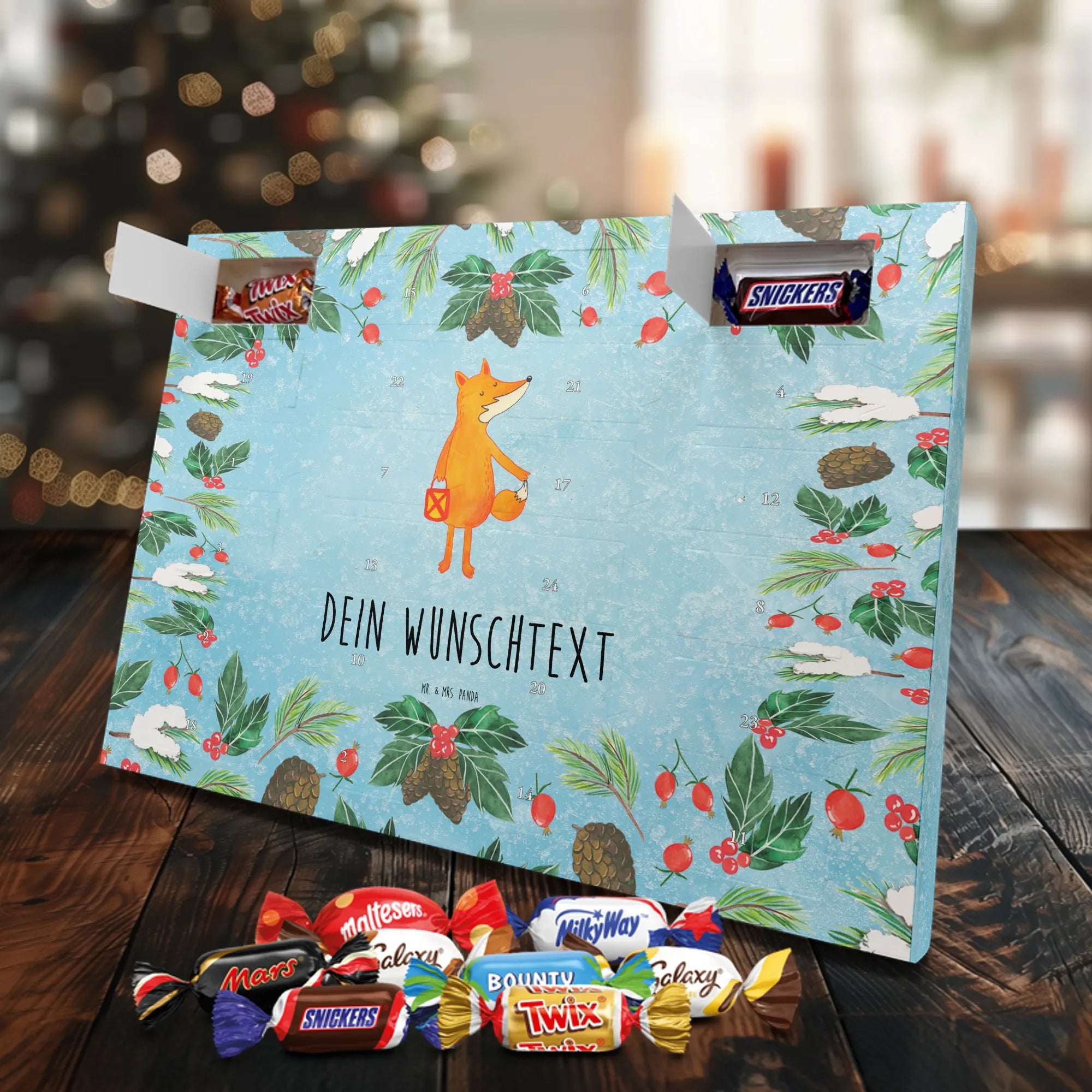 Mach die Adventszeit persönlich mit unserem Personalisierter Adventskalender mit Schokolade von Mr. & Mrs. Panda. Jeder Kalender ist liebevoll illustriert und bedruckt mit charmanten Sprüchen und Motiven – perfekt als Geschenk oder Deko für dein Zuhause. Du kannst deinen Wunschname oder einen kurzen Text hinzufügen, damit der Kalender ganz individuell wird. Die brillante Druckqualität und die seidenmatte Oberflächenveredelung sorgen für eine edle Optik, und auch die Seitenflächen sind komplett bedruckt. Maße: 233 mm x 178 mm x 24 mm. Die clevere Konstruktion erlaubt es, den Kalender aufzuhängen oder aufzustellen – flexibel und dekorativ zugleich. Gefüllt mit MARKENNAMEN Schokolade sowie köstlichen Schokoladenkugeln ist jeder Tag im Advent eine süße Überraschung. Wichtiger Hinweis: (Kann Spuren von Haselnüssen, Mandeln, Gluten und Soja enthalten!), kühl und trocken lagern! Egal ob für Kinder, Partner oder beste Freundin – dieser personalisierte Adventskalender bringt ein Lächeln und zaubert gemütliche Vorfreude. Bestell jetzt und gestalte deine Adventszeit mit einem Hauch Mr. & Mrs. Panda.