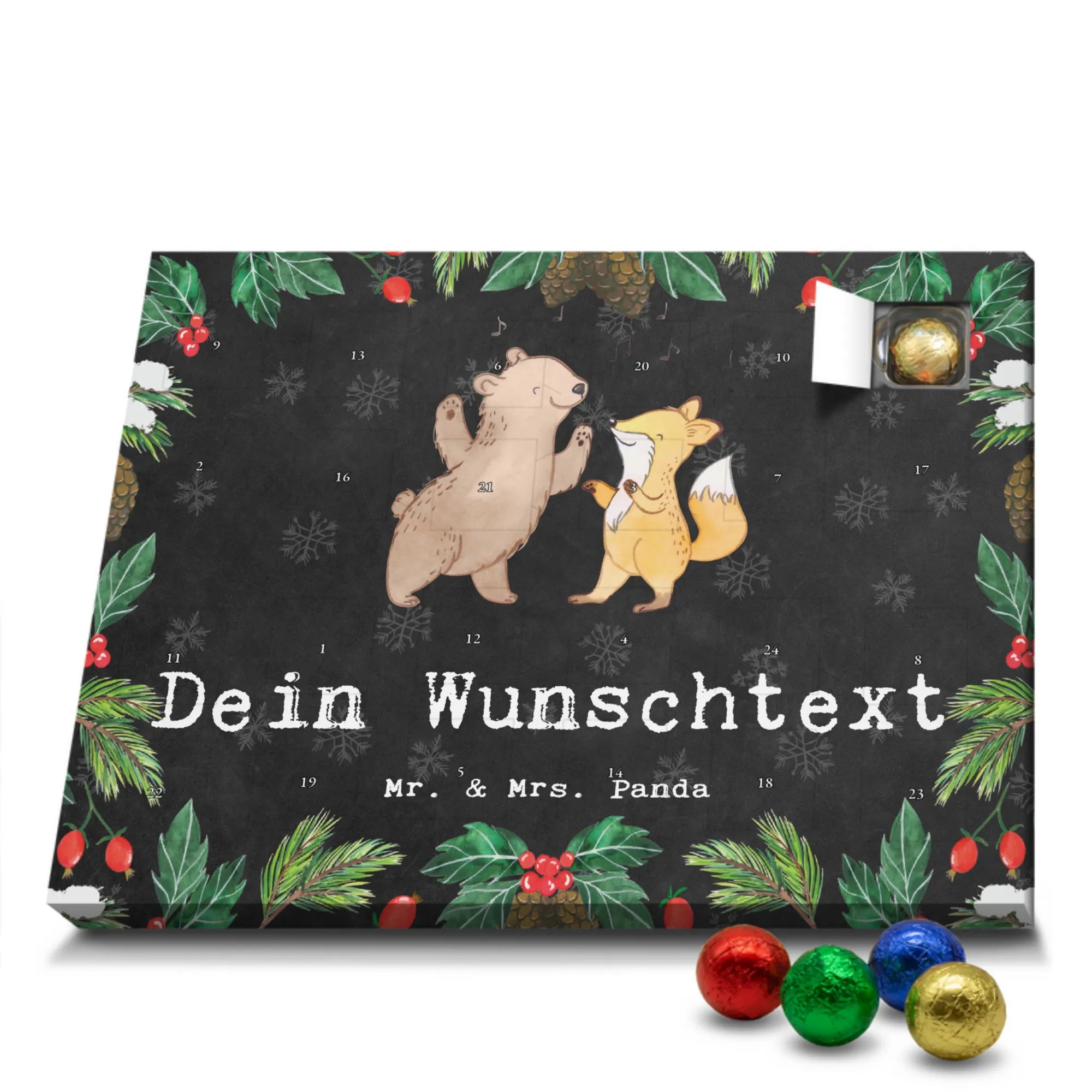 Mach Advent magisch: Gestalte jetzt deinen personalisierten Schoko Adventskalender und überrasche deine Liebsten mit einem individuellen Geschenk von Mr. & Mrs. Panda!
