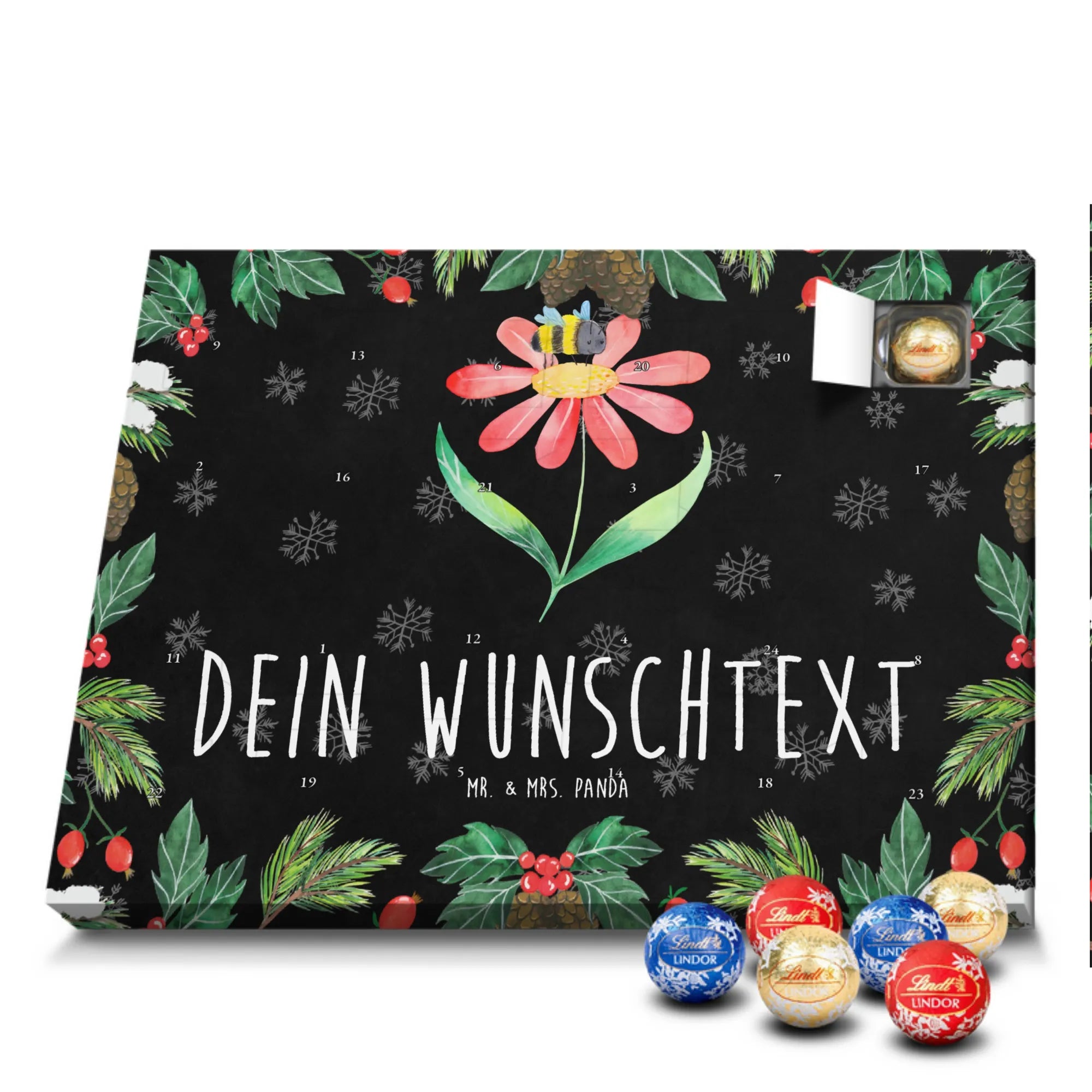 Personalisierter Schoko Adventskalender von Mr. & Mrs. Panda – der süße Countdown für dich oder deine Liebsten! Unser liebevoll gestalteter Adventskalender ist bedruckt mit wunderschönen Motiven und fröhlichen Sprüchen von Mr. & Mrs. Panda und lässt sich mit deinem Wunschnamen oder Wunschtext personalisieren. Die brillante Druckqualität kombiniert mit einer seidenmatten Oberflächenveredelung sorgt für ein edles Finish, zusätzlich sind die Seitenflächen bedruckt für ein durchgängiges Design. Maße: 233 mm x 178 mm x 24 mm. Der Kalender ist besonders praktisch: du kannst ihn entweder aufstellen oder an der Wand aufhängen – so passt er überall hin und verbreitet vorweihnachtliche Stimmung. Gefüllt mit Lindt Lindor Schokolade: 24 einzeln verpackte Markenschokoladen Kugeln in drei verschiedenen Sorten. Geschmacksrichtungen: Vollmilch, Feinherb und Weiße Schokolade. Zutaten: Zucker, pflanzliches Fett (Kokosnuss, Palmkern), Kakaobutter, Vollmilchpulver, Kakaomasse, Milchzucker, Magermilchpulver, Butterreinfett, Emulgator (Sojalecithin), Gerstenmalzextrakt, Aromen. Besondere Hinweise: Kann Haselnüsse und Mandeln enthalten. Dieser Adventskalender ist das perfekte Geschenk für Familien, Paare, Freunde oder für dich selbst – ein kleines tägliches Verwöhnmoment im Dezember. Bestell jetzt deinen personalisierten Schoko Adventskalender und zaubere ein Lächeln unter den Tannenbaum!
