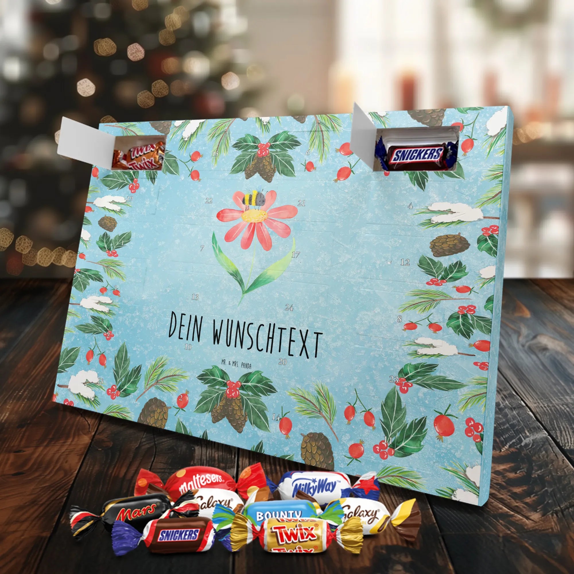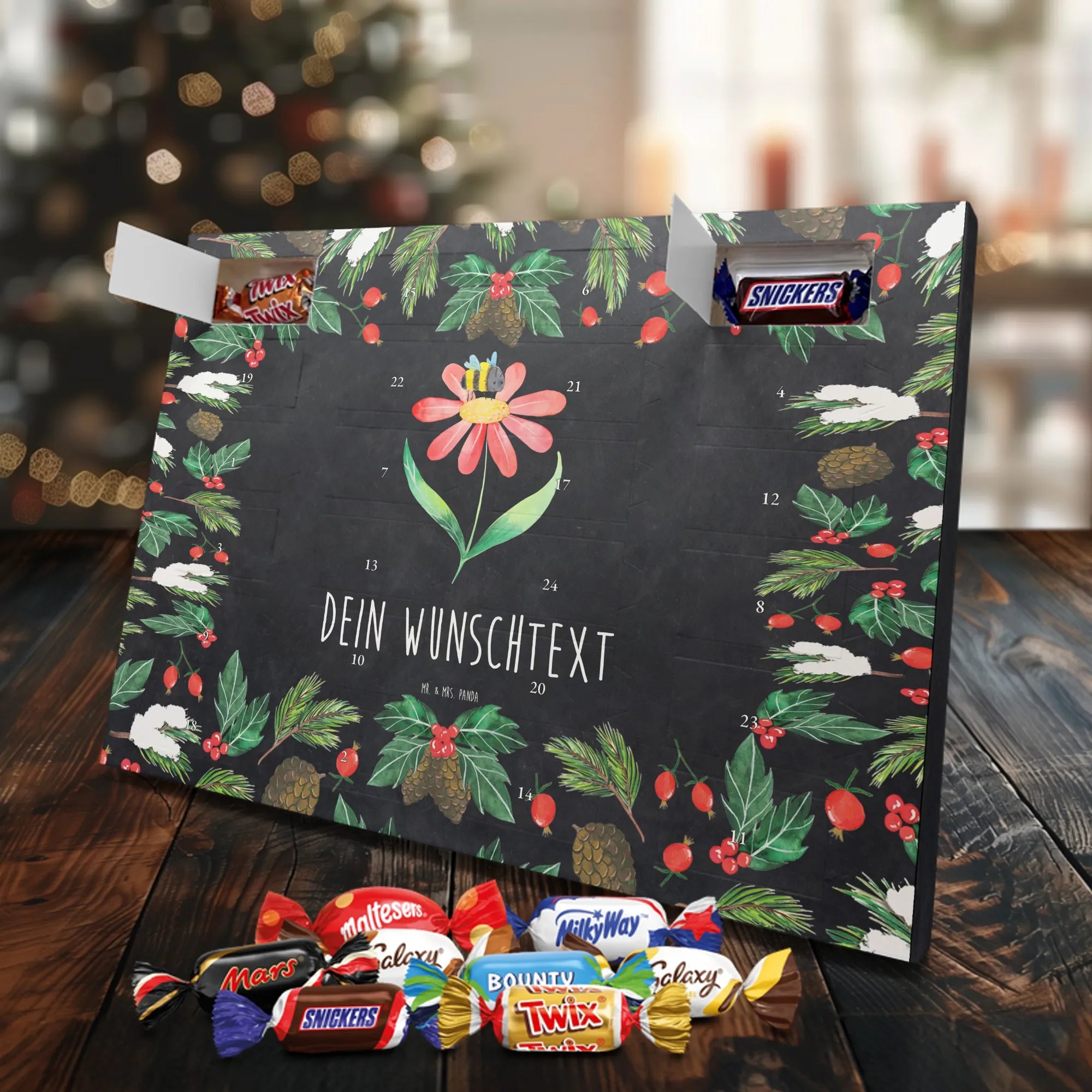 Adventskalender mit deinem Namen – individuell, süß und mit ganz viel Mr. & Mrs. Panda Charme! Dieser personalisierbare Schoko Adventskalender wird mit liebevollen Motiven & frechen Sprüchen bedruckt und lässt sich mit deinem Wunschnamen oder Wunschtext individualisieren. Durch die brillante Druckqualität und die seidenmatte Oberflächenveredelung wirken die Farben besonders intensiv und hochwertig. Auch die Seitenflächen sind bedruckt, sodass das Gesamtbild stimmig ist. Du hast die Wahl: Häng den Kalender auf oder stell ihn auf – beides funktioniert super. Der Kalender ist gefüllt mit Celebrations und enthält 24 hochwertige Füllungen in 8 verschiedenen Sorten, darunter Maltesers, Mars, Snickers, Twix, Milky Way, Bounty, Galaxy und Galaxy Caramel, die dir jeden Tag im Dezember ein Lächeln schenken. Maße: 325 mm x 225 mm x 27 mm – ideal dimensioniert für schöne Türchen-Überraschungen. Verschenke persönliche Vorfreude an Freunde, Familie oder gönn dir selbst diese zuckersüße Adventsüberraschung von Mr. & Mrs. Panda.