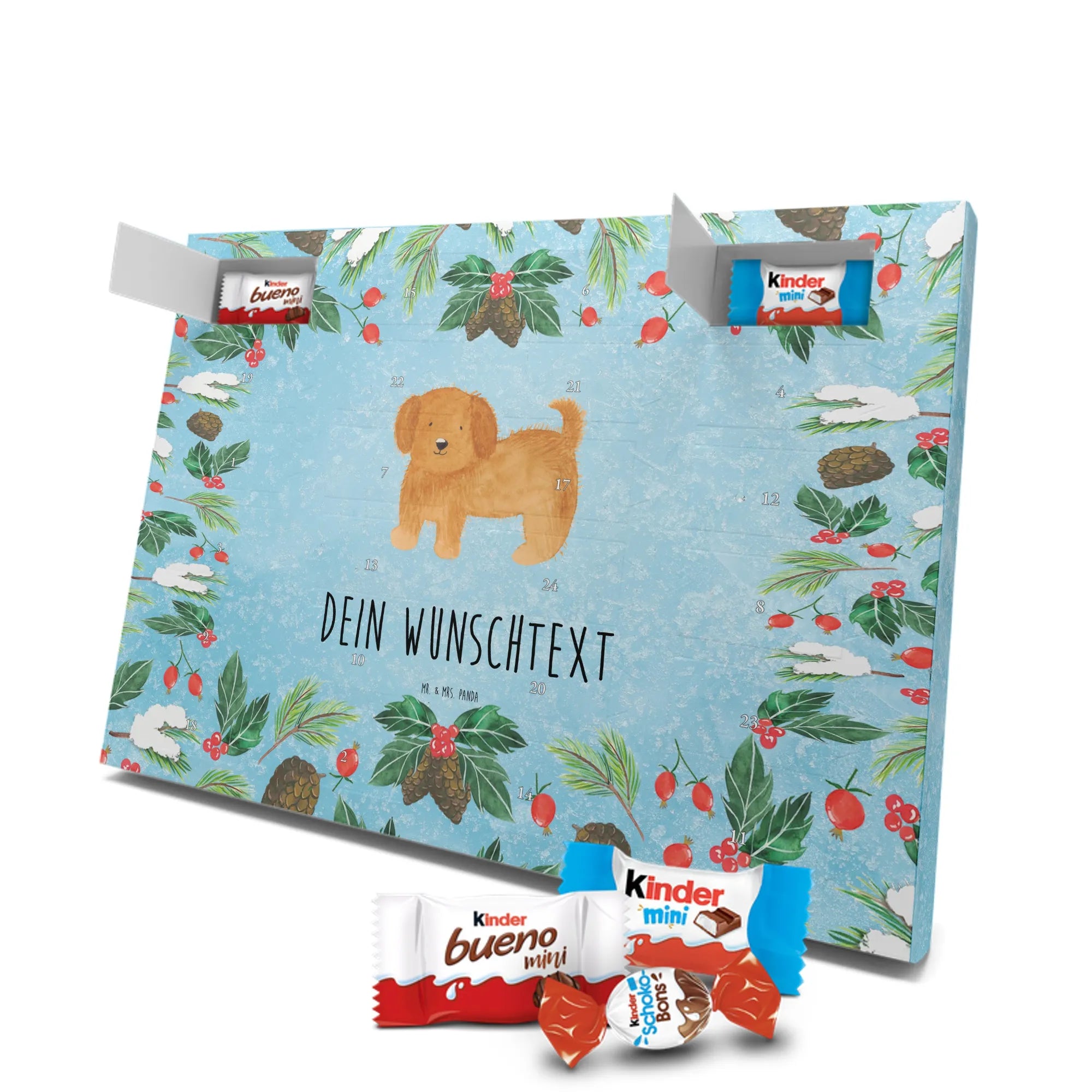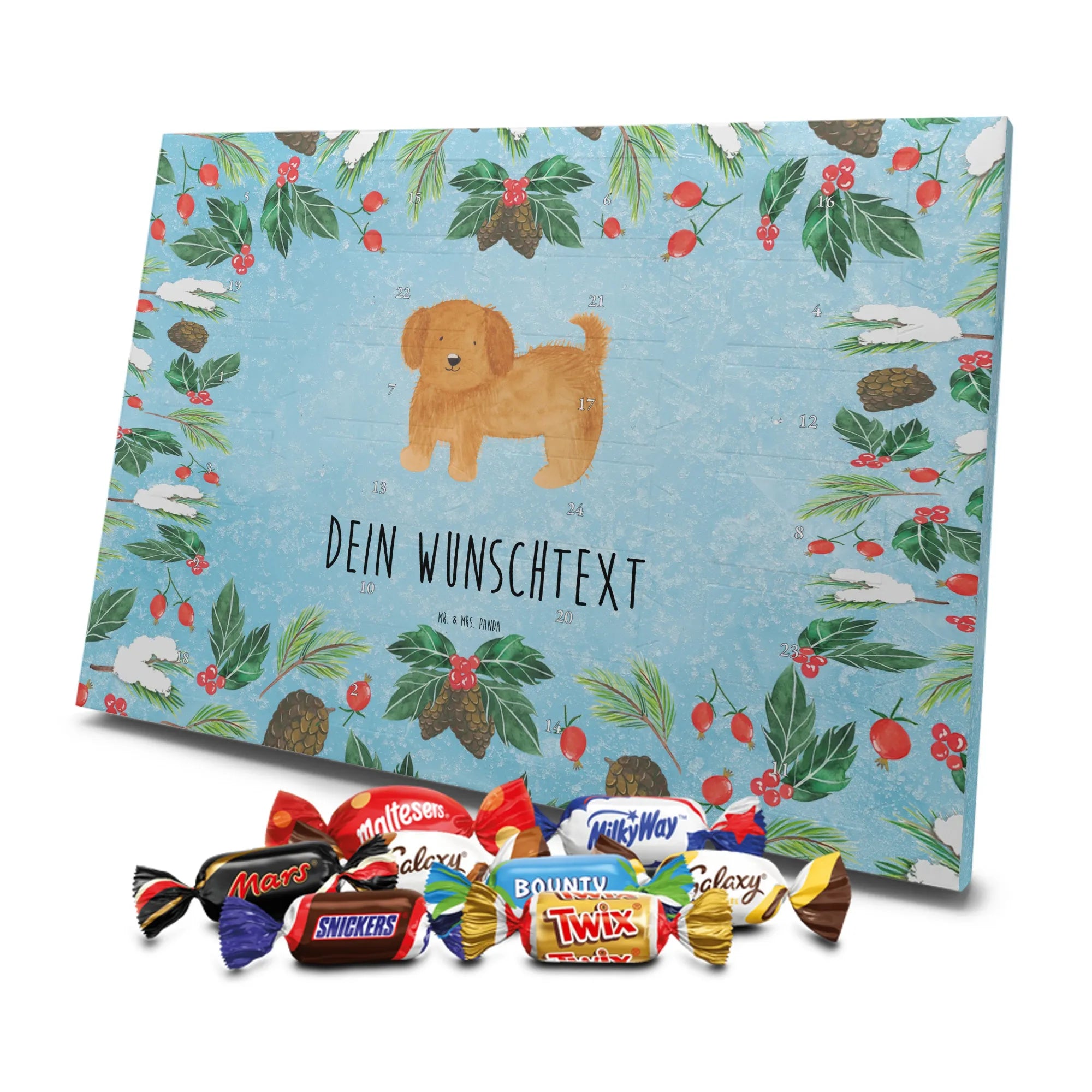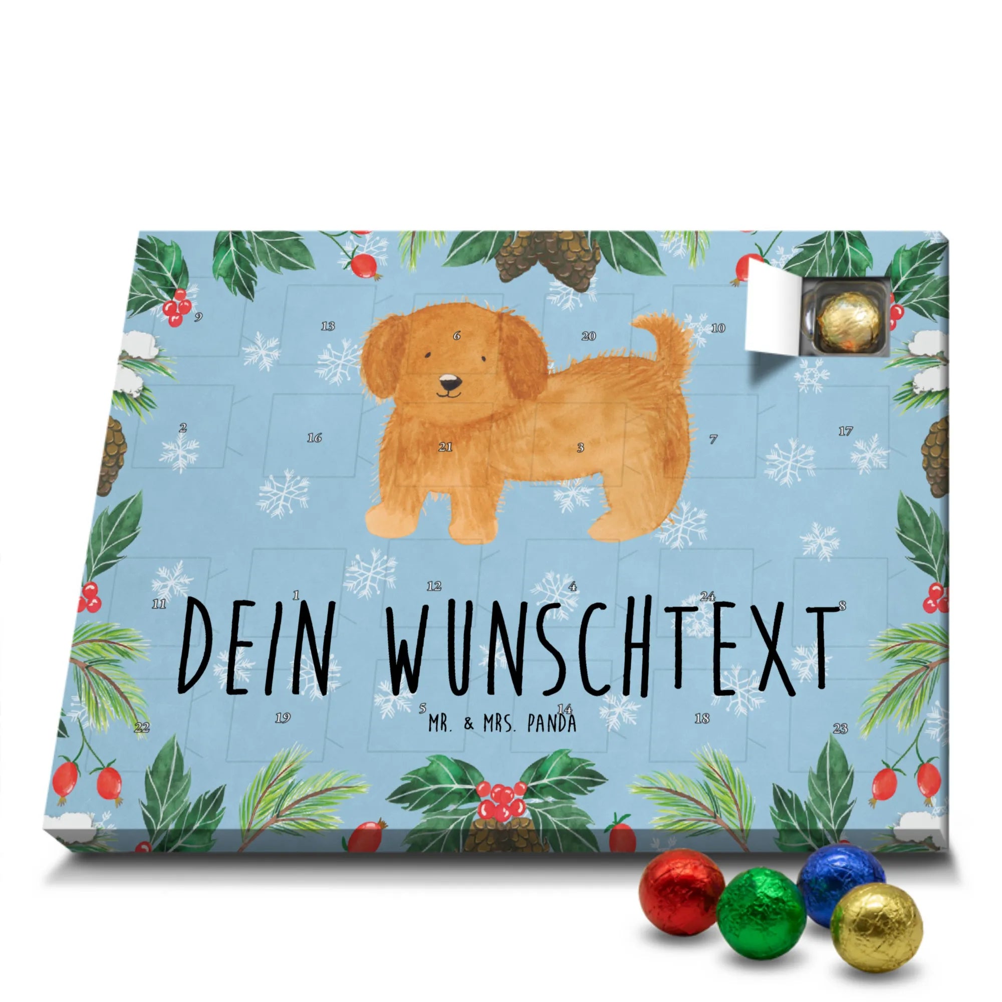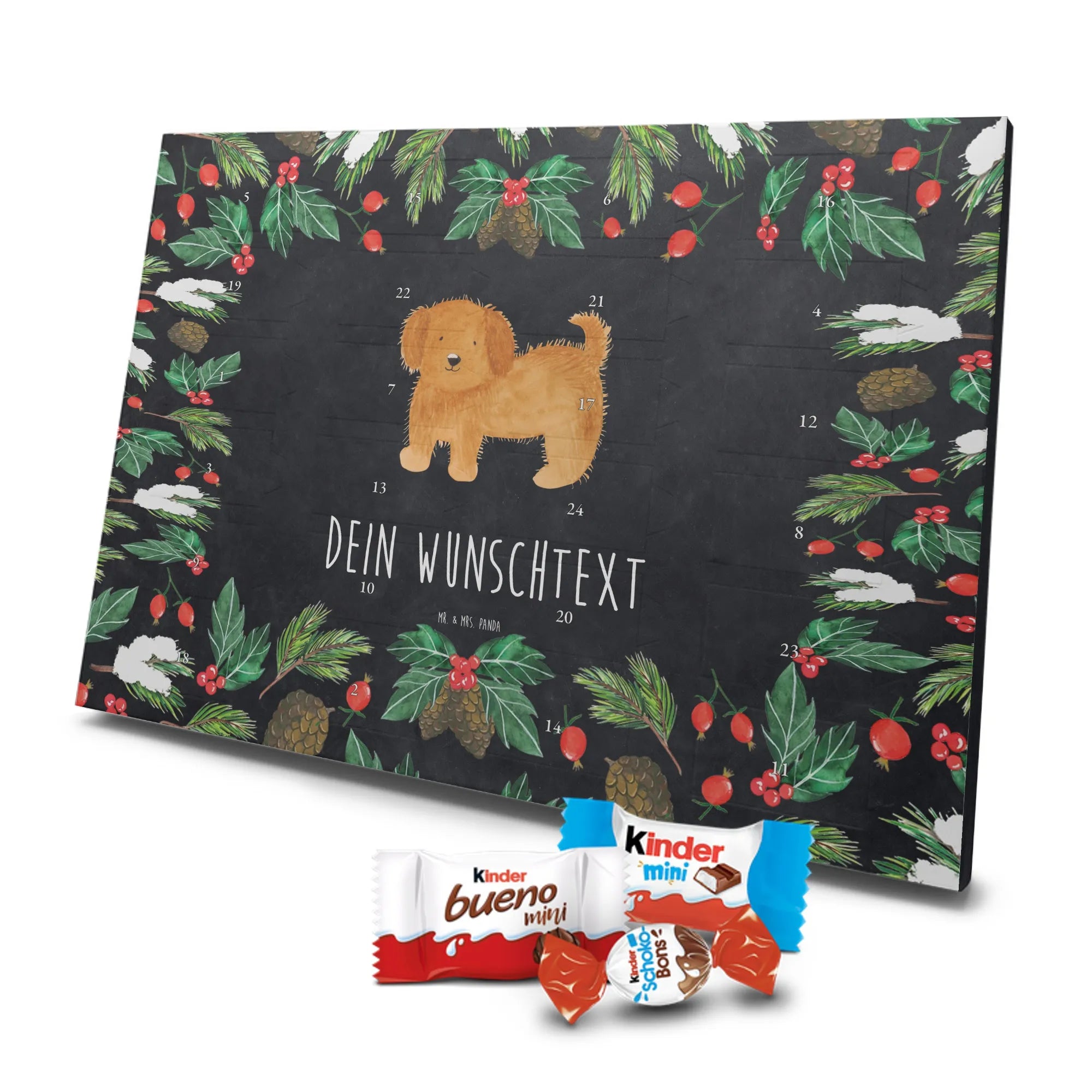 Du suchst einen besonderen Adventskalender? Unser Personalisierter Schoko-Adventskalender von Mr. & Mrs. Panda ist perfekt für dich! Er ist liebevoll gestaltet, mit vielen süßen Motiven und kurzen Sprüchen bedruckt und lässt sich ganz individuell mit deinem Wunschnamen oder einem Wunschtext personalisieren. Die hochwertige Bedruckung erhält durch eine seidenmatte Veredelung einen edlen Look, und auch die Seitenflächen sind komplett bedruckt – so wirkt der Kalender von vorne bis hinten durchgestylt. Maße: 233 mm x 178 mm x 24 mm. Eine tolle Besonderheit: Du kannst ihn aufstellen oder an die Wand hängen, je nachdem, wo er bei dir am besten zur Geltung kommt. Gefüllt ist der Kalender mit MARKENNAMEN Schokolade sowie leckeren Schokoladenkugeln für echte Genießer. Bitte beachten: (Kann Spuren von Haselnüssen, Mandeln, Gluten und Soja enthalten!), kühl und trocken lagern! Ob als Geschenk für Freunde oder als personalisierte Überraschung für dich selbst – dieser Kalender bringt Freude und süße Momente in die Vorweihnachtszeit. Hol ihn dir und gestalte deinen Advent mit persönlicher Note und liebevollen Panda-Motiven.