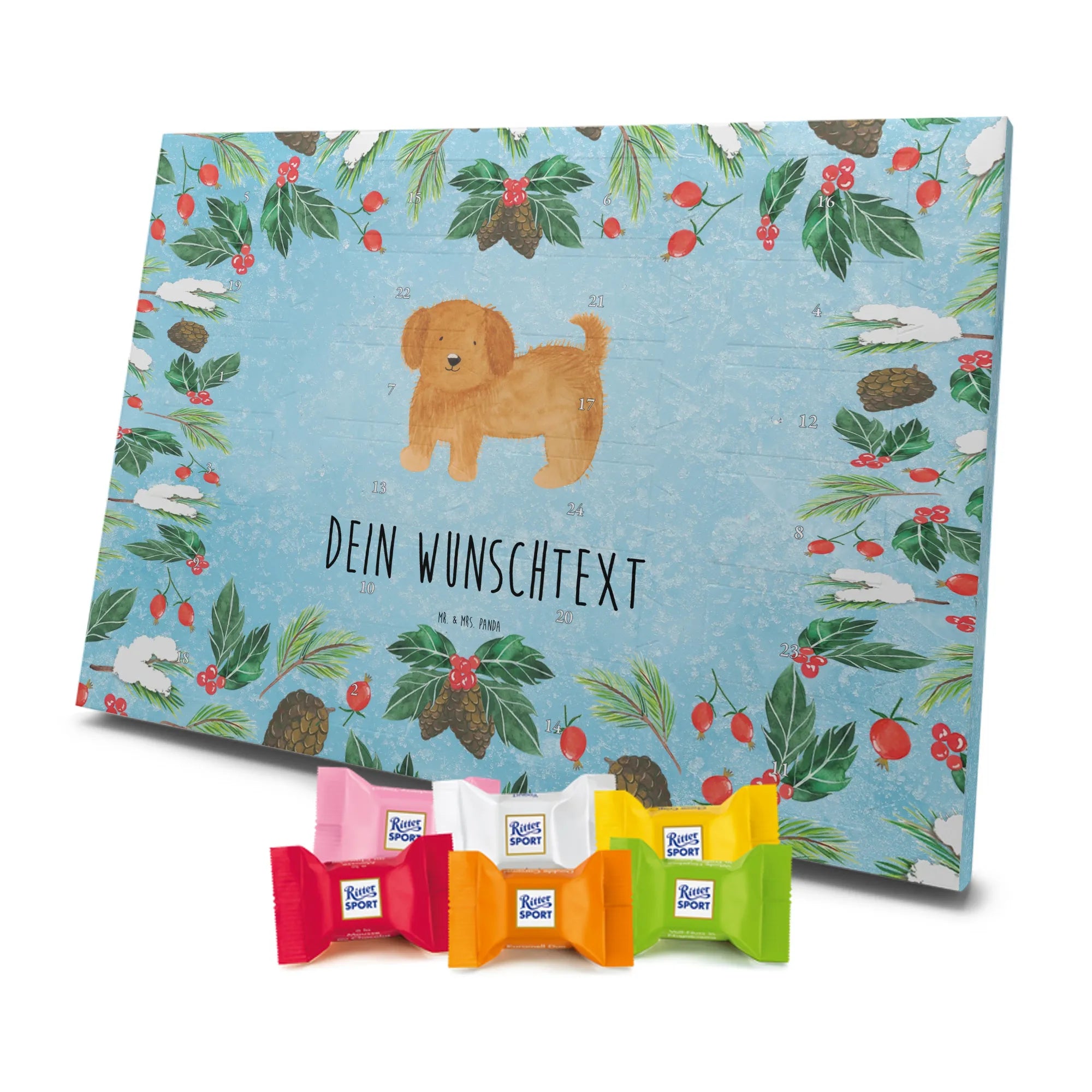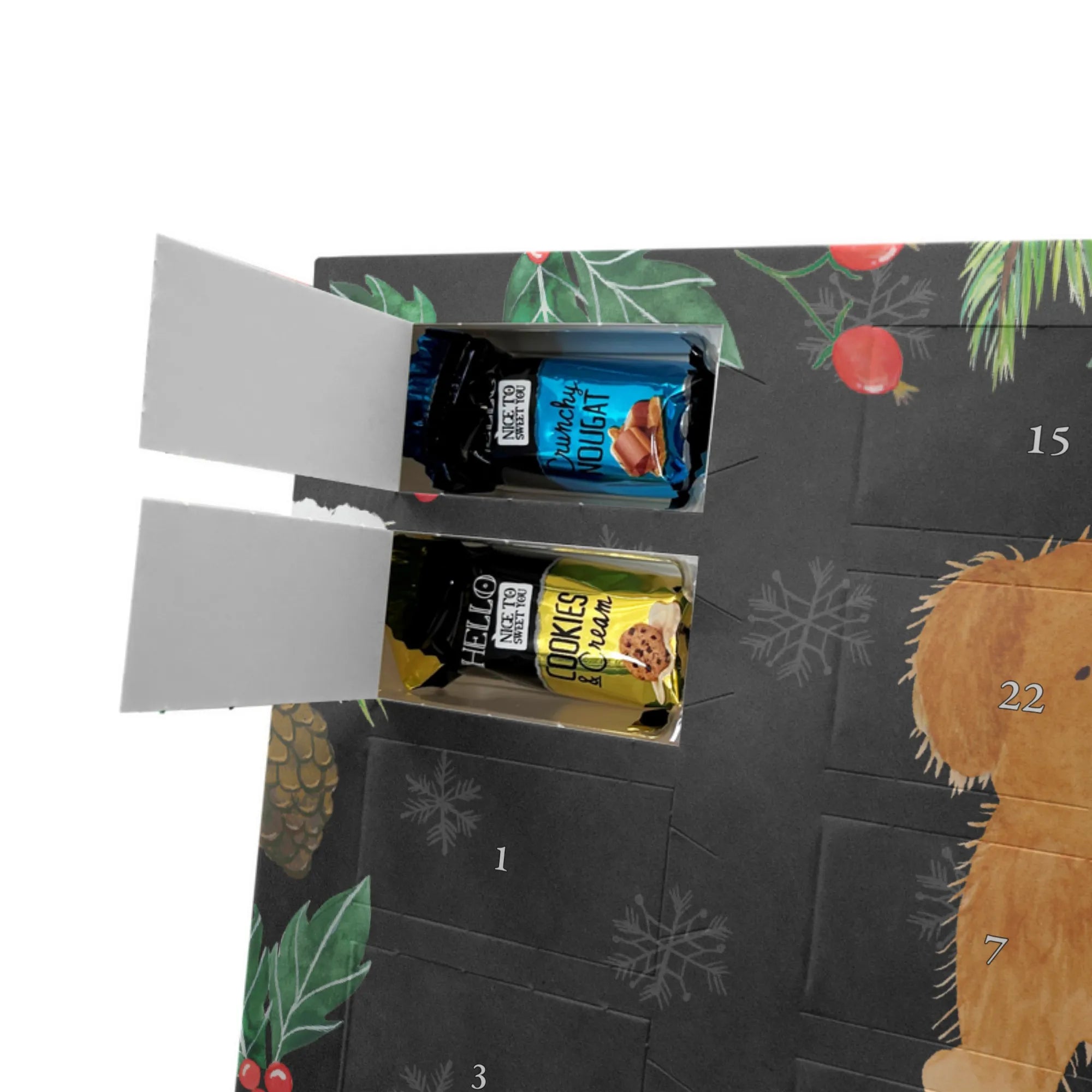 Klein, fein und persönlich: dieser Adventskalender ist unser liebevoll gestalteter Adventskalender mit Namen von Mr. & Mrs. Panda. Du bestimmst den Namen oder kurzen Text, wir drucken ihn auf den Kalender – zusammen mit unseren warmherzigen Illustrationen und Sprüchen. Die brillante Druckqualität und die seidenmatte Oberflächenveredelung sorgen dafür, dass dein Design hervorragend zur Geltung kommt. Bedruckte Seitenflächen runden das Gesamtbild ab. Der Kalender kann entweder aufgehängt oder aufgestellt werden, je nachdem, wie du ihn präsentieren möchtest. Gefüllt ist er mit Ritter Sport Schokowürfeln in sechs köstlichen Sorten: Mousse au Chocolat, Schoko Crisp, Voll-Nuss in Nougatcreme, Karamell Duo, Joghurt und Erdbeer-Joghurt – ideal, um jeden Adventstag mit einer kleinen Sünde zu versüßen. Maße: 325 mm x 225 mm x 27 mm – praktisch und dekorativ zugleich. Perfekt als Geschenk für Freunde, Familie oder Kollegen, die sich über eine personalisierte Überraschung freuen.