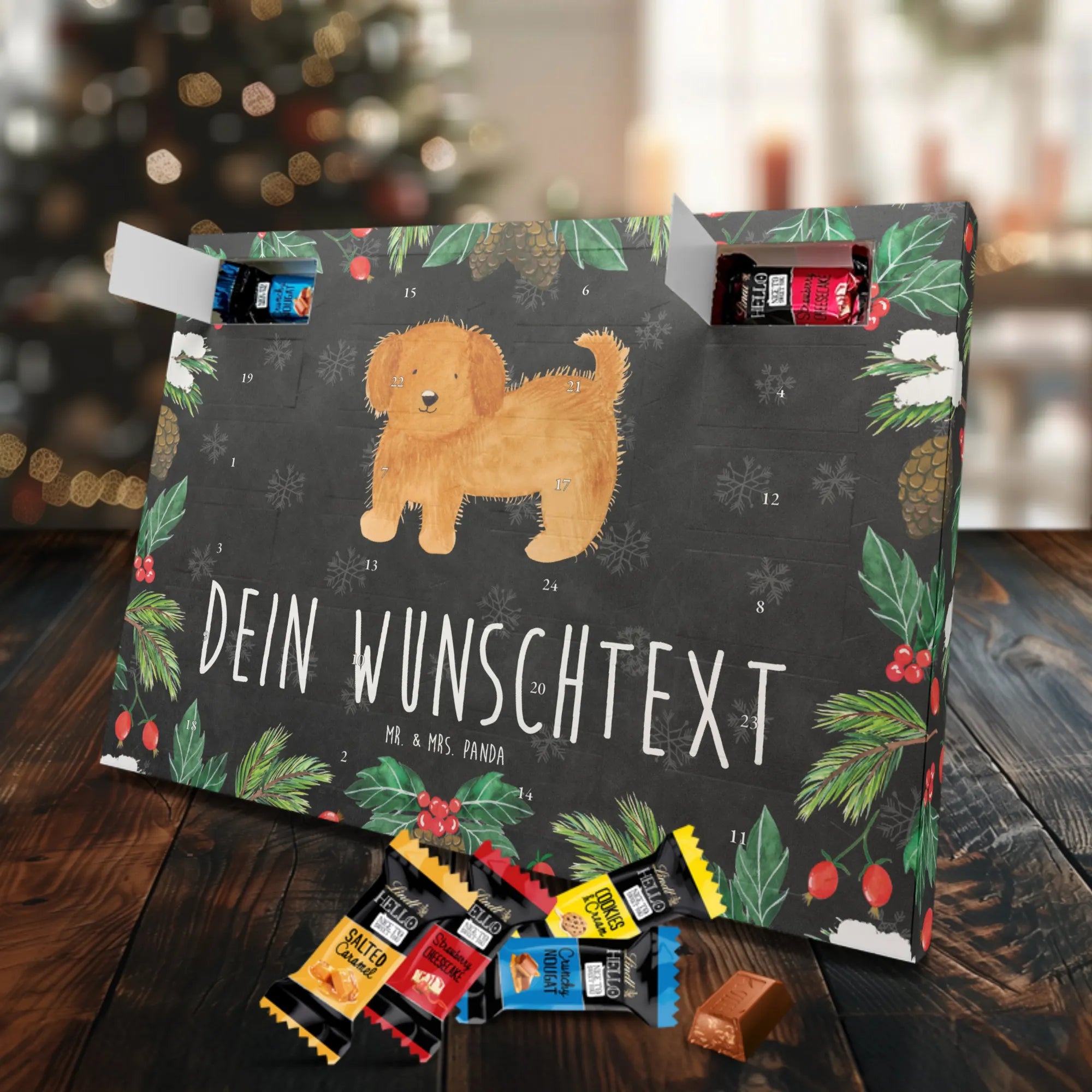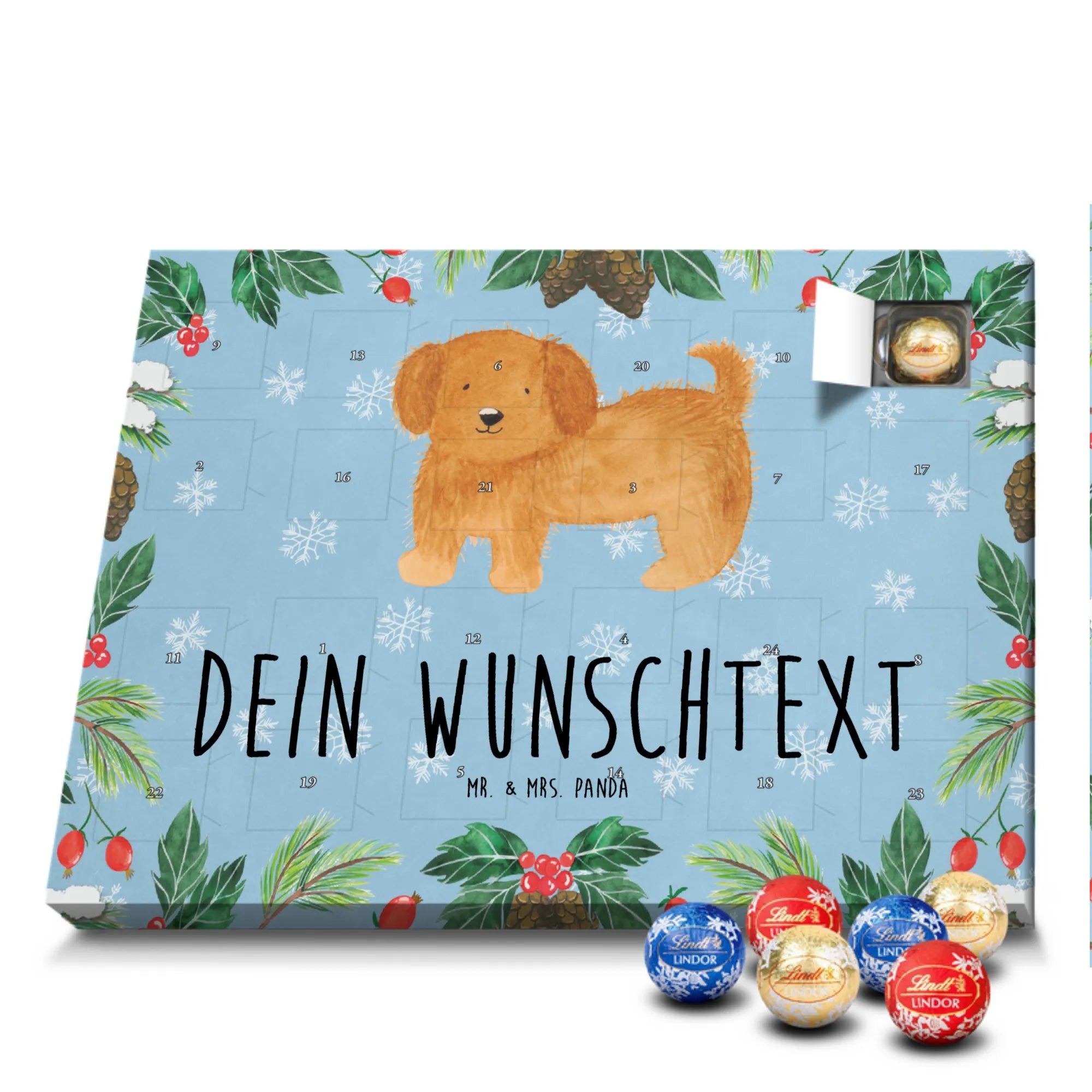 Personalisierter Schoko Adventskalender von Mr. & Mrs. Panda – der süße Countdown für dich oder deine Liebsten! Unser liebevoll gestalteter Adventskalender ist bedruckt mit wunderschönen Motiven und fröhlichen Sprüchen von Mr. & Mrs. Panda und lässt sich mit deinem Wunschnamen oder Wunschtext personalisieren. Die brillante Druckqualität kombiniert mit einer seidenmatten Oberflächenveredelung sorgt für ein edles Finish, zusätzlich sind die Seitenflächen bedruckt für ein durchgängiges Design. Maße: 233 mm x 178 mm x 24 mm. Der Kalender ist besonders praktisch: du kannst ihn entweder aufstellen oder an der Wand aufhängen – so passt er überall hin und verbreitet vorweihnachtliche Stimmung. Gefüllt mit Lindt Lindor Schokolade: 24 einzeln verpackte Markenschokoladen Kugeln in drei verschiedenen Sorten. Geschmacksrichtungen: Vollmilch, Feinherb und Weiße Schokolade. Zutaten: Zucker, pflanzliches Fett (Kokosnuss, Palmkern), Kakaobutter, Vollmilchpulver, Kakaomasse, Milchzucker, Magermilchpulver, Butterreinfett, Emulgator (Sojalecithin), Gerstenmalzextrakt, Aromen. Besondere Hinweise: Kann Haselnüsse und Mandeln enthalten. Dieser Adventskalender ist das perfekte Geschenk für Familien, Paare, Freunde oder für dich selbst – ein kleines tägliches Verwöhnmoment im Dezember. Bestell jetzt deinen personalisierten Schoko Adventskalender und zaubere ein Lächeln unter den Tannenbaum!