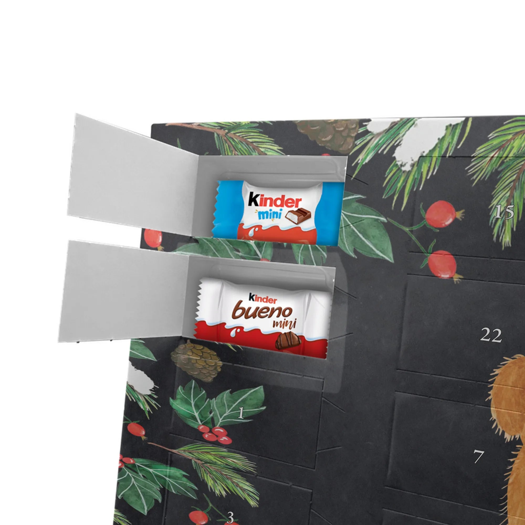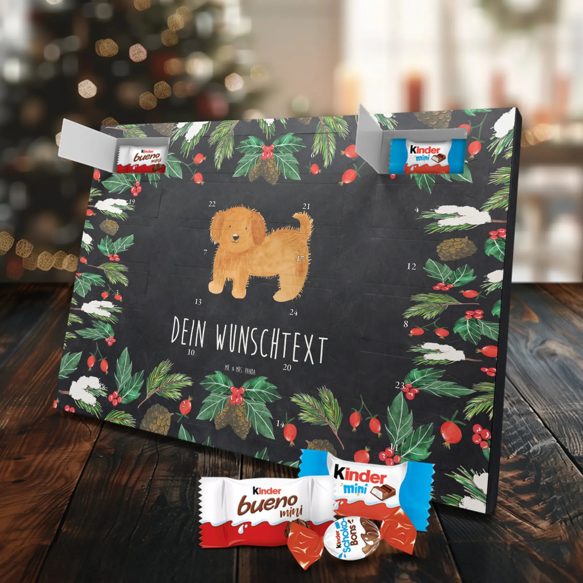 Fröhlich, persönlich und süß – unser Personalisierter Schoko Adventskalender von Mr. & Mrs. Panda bringt Wärme in die Adventszeit. Der Kalender ist liebevoll bedruckt mit wunderschönen Motiven & Sprüchen von Mr. & Mrs. Panda und lässt sich mit deinem Wunschnamen oder Wunschtext personalisieren, sodass jedes Türchen eine kleine, persönliche Überraschung wird. Die brillante Druckqualität in Kombination mit seidenmatter Oberflächenveredelung verleiht dem Kalender eine hochwertige Haptik. Auch die Seitenflächen sind bedruckt, damit dein Geschenk von allen Seiten überzeugt. Maße: 355 mm x 245 mm x 11 mm – praktisch und stilvoll. Besonderheit: kann aufgehängt oder aufgestellt werden, perfekt für Fensterbank, Kommode oder als Dekoration an der Wand. Gefüllt mit kinder® Schokolade: Adventskalender gefüllt mit kinder® Schokolade; Inhalt: kinder® Schoko-Bons, kinder® Bueno mini und kinder® Schokolade mini. Ob als Geschenk für die Liebsten oder als süße Belohnung für dich selbst – dieser Adventskalender verbindet tolles Design mit leckerem Inhalt und persönlicher Note.