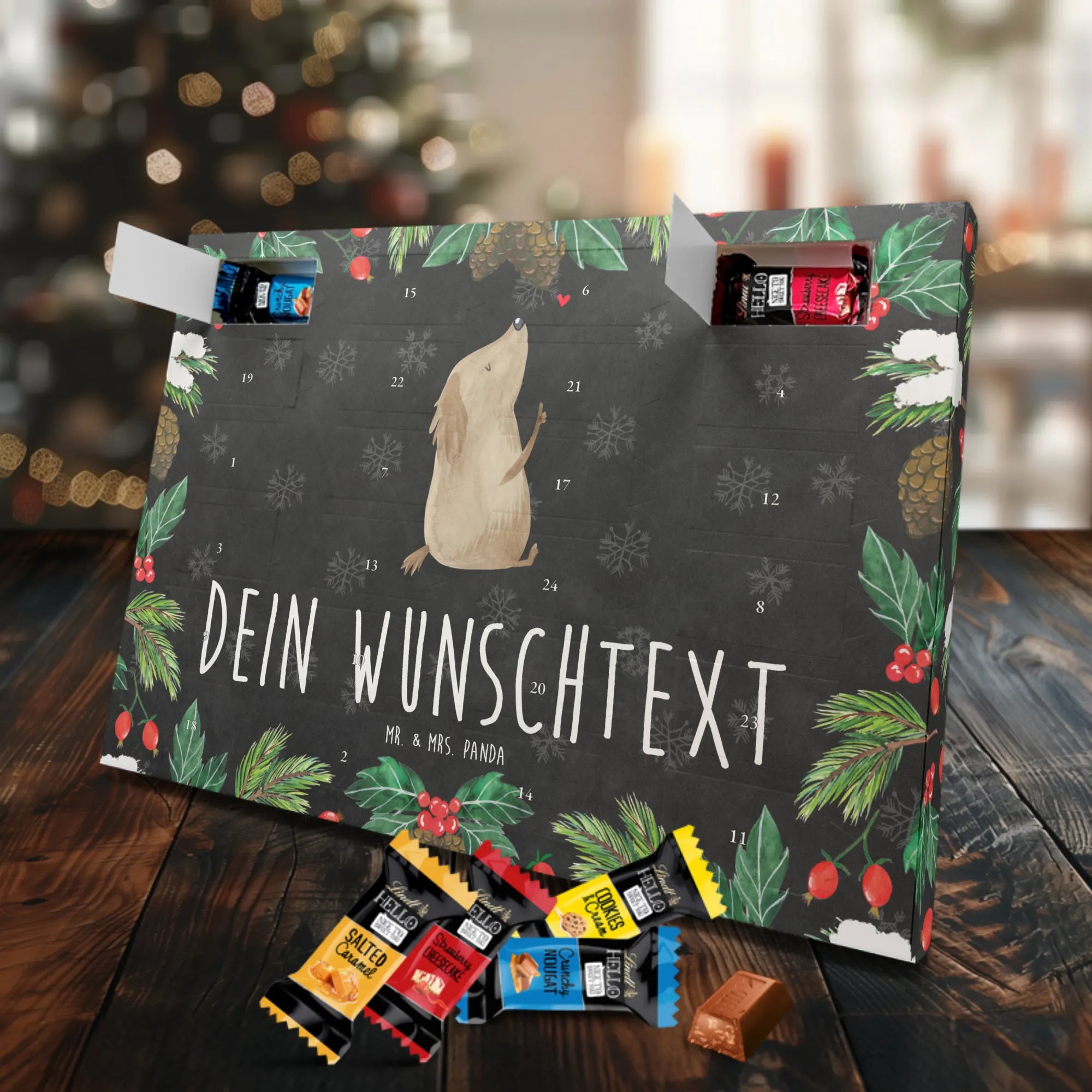 Personalisierter Adventskalender mit Schokolade – das Geschenk, das von Herzen kommt. Mr. & Mrs. Panda haben für dich einen Adventskalender gestaltet, der nicht nur mit süßen Überraschungen gefüllt ist, sondern auch optisch überzeugt: bedruckte Seitenflächen, charmante Motive und Sprüche sowie eine seidenmatte Oberflächenveredelung für edles Finish. Du kannst den Kalender mit deinem Wunschnamen oder Wunschtext personalisieren – ideal als Geschenk für die beste Freundin, Familie oder Kinder. Er kann aufgehängt oder einfach aufgestellt werden, je nachdem, wie du ihn präsentieren möchtest. Gefüllt mit Lindt Hello: 24 einzeln verpackte Schokoladen Mini Sticks in den Sorten Karamell-Schokoladenkuchen, Kekse, Knuspriger Nougat und Erdbeer-Cheesecake. Bitte beachte die Zutaten und Allergenhinweise (Milcheiweiß, Milchzucker, Soja, Weizen, Haselnüsse; kann Mandeln und andere Schalenfrüchte enthalten). Die brillante Druckqualität macht dein Design besonders lebendig. Maße: 325 mm x 225 mm x 27 mm – handliche Größe für jede Dekoration.