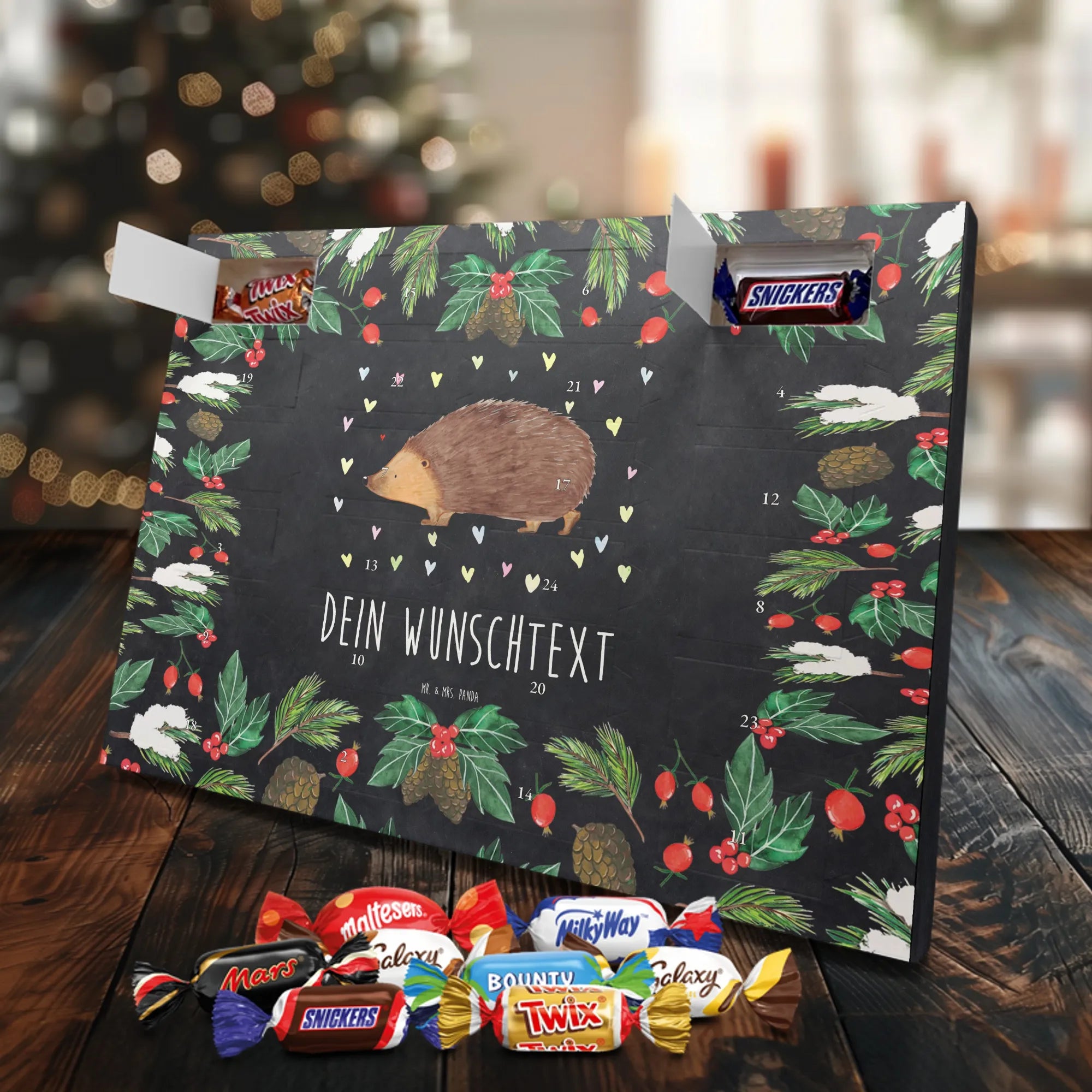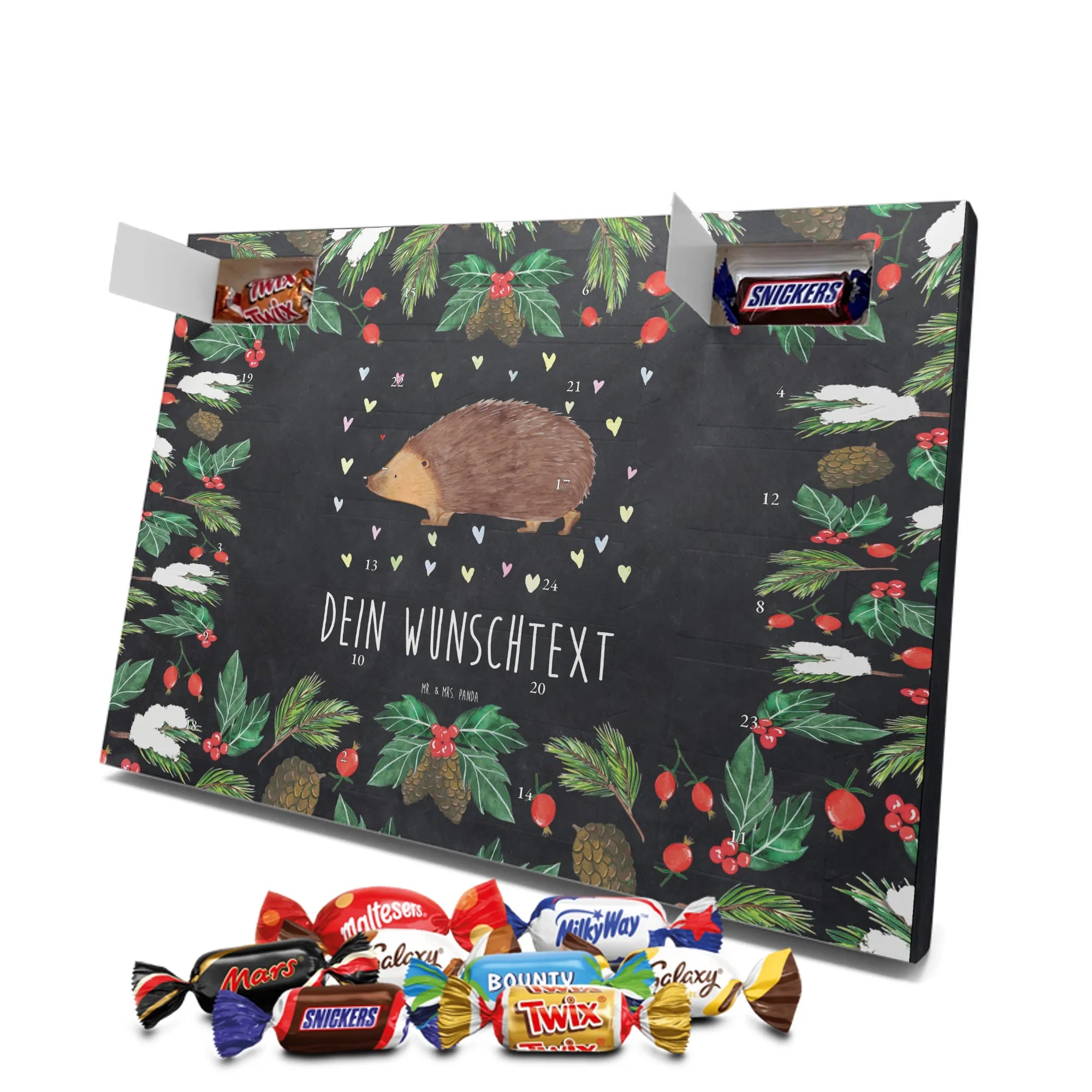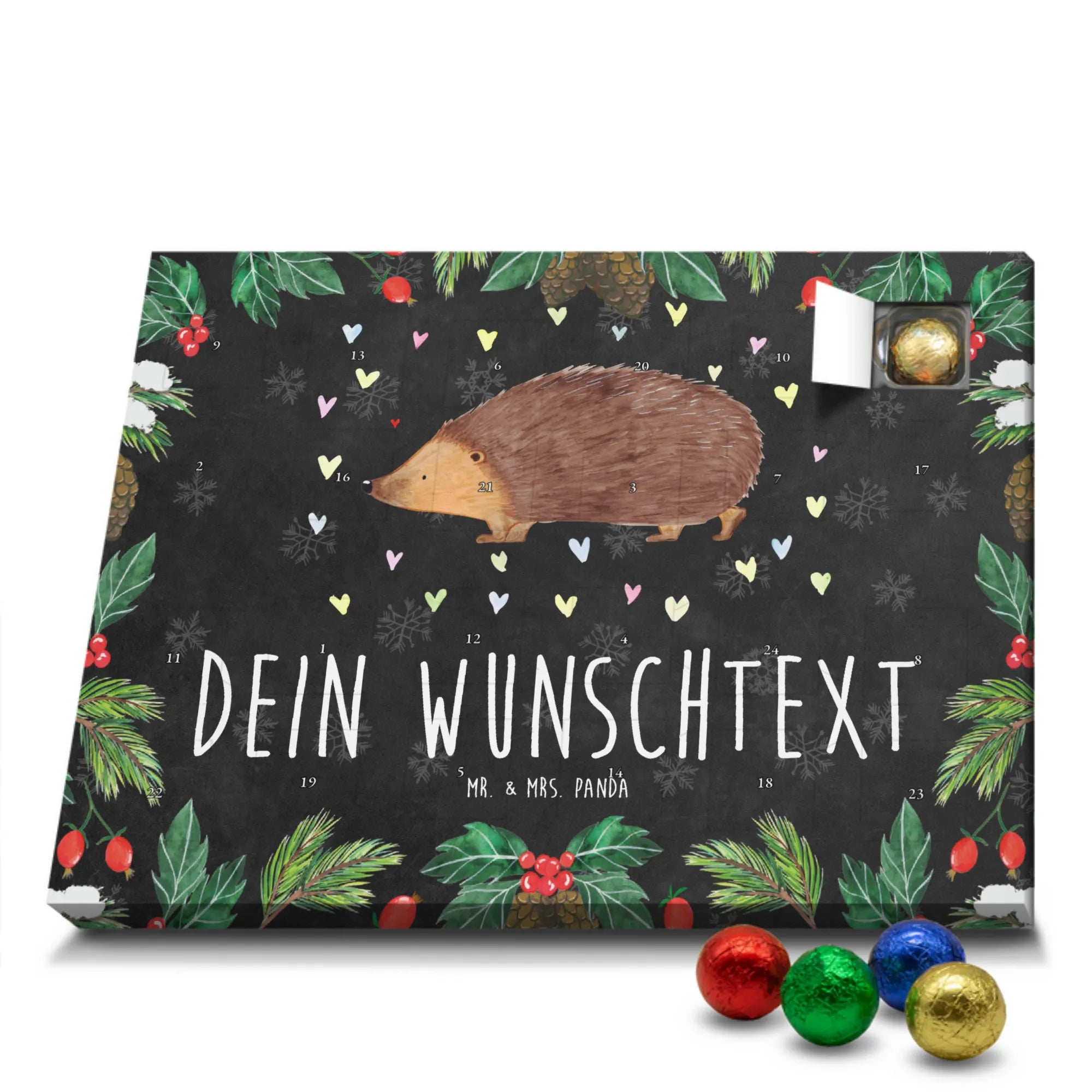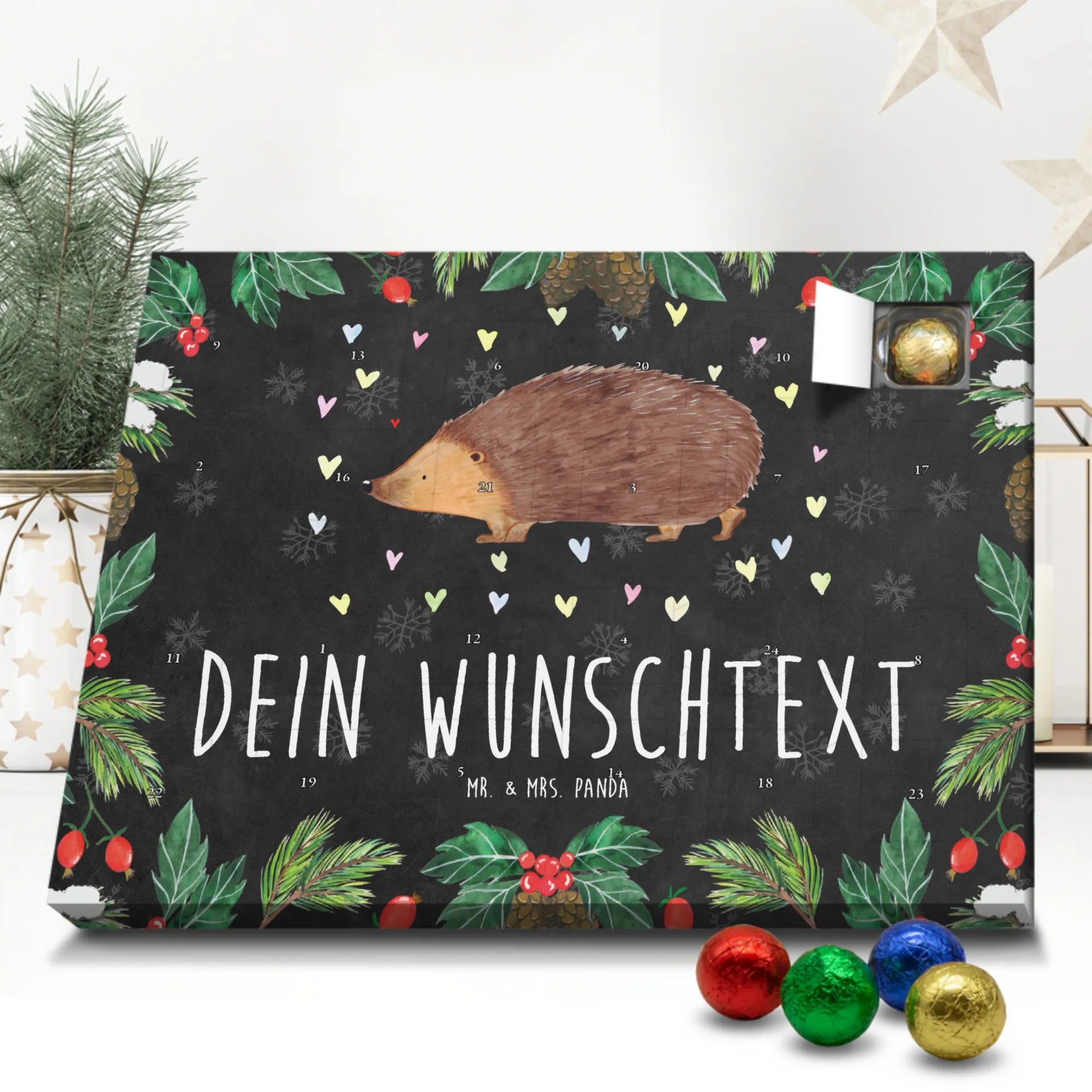 Mach die Adventszeit persönlich mit unserem Personalisierter Adventskalender mit Schokolade von Mr. & Mrs. Panda. Jeder Kalender ist liebevoll illustriert und bedruckt mit charmanten Sprüchen und Motiven – perfekt als Geschenk oder Deko für dein Zuhause. Du kannst deinen Wunschname oder einen kurzen Text hinzufügen, damit der Kalender ganz individuell wird. Die brillante Druckqualität und die seidenmatte Oberflächenveredelung sorgen für eine edle Optik, und auch die Seitenflächen sind komplett bedruckt. Maße: 233 mm x 178 mm x 24 mm. Die clevere Konstruktion erlaubt es, den Kalender aufzuhängen oder aufzustellen – flexibel und dekorativ zugleich. Gefüllt mit MARKENNAMEN Schokolade sowie köstlichen Schokoladenkugeln ist jeder Tag im Advent eine süße Überraschung. Wichtiger Hinweis: (Kann Spuren von Haselnüssen, Mandeln, Gluten und Soja enthalten!), kühl und trocken lagern! Egal ob für Kinder, Partner oder beste Freundin – dieser personalisierte Adventskalender bringt ein Lächeln und zaubert gemütliche Vorfreude. Bestell jetzt und gestalte deine Adventszeit mit einem Hauch Mr. & Mrs. Panda.