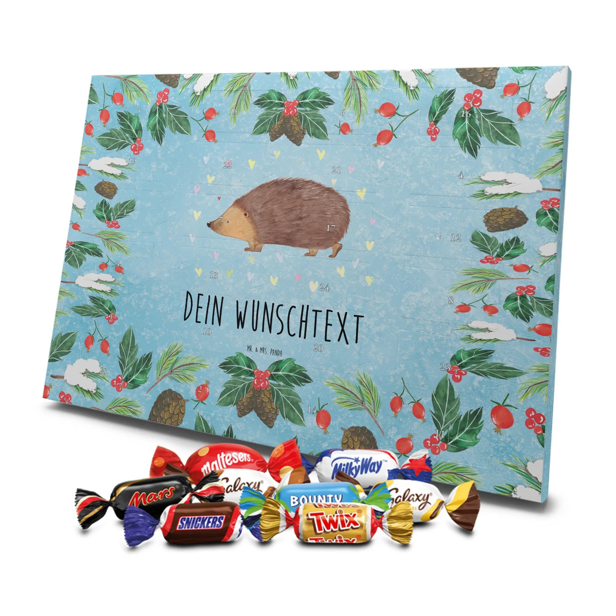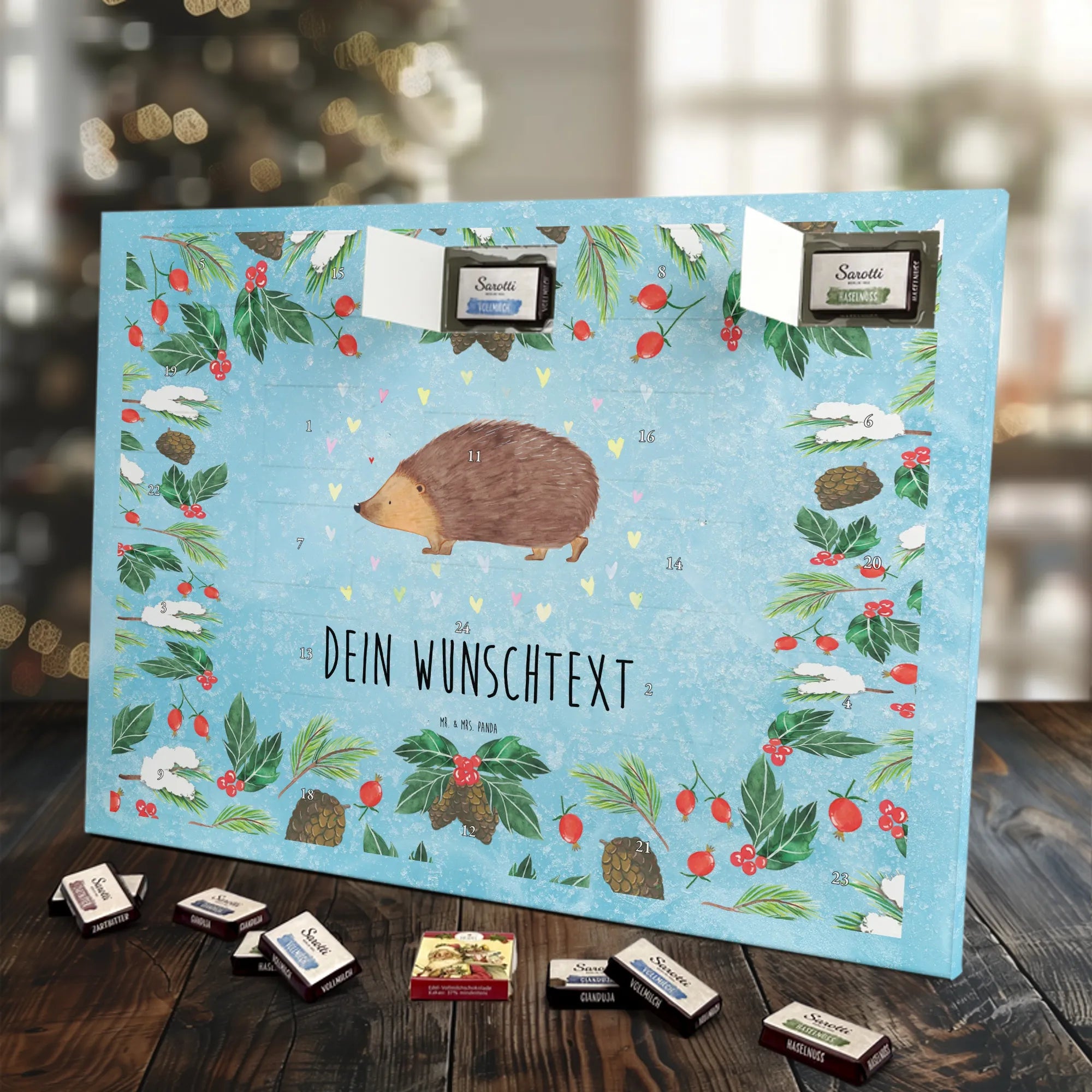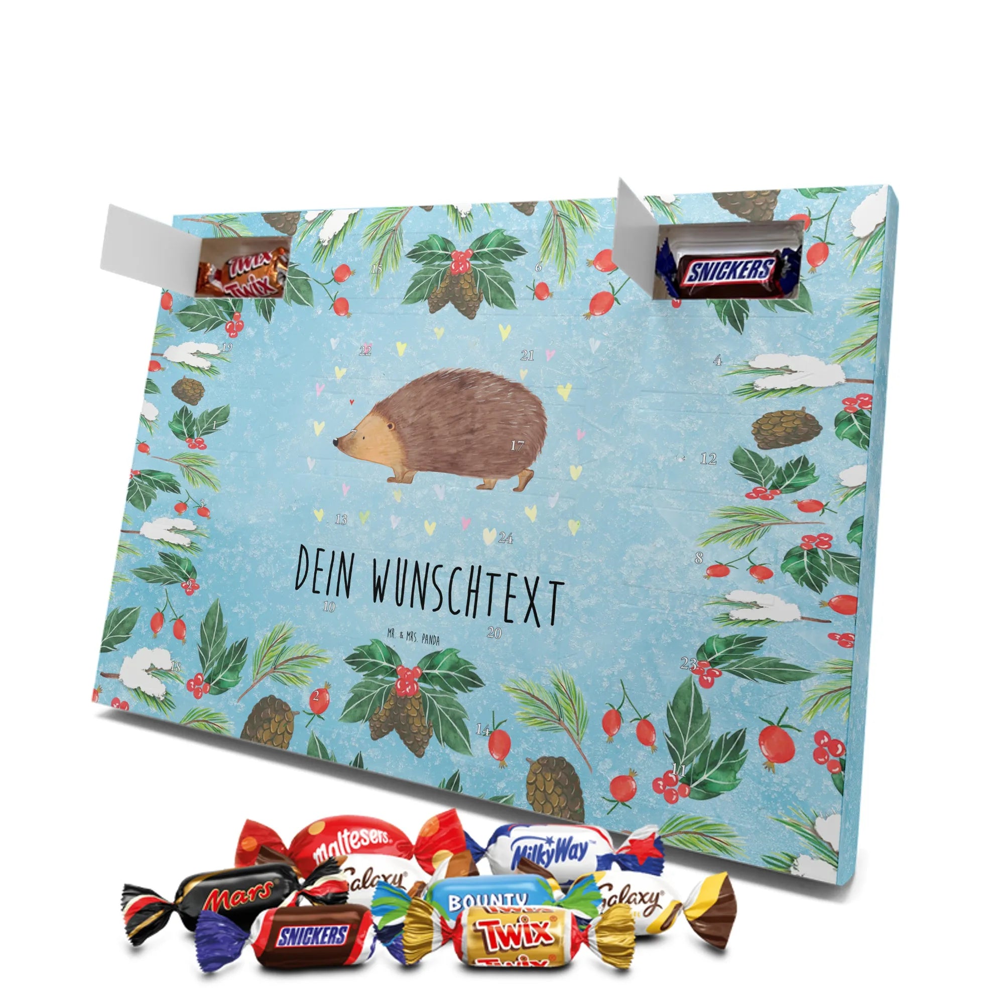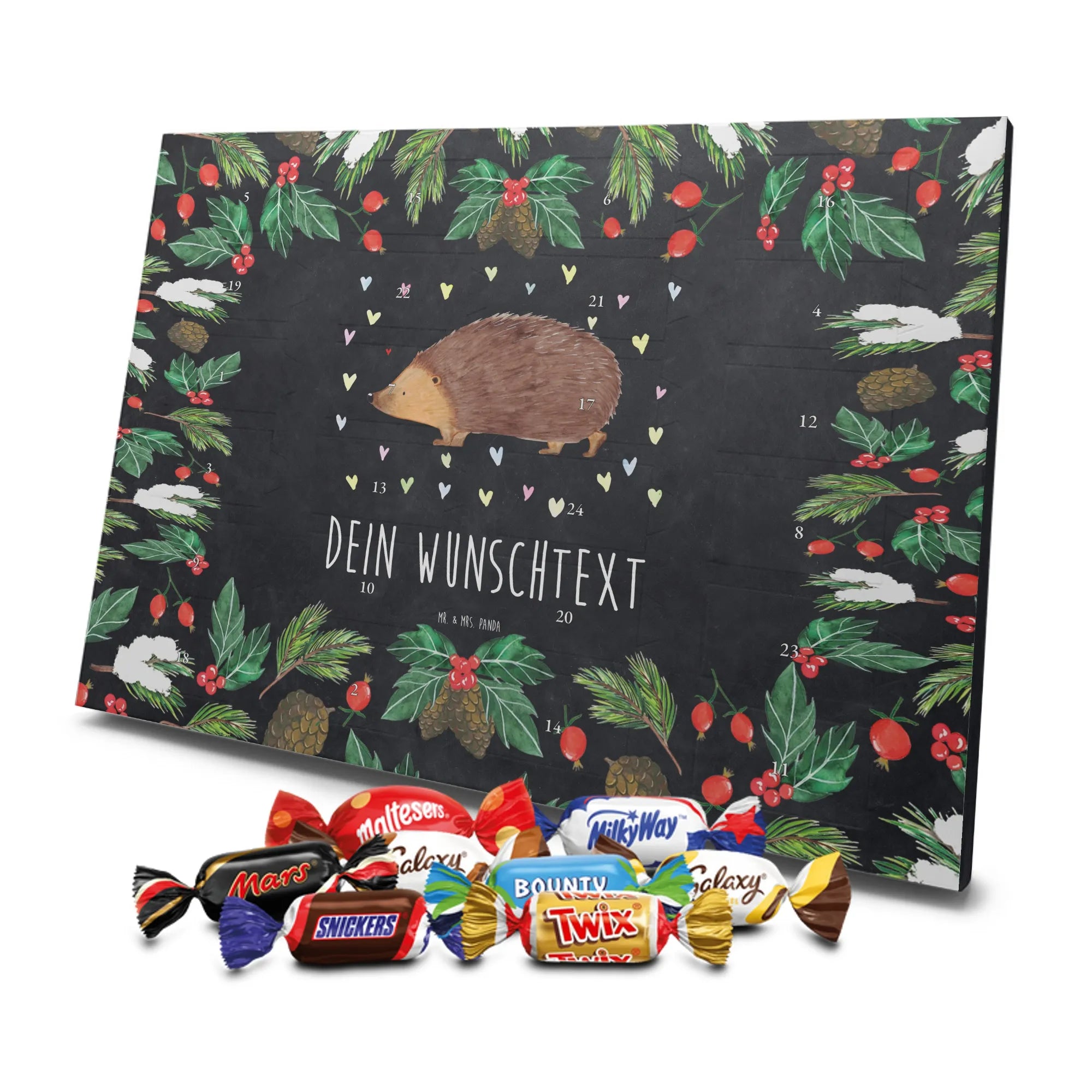 Mach die Adventszeit persönlich mit unserem Personalisierter Adventskalender mit Schokolade von Mr. & Mrs. Panda. Jeder Kalender ist liebevoll illustriert und bedruckt mit charmanten Sprüchen und Motiven – perfekt als Geschenk oder Deko für dein Zuhause. Du kannst deinen Wunschname oder einen kurzen Text hinzufügen, damit der Kalender ganz individuell wird. Die brillante Druckqualität und die seidenmatte Oberflächenveredelung sorgen für eine edle Optik, und auch die Seitenflächen sind komplett bedruckt. Maße: 233 mm x 178 mm x 24 mm. Die clevere Konstruktion erlaubt es, den Kalender aufzuhängen oder aufzustellen – flexibel und dekorativ zugleich. Gefüllt mit MARKENNAMEN Schokolade sowie köstlichen Schokoladenkugeln ist jeder Tag im Advent eine süße Überraschung. Wichtiger Hinweis: (Kann Spuren von Haselnüssen, Mandeln, Gluten und Soja enthalten!), kühl und trocken lagern! Egal ob für Kinder, Partner oder beste Freundin – dieser personalisierte Adventskalender bringt ein Lächeln und zaubert gemütliche Vorfreude. Bestell jetzt und gestalte deine Adventszeit mit einem Hauch Mr. & Mrs. Panda.