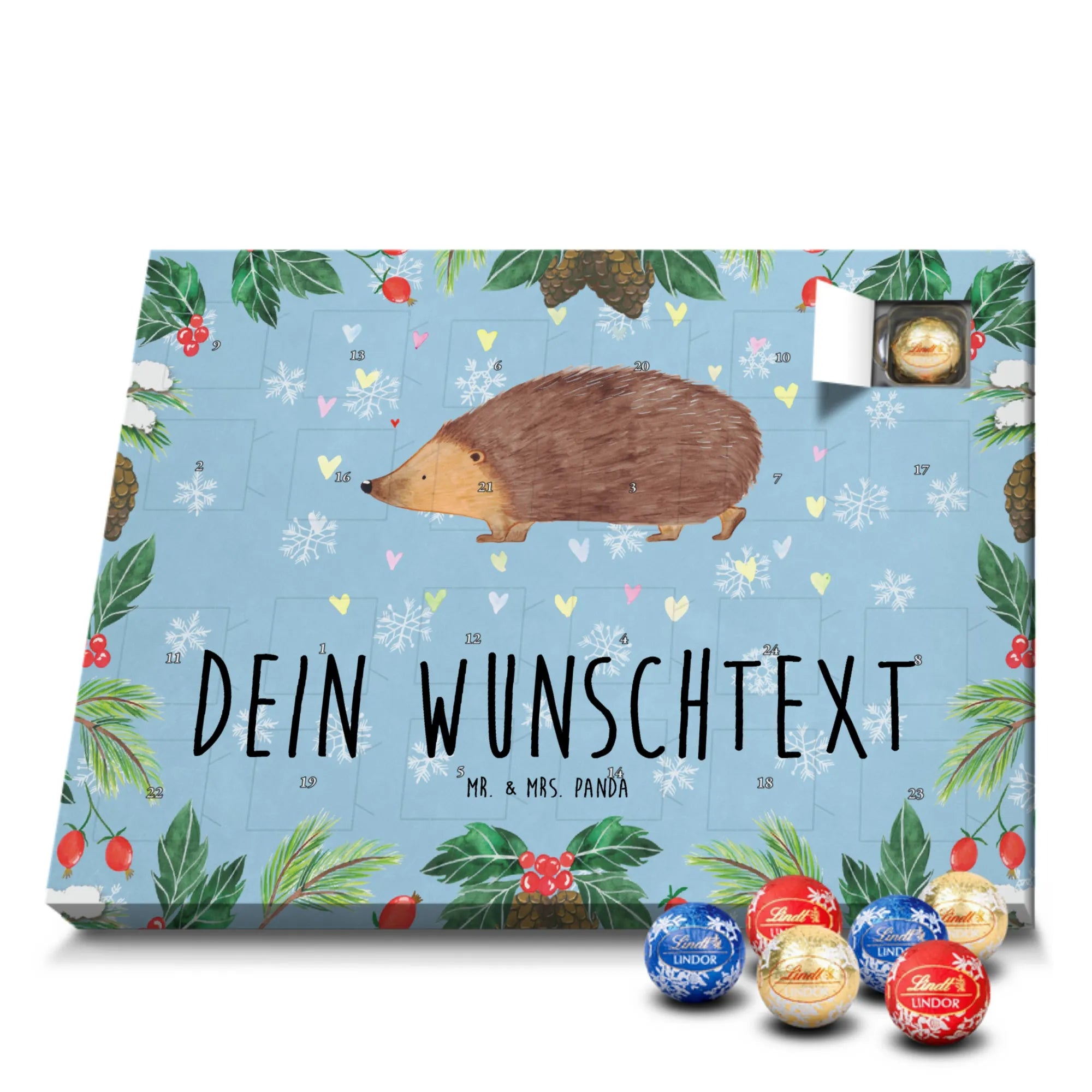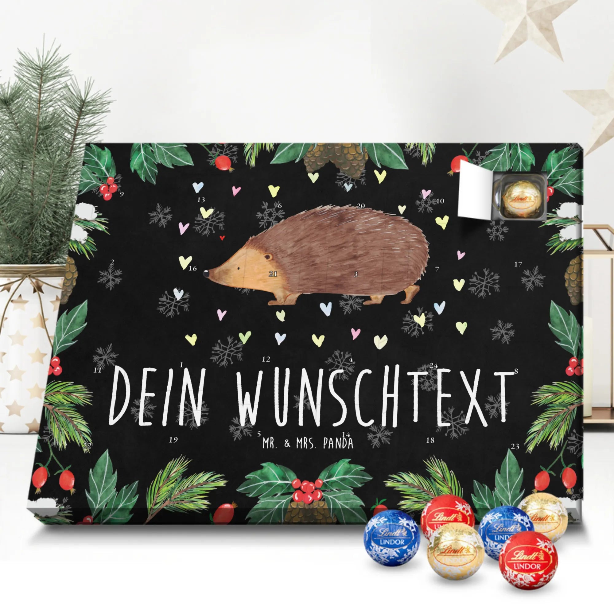 Personalisierter Schoko Adventskalender von Mr. & Mrs. Panda – der süße Countdown für dich oder deine Liebsten! Unser liebevoll gestalteter Adventskalender ist bedruckt mit wunderschönen Motiven und fröhlichen Sprüchen von Mr. & Mrs. Panda und lässt sich mit deinem Wunschnamen oder Wunschtext personalisieren. Die brillante Druckqualität kombiniert mit einer seidenmatten Oberflächenveredelung sorgt für ein edles Finish, zusätzlich sind die Seitenflächen bedruckt für ein durchgängiges Design. Maße: 233 mm x 178 mm x 24 mm. Der Kalender ist besonders praktisch: du kannst ihn entweder aufstellen oder an der Wand aufhängen – so passt er überall hin und verbreitet vorweihnachtliche Stimmung. Gefüllt mit Lindt Lindor Schokolade: 24 einzeln verpackte Markenschokoladen Kugeln in drei verschiedenen Sorten. Geschmacksrichtungen: Vollmilch, Feinherb und Weiße Schokolade. Zutaten: Zucker, pflanzliches Fett (Kokosnuss, Palmkern), Kakaobutter, Vollmilchpulver, Kakaomasse, Milchzucker, Magermilchpulver, Butterreinfett, Emulgator (Sojalecithin), Gerstenmalzextrakt, Aromen. Besondere Hinweise: Kann Haselnüsse und Mandeln enthalten. Dieser Adventskalender ist das perfekte Geschenk für Familien, Paare, Freunde oder für dich selbst – ein kleines tägliches Verwöhnmoment im Dezember. Bestell jetzt deinen personalisierten Schoko Adventskalender und zaubere ein Lächeln unter den Tannenbaum!