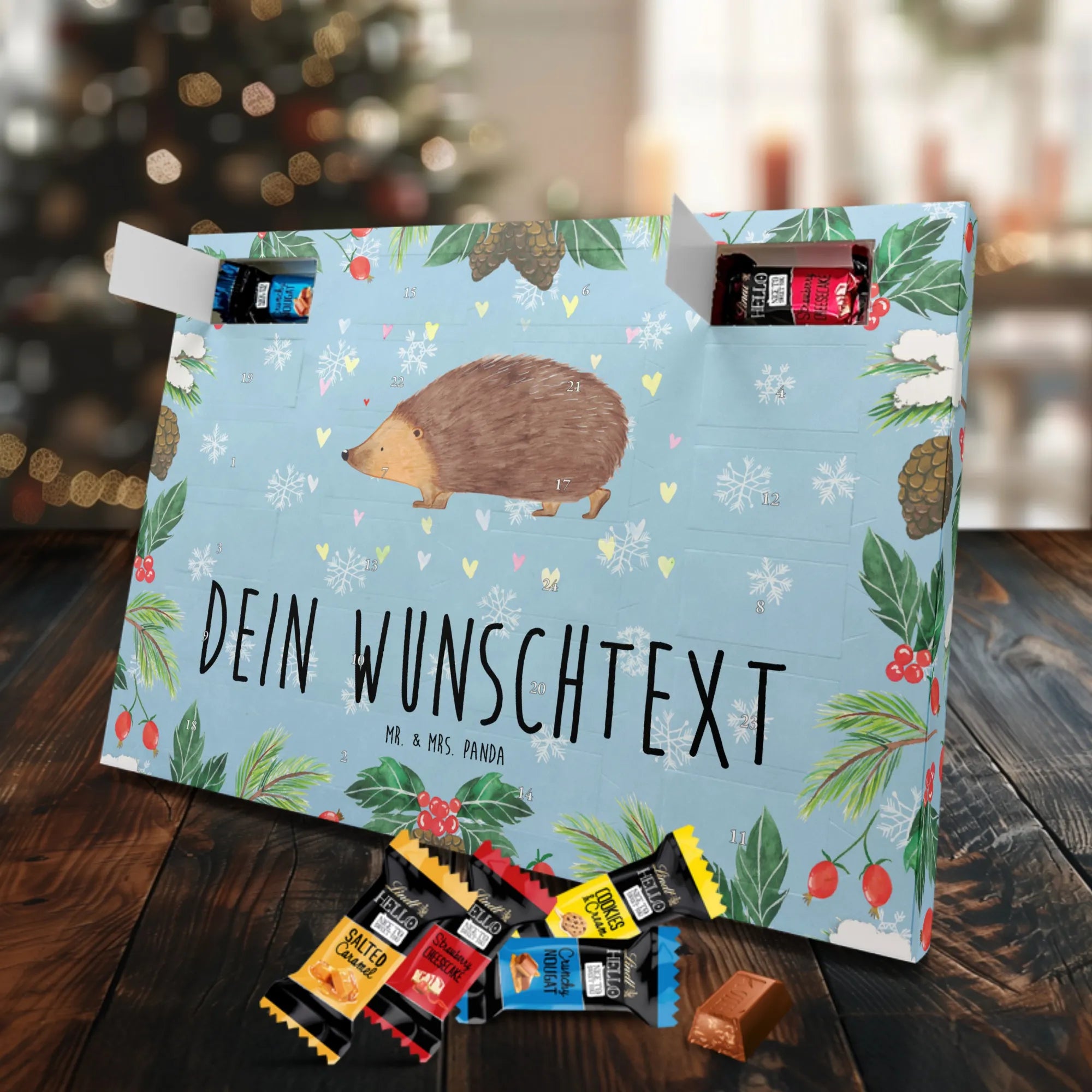 Schoko Adventskalender personalisiert – die süße Überraschung von Mr. & Mrs. Panda für die Adventszeit! Unser Kalender ist liebevoll illustriert und mit fröhlichen Sprüchen bedruckt, die du zusätzlich mit deinem Wunschnamen oder einem kurzen Text personalisieren kannst. Die Seitenflächen sind ebenfalls bedruckt, sodass das Design rundum harmonisch ist. Durch die seidenmatte Oberflächenveredelung wirkt alles besonders hochwertig und die brillante Druckqualität setzt deine Motive toll in Szene. Der Kalender kann entweder aufgestellt oder aufgehängt werden und passt damit in jede Dekoration. Gefüllt mit Lindt Hello: Du bekommst 24 einzeln verpackte Schokoladen Mini Sticks in vier verschiedenen Geschmacksrichtungen (Karamell-Schokoladenkuchen, Kekse, Knuspriger Nougat, Erdbeer-Cheesecake). Zutatenliste inklusive. Wichtige Allergenhinweise: enthält Milcheiweiß, Milchzucker, Soja, Weizen und Haselnüsse; kann Mandeln und andere Schalenfrüchte enthalten. Ein persönliches Geschenk mit Qualität und Herz – gemacht für schöne Adventsmomente. Maße: 325 mm x 225 mm x 27 mm.