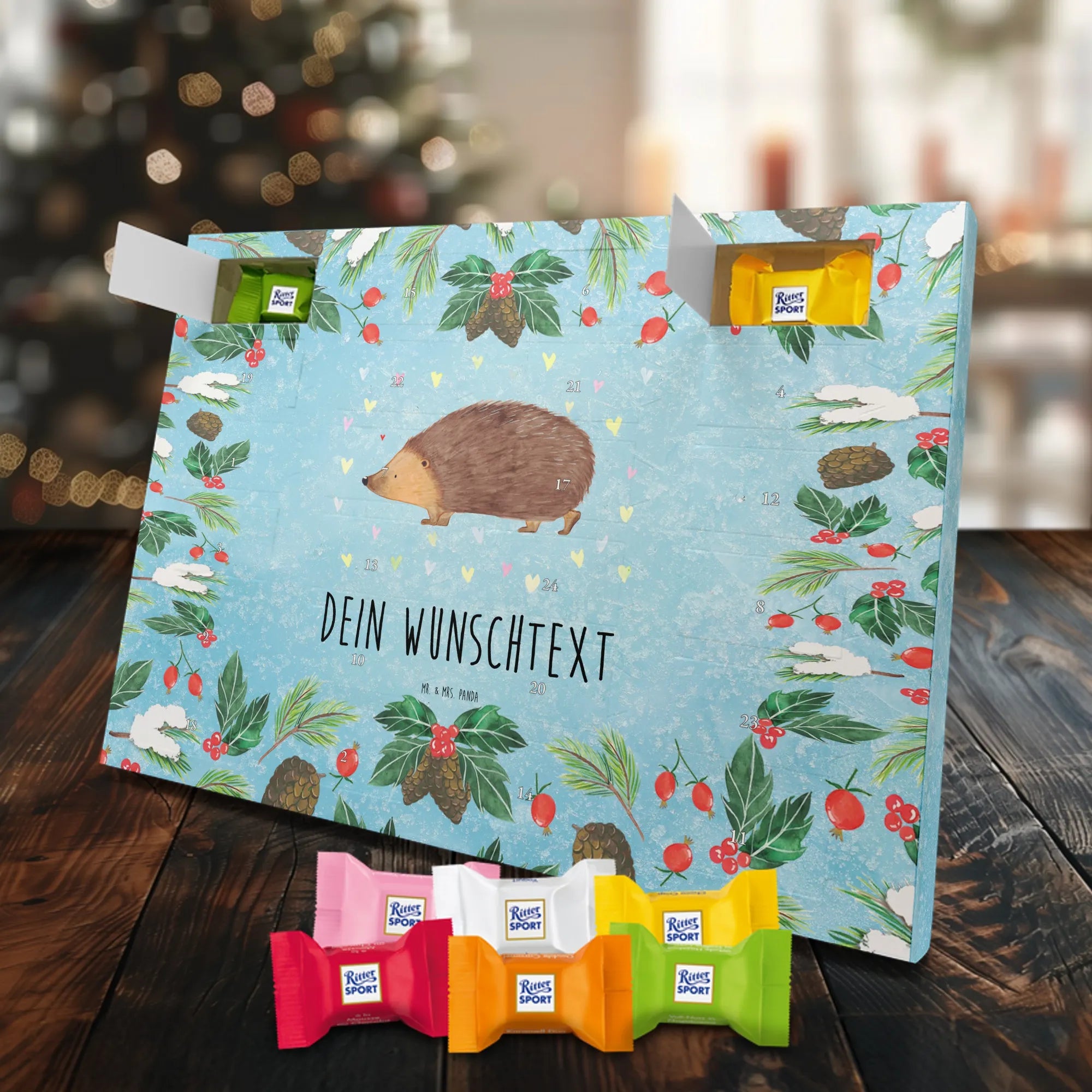 Verschenke Vorfreude mit unserem liebevoll gestalteten Personalisierter Schoko Adventskalender von Mr. & Mrs. Panda. Jeder Kalender wird mit deinem Wunschtext oder Namen personalisiert und ist ein echter Blickfang – dank der fröhlichen Illustrationen und Kurzsprüche, die typisch für Mr. & Mrs. Panda sind. Die Druckqualität ist hervorragend, ergänzt durch eine seidenmatte Oberflächenveredelung, die das Motiv besonders edel erscheinen lässt. Auch die Seiten sind bedruckt, sodass kein Blickwinkel verloren geht. Der Kalender ist flexibel einsetzbar: du kannst ihn aufstellen oder platzsparend aufhängen. Hinter den 24 Türchen verstecken sich Ritter Sport Schokowürfel in folgenden leckeren Geschmacksrichtungen: Mousse au Chocolat, Schoko Crisp, Voll-Nuss in Nougatcreme, Karamell Duo, Joghurt und Erdbeer-Joghurt – für jeden Geschmack ist etwas dabei. Maße: 325 mm x 225 mm x 27 mm. Ein tolles Geschenk für Familie, Freunde oder für dich selbst, das jeden Dezembertag etwas süßer macht.