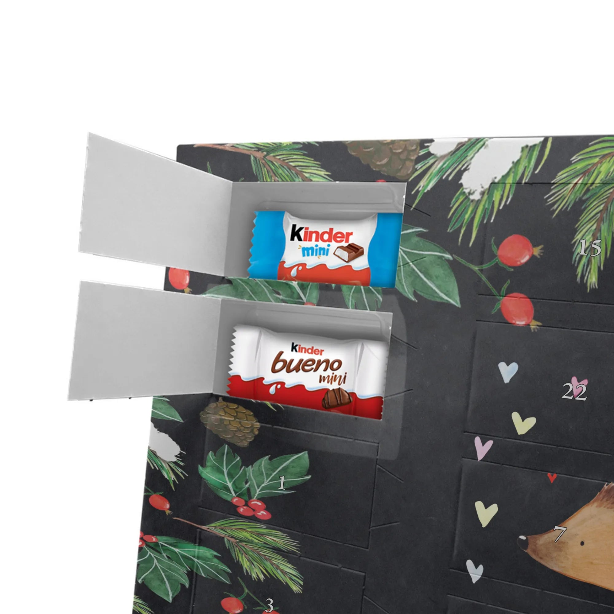 Fröhlich, persönlich und süß – unser Personalisierter Schoko Adventskalender von Mr. & Mrs. Panda bringt Wärme in die Adventszeit. Der Kalender ist liebevoll bedruckt mit wunderschönen Motiven & Sprüchen von Mr. & Mrs. Panda und lässt sich mit deinem Wunschnamen oder Wunschtext personalisieren, sodass jedes Türchen eine kleine, persönliche Überraschung wird. Die brillante Druckqualität in Kombination mit seidenmatter Oberflächenveredelung verleiht dem Kalender eine hochwertige Haptik. Auch die Seitenflächen sind bedruckt, damit dein Geschenk von allen Seiten überzeugt. Maße: 355 mm x 245 mm x 11 mm – praktisch und stilvoll. Besonderheit: kann aufgehängt oder aufgestellt werden, perfekt für Fensterbank, Kommode oder als Dekoration an der Wand. Gefüllt mit kinder® Schokolade: Adventskalender gefüllt mit kinder® Schokolade; Inhalt: kinder® Schoko-Bons, kinder® Bueno mini und kinder® Schokolade mini. Ob als Geschenk für die Liebsten oder als süße Belohnung für dich selbst – dieser Adventskalender verbindet tolles Design mit leckerem Inhalt und persönlicher Note.