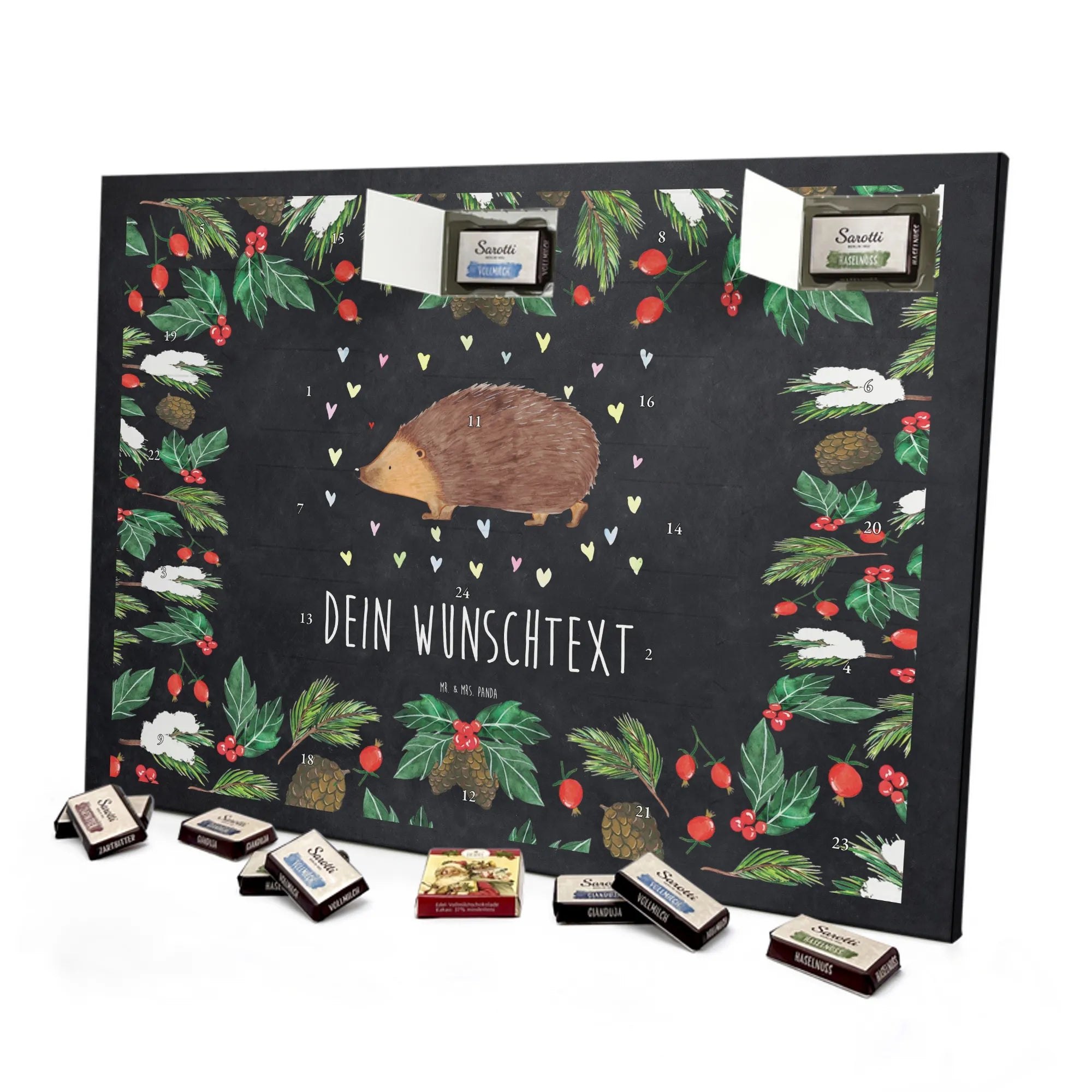 Wunderschöner Personalisierter Schoko Adventskalender von Mr. & Mrs. Panda – dein perfekter Begleiter durch die Vorweihnachtszeit! Dieser Adventskalender ist liebevoll bedruckt mit zauberhaften Motiven und witzigen Sprüchen von Mr. & Mrs. Panda und lässt sich ganz individuell mit deinem Wunschnamen oder Wunschtext personalisieren. Die brillante Druckqualität und die seidenmatte Oberflächenveredelung sorgen dafür, dass die Farben schön leuchten und sich der Kalender edel anfühlt. Auch die Seitenflächen sind bedruckt, sodass er von allen Seiten ein Hingucker ist. Maße: 355 mm x 245 mm x 11 mm. Eine besondere Eigenschaft: Du kannst ihn bequem aufhängen oder aufstellen – je nachdem, wie du ihn präsentieren möchtest. Gefüllt ist der Kalender mit einer hochwertigen Füllung aus 24 einzeln verpackten Schokoladentäfelchen in vier köstlichen Geschmacksrichtungen. Insgesamt enthält er 107 g Markenschokolade von Sarotti® und Confiserie Heidel® in den Sorten Vollmilch, Nougat, Zartbitter und Haselnuss. Bitte beachte: Es handelt sich um einen Kalender gefüllt mit Sarotti® und Confiserie Heidel® Markenschokolade. Verschenke Freude, Individualität und süße Momente – ideal als Geschenk für Freunde, Familie oder dich selbst. Mit diesem persönlichen Adventskalender machst du jeden Tag im Dezember zu einem kleinen Fest.