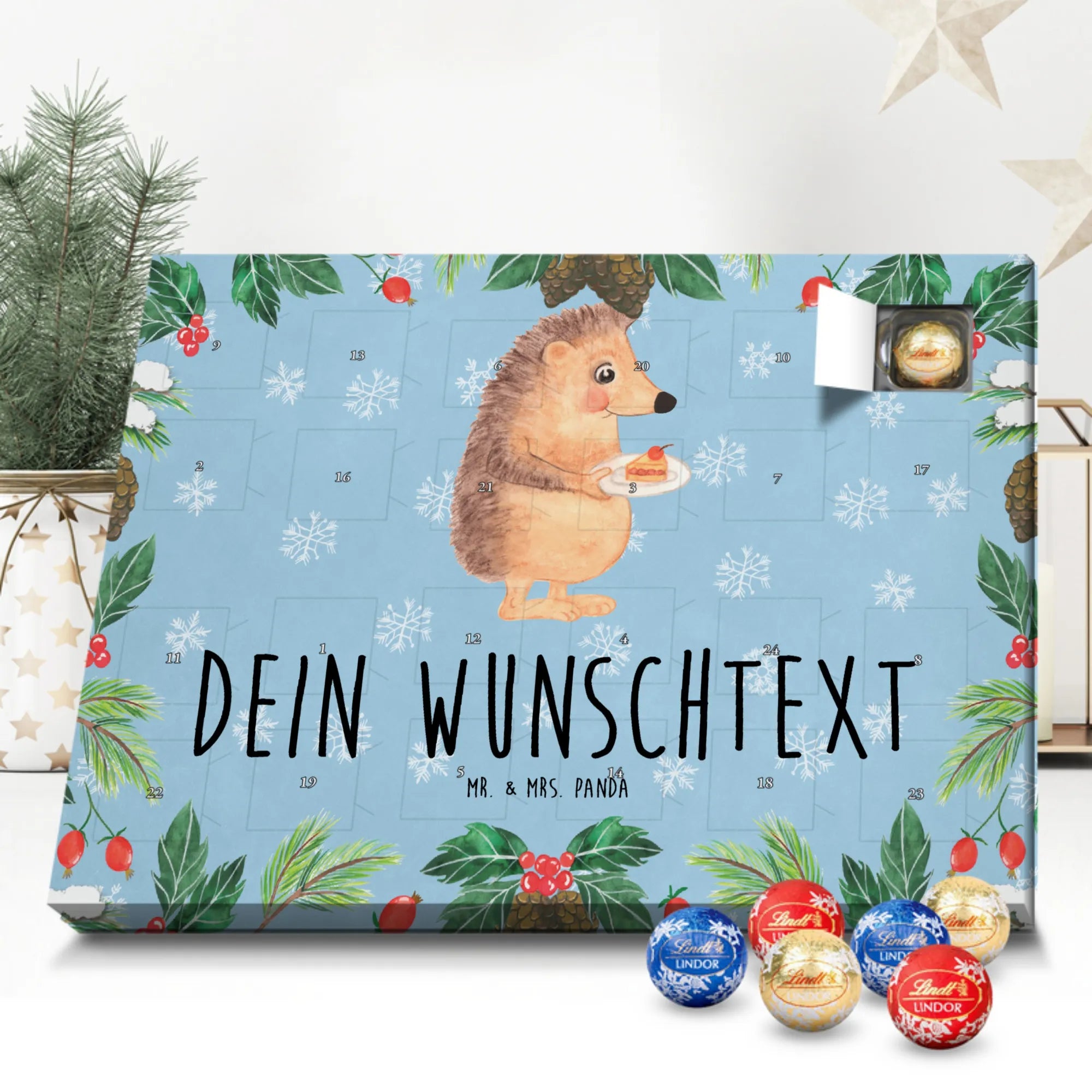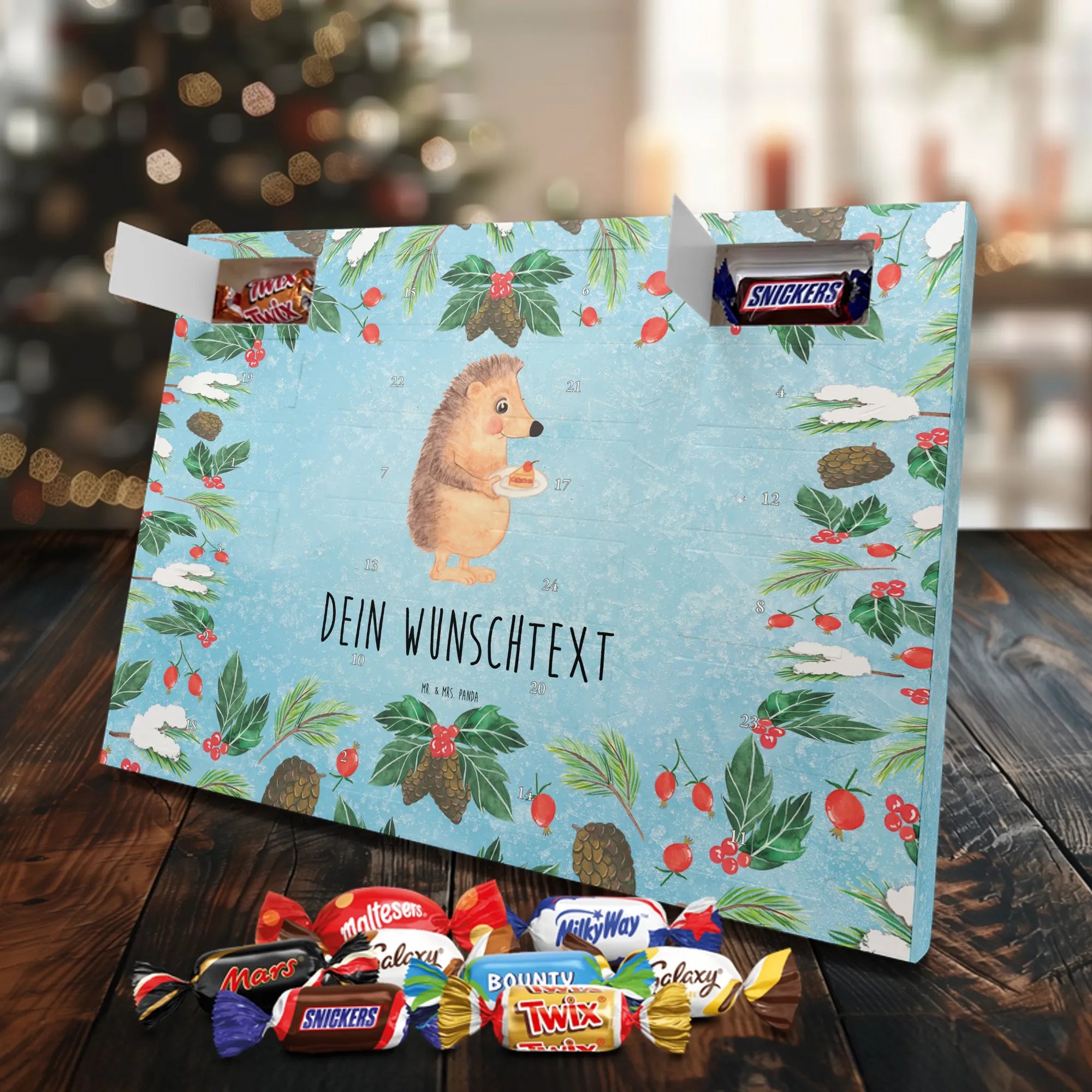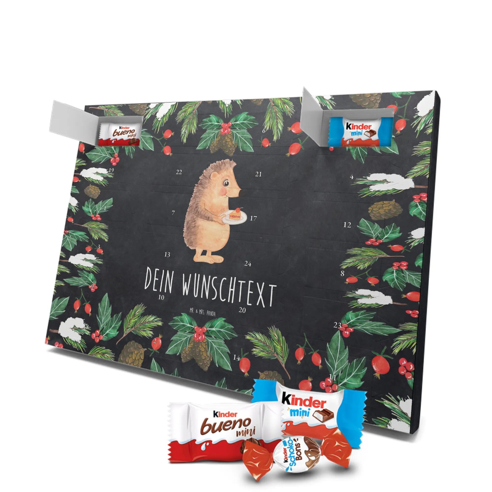 Mach die Adventszeit persönlich mit unserem Personalisierter Adventskalender mit Schokolade von Mr. & Mrs. Panda. Jeder Kalender ist liebevoll illustriert und bedruckt mit charmanten Sprüchen und Motiven – perfekt als Geschenk oder Deko für dein Zuhause. Du kannst deinen Wunschname oder einen kurzen Text hinzufügen, damit der Kalender ganz individuell wird. Die brillante Druckqualität und die seidenmatte Oberflächenveredelung sorgen für eine edle Optik, und auch die Seitenflächen sind komplett bedruckt. Maße: 233 mm x 178 mm x 24 mm. Die clevere Konstruktion erlaubt es, den Kalender aufzuhängen oder aufzustellen – flexibel und dekorativ zugleich. Gefüllt mit MARKENNAMEN Schokolade sowie köstlichen Schokoladenkugeln ist jeder Tag im Advent eine süße Überraschung. Wichtiger Hinweis: (Kann Spuren von Haselnüssen, Mandeln, Gluten und Soja enthalten!), kühl und trocken lagern! Egal ob für Kinder, Partner oder beste Freundin – dieser personalisierte Adventskalender bringt ein Lächeln und zaubert gemütliche Vorfreude. Bestell jetzt und gestalte deine Adventszeit mit einem Hauch Mr. & Mrs. Panda.