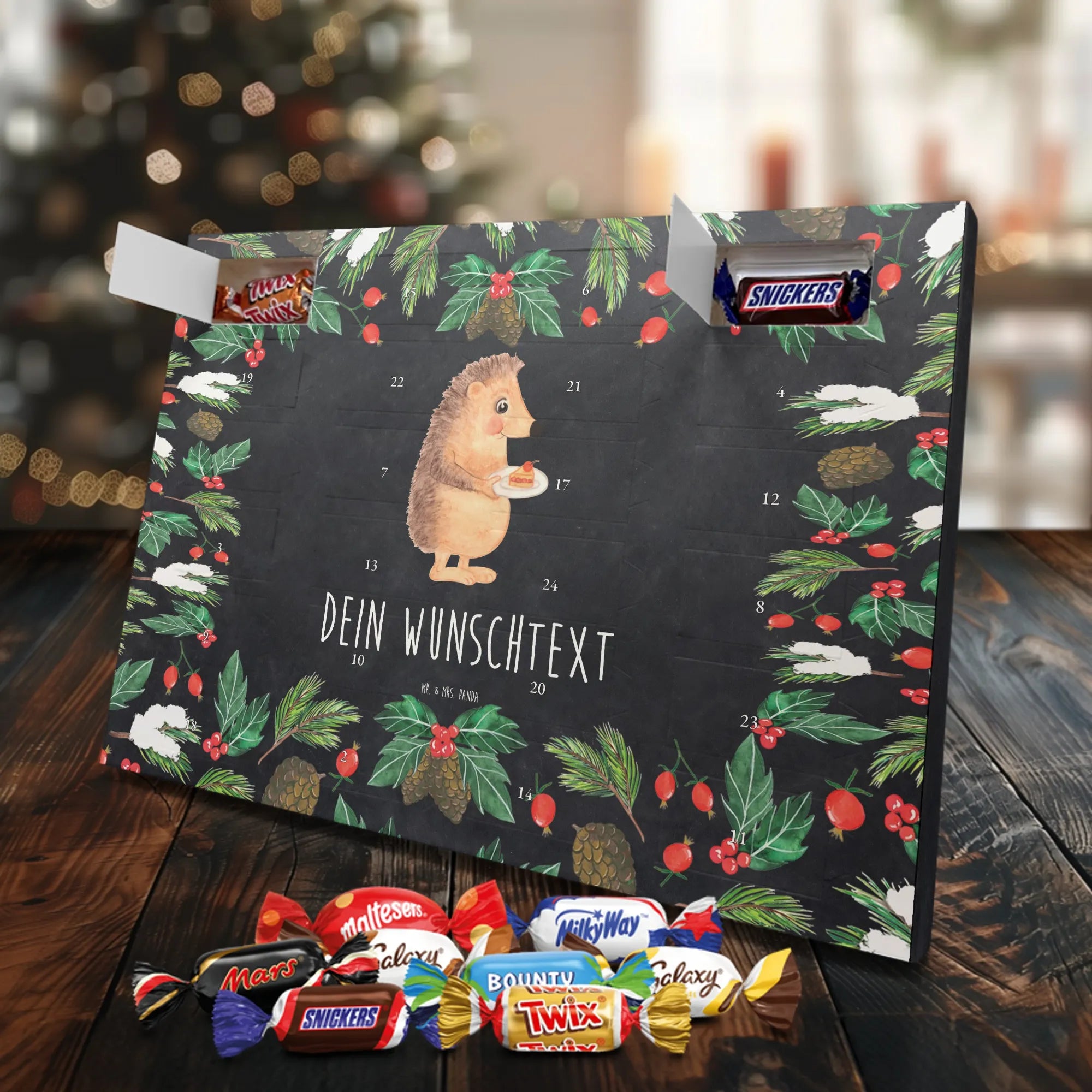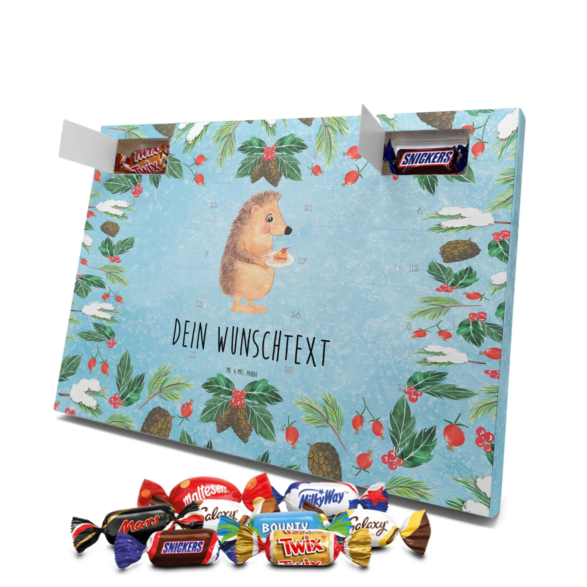 Adventskalender mit deinem Namen – individuell, süß und mit ganz viel Mr. & Mrs. Panda Charme! Dieser personalisierbare Schoko Adventskalender wird mit liebevollen Motiven & frechen Sprüchen bedruckt und lässt sich mit deinem Wunschnamen oder Wunschtext individualisieren. Durch die brillante Druckqualität und die seidenmatte Oberflächenveredelung wirken die Farben besonders intensiv und hochwertig. Auch die Seitenflächen sind bedruckt, sodass das Gesamtbild stimmig ist. Du hast die Wahl: Häng den Kalender auf oder stell ihn auf – beides funktioniert super. Der Kalender ist gefüllt mit Celebrations und enthält 24 hochwertige Füllungen in 8 verschiedenen Sorten, darunter Maltesers, Mars, Snickers, Twix, Milky Way, Bounty, Galaxy und Galaxy Caramel, die dir jeden Tag im Dezember ein Lächeln schenken. Maße: 325 mm x 225 mm x 27 mm – ideal dimensioniert für schöne Türchen-Überraschungen. Verschenke persönliche Vorfreude an Freunde, Familie oder gönn dir selbst diese zuckersüße Adventsüberraschung von Mr. & Mrs. Panda.