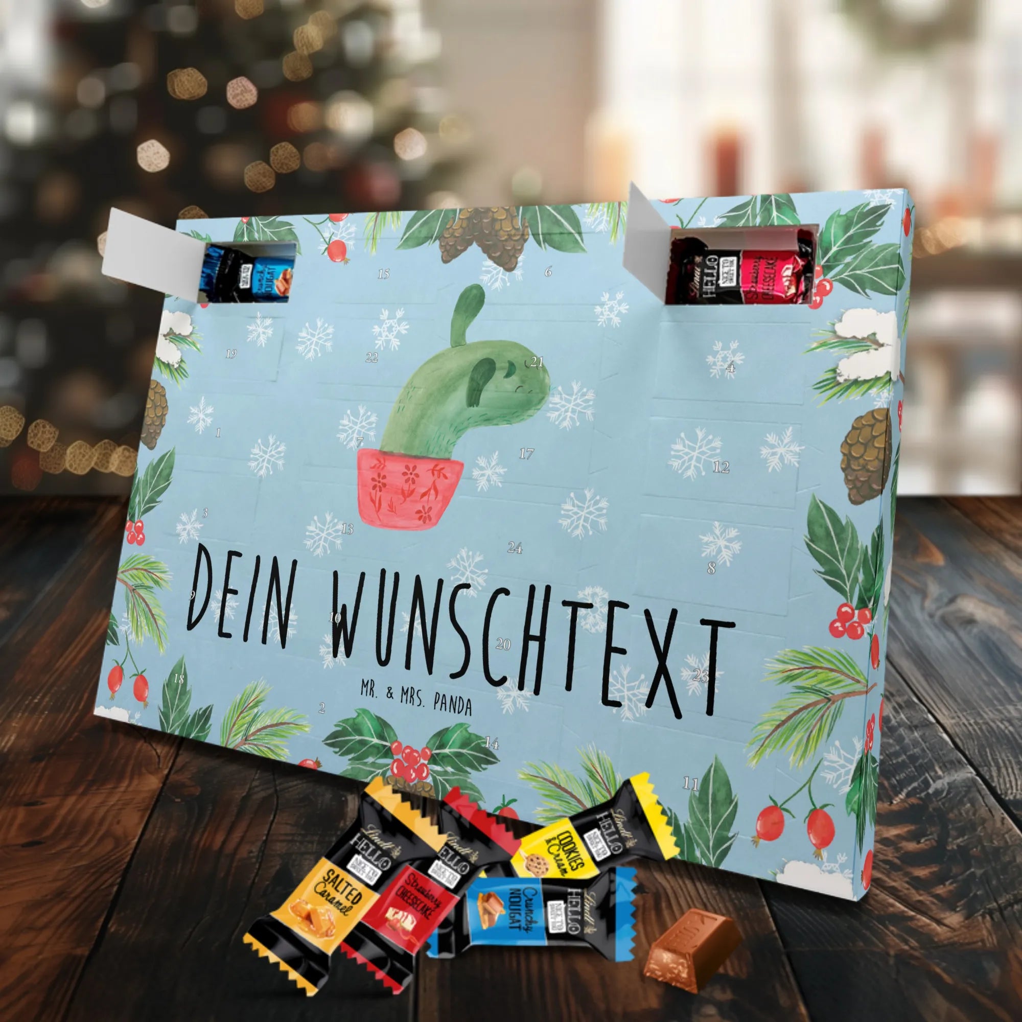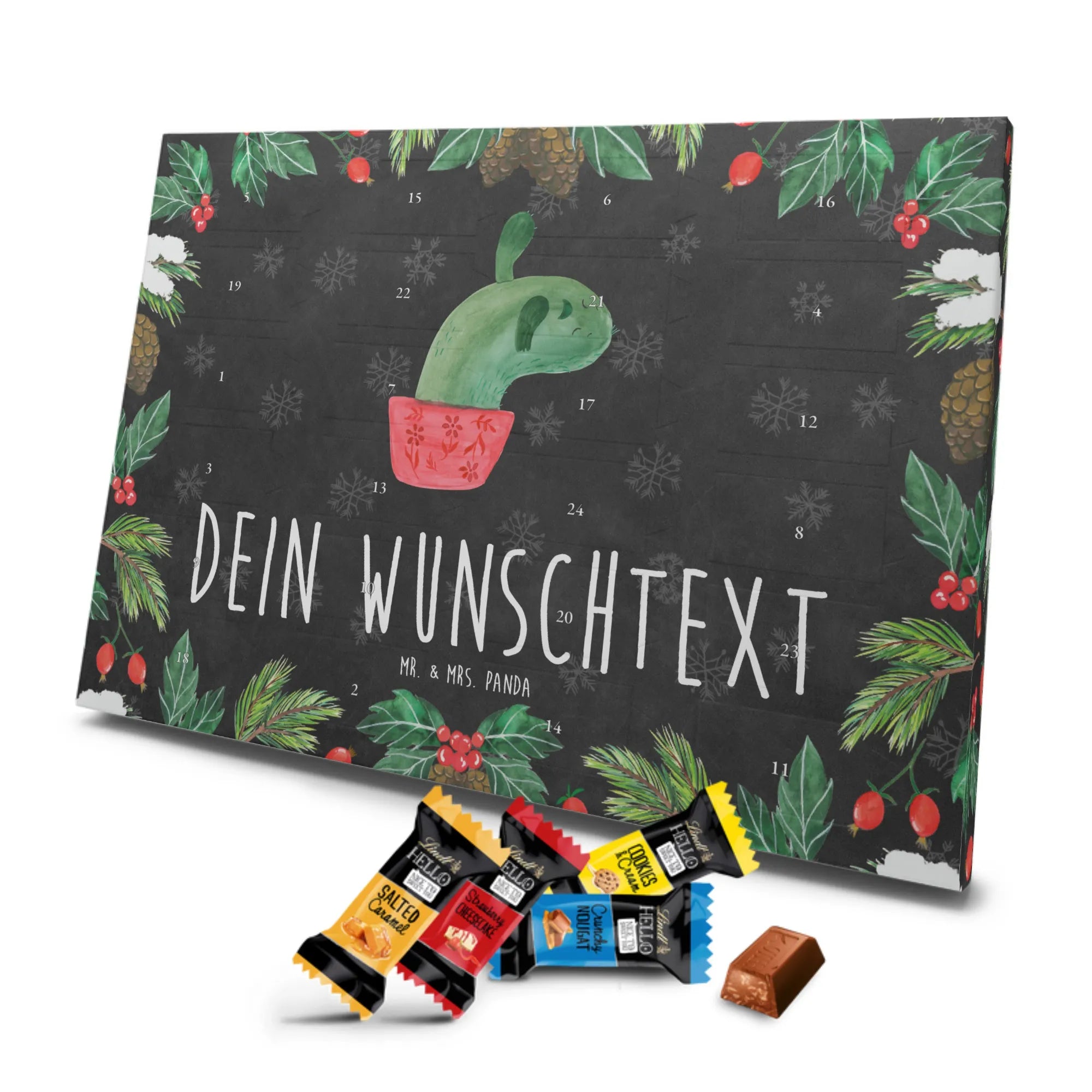 Personalisierter Adventskalender mit Schokolade – das Geschenk, das von Herzen kommt. Mr. & Mrs. Panda haben für dich einen Adventskalender gestaltet, der nicht nur mit süßen Überraschungen gefüllt ist, sondern auch optisch überzeugt: bedruckte Seitenflächen, charmante Motive und Sprüche sowie eine seidenmatte Oberflächenveredelung für edles Finish. Du kannst den Kalender mit deinem Wunschnamen oder Wunschtext personalisieren – ideal als Geschenk für die beste Freundin, Familie oder Kinder. Er kann aufgehängt oder einfach aufgestellt werden, je nachdem, wie du ihn präsentieren möchtest. Gefüllt mit Lindt Hello: 24 einzeln verpackte Schokoladen Mini Sticks in den Sorten Karamell-Schokoladenkuchen, Kekse, Knuspriger Nougat und Erdbeer-Cheesecake. Bitte beachte die Zutaten und Allergenhinweise (Milcheiweiß, Milchzucker, Soja, Weizen, Haselnüsse; kann Mandeln und andere Schalenfrüchte enthalten). Die brillante Druckqualität macht dein Design besonders lebendig. Maße: 325 mm x 225 mm x 27 mm – handliche Größe für jede Dekoration.