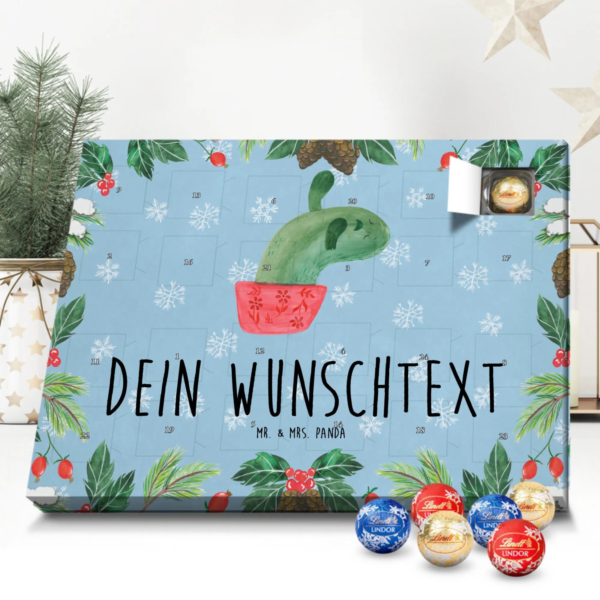 Personalisierter Adventskalender mit Schokolade von Mr. & Mrs. Panda – ein fröhlicher Blickfang in der Adventszeit! Der Kalender ist liebevoll gestaltet und bedruckt mit zauberhaften Motiven und positiven Sprüchen aus der Mr. & Mrs. Panda Kollektion. Du kannst ihn mit deinem Wunschnamen oder einem kurzen Wunschtext personalisieren, sodass jedes Türchen eine persönliche Botschaft trägt. Die brillante Druckqualität und die seidenmatte Oberflächenveredelung machen das Design besonders hochwertig, und die bedruckten Seitenflächen runden das Gesamtbild ab. Maße: 233 mm x 178 mm x 24 mm. Flexibel einsetzbar: entweder aufgehängt oder einfach aufgestellt – so wie es dir gefällt. Gefüllt mit Lindt Lindor Schokolade: 24 einzeln verpackte Markenschokoladen Kugeln in drei beliebten Sorten. Geschmacksrichtungen: Vollmilch, Feinherb und Weiße Schokolade. Zutaten: Zucker, pflanzliches Fett (Kokosnuss, Palmkern), Kakaobutter, Vollmilchpulver, Kakaomasse, Milchzucker, Magermilchpulver, Butterreinfett, Emulgator (Sojalecithin), Gerstenmalzextrakt, Aromen. Besondere Hinweise: Kann Haselnüsse und Mandeln enthalten. Verschenke Vorfreude und kleine Genussmomente – individuell, liebevoll und köstlich.