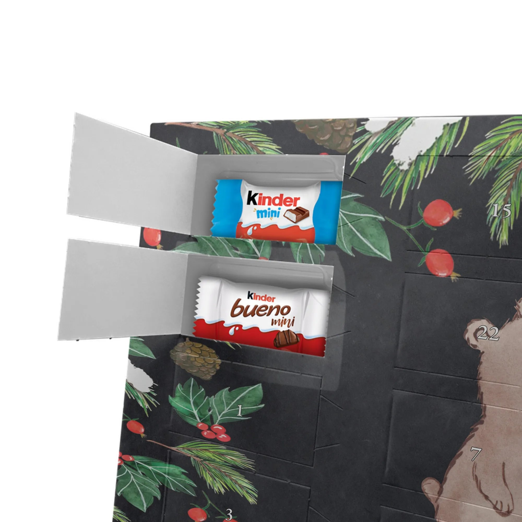 Fröhlich, persönlich und süß – unser Personalisierter Schoko Adventskalender von Mr. & Mrs. Panda bringt Wärme in die Adventszeit. Der Kalender ist liebevoll bedruckt mit wunderschönen Motiven & Sprüchen von Mr. & Mrs. Panda und lässt sich mit deinem Wunschnamen oder Wunschtext personalisieren, sodass jedes Türchen eine kleine, persönliche Überraschung wird. Die brillante Druckqualität in Kombination mit seidenmatter Oberflächenveredelung verleiht dem Kalender eine hochwertige Haptik. Auch die Seitenflächen sind bedruckt, damit dein Geschenk von allen Seiten überzeugt. Maße: 355 mm x 245 mm x 11 mm – praktisch und stilvoll. Besonderheit: kann aufgehängt oder aufgestellt werden, perfekt für Fensterbank, Kommode oder als Dekoration an der Wand. Gefüllt mit kinder® Schokolade: Adventskalender gefüllt mit kinder® Schokolade; Inhalt: kinder® Schoko-Bons, kinder® Bueno mini und kinder® Schokolade mini. Ob als Geschenk für die Liebsten oder als süße Belohnung für dich selbst – dieser Adventskalender verbindet tolles Design mit leckerem Inhalt und persönlicher Note.