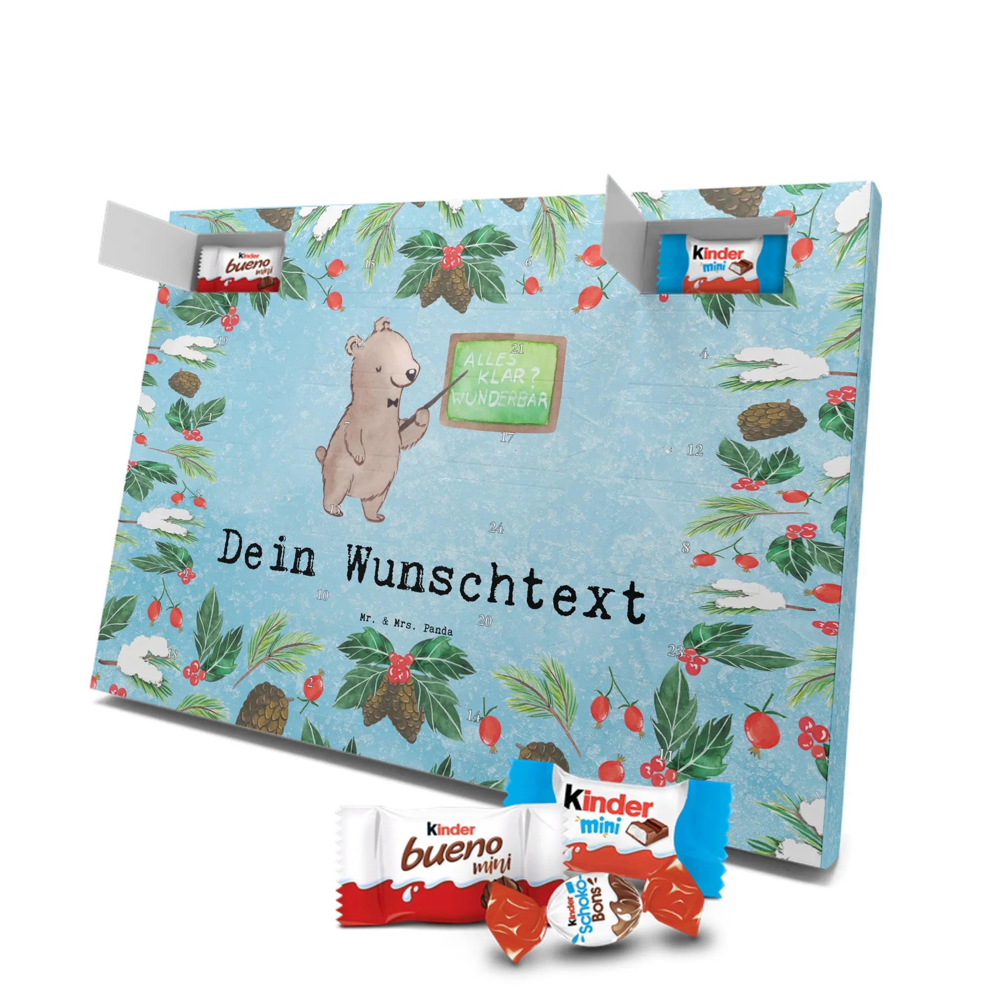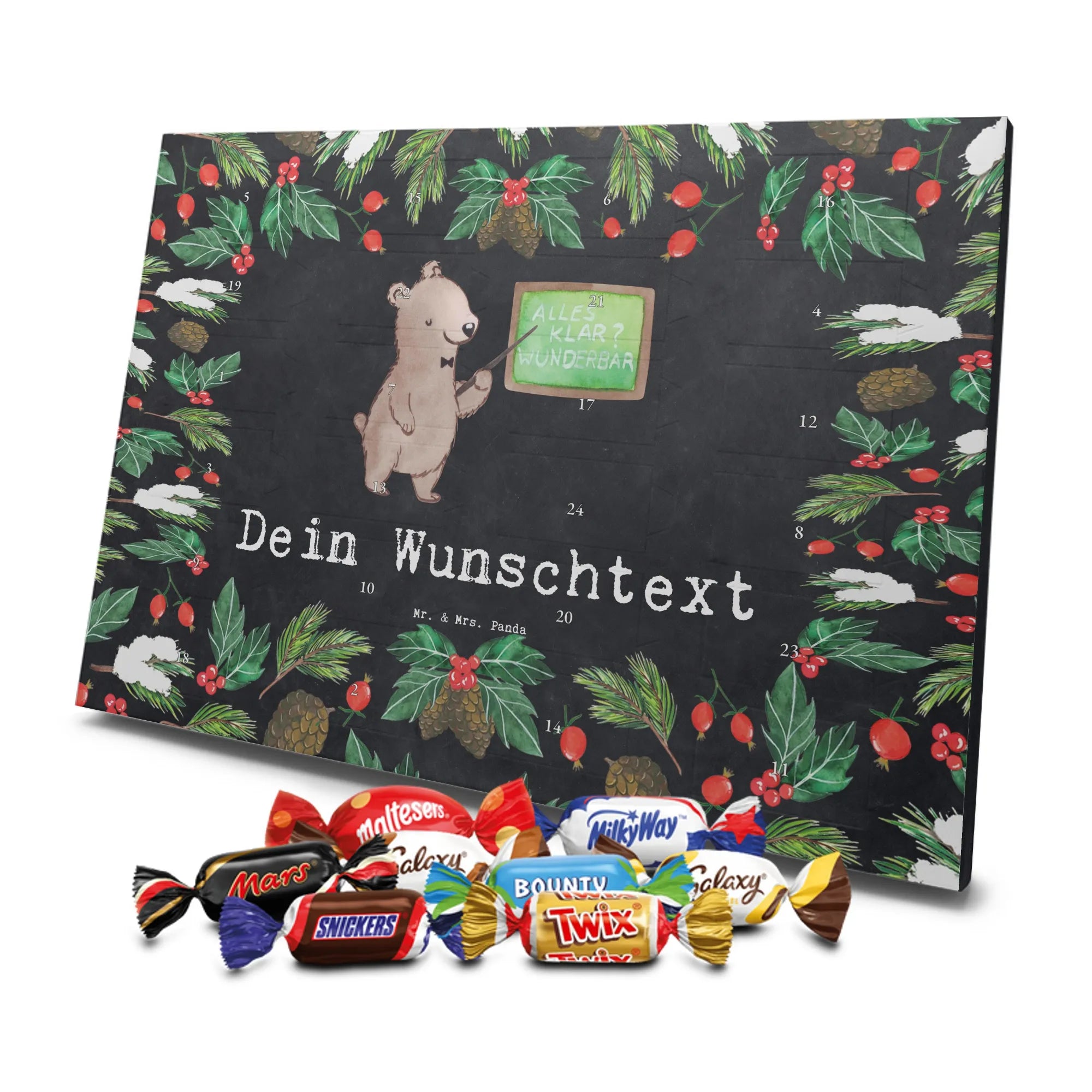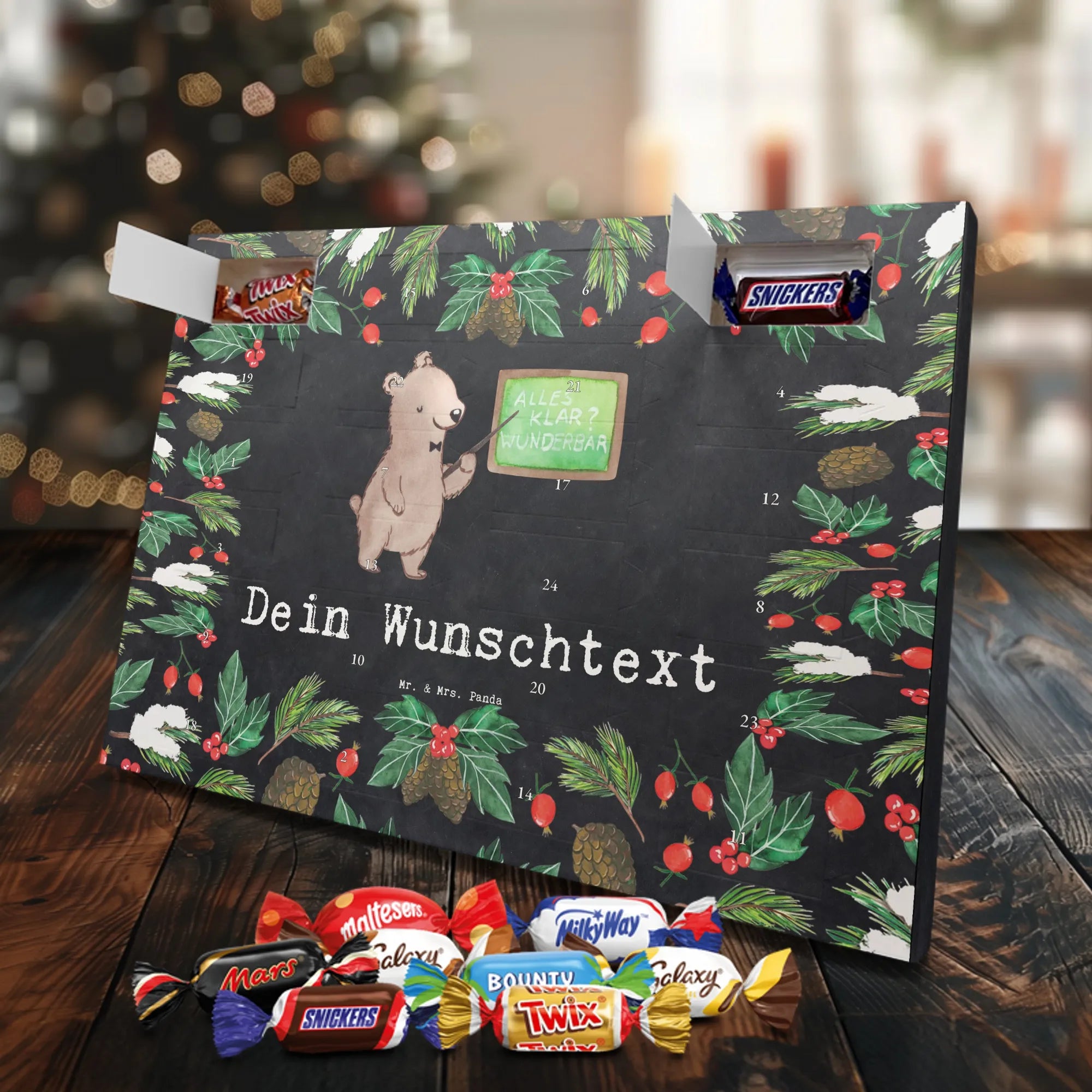 Personalisierter Schoko-Adventskalender von Mr. & Mrs. Panda – liebevoll gestaltet und ideal als individuelles Geschenk in der Adventszeit. Wir bedrucken den Kalender mit zauberhaften Motiven & herzlichen Sprüchen und personalisieren ihn mit deinem Wunschnamen oder Wunschtext. Die hochwertige Druckqualität kombiniert mit einer seidenmatten Oberflächenveredelung sorgt für ein edles Erscheinungsbild, und die bedruckten Seitenflächen geben dem Motiv zusätzlichen Charme. Der Kalender kann aufgehängt oder aufgestellt werden, sodass du ihn flexibel platzieren kannst. Gefüllt ist der Kalender mit Celebrations, die 24 hochwertige Überraschungen in 8 verschiedenen Sorten beinhalten: Maltesers, Mars, Snickers, Twix, Milky Way, Bounty, Galaxy und Galaxy Caramel. Maße: 325 mm x 225 mm x 27 mm – handlich und doch großzügig für die kleinen Leckereien hinter den Türchen. Ob für Kinder, Partner oder beste Freunde: dieser personalisierte Schoko-Adventskalender macht das Warten auf Weihnachten bunter und leckerer. Verschenke eine persönliche Erinnerung und jeden Tag ein kleines Schokoladen-Glück!