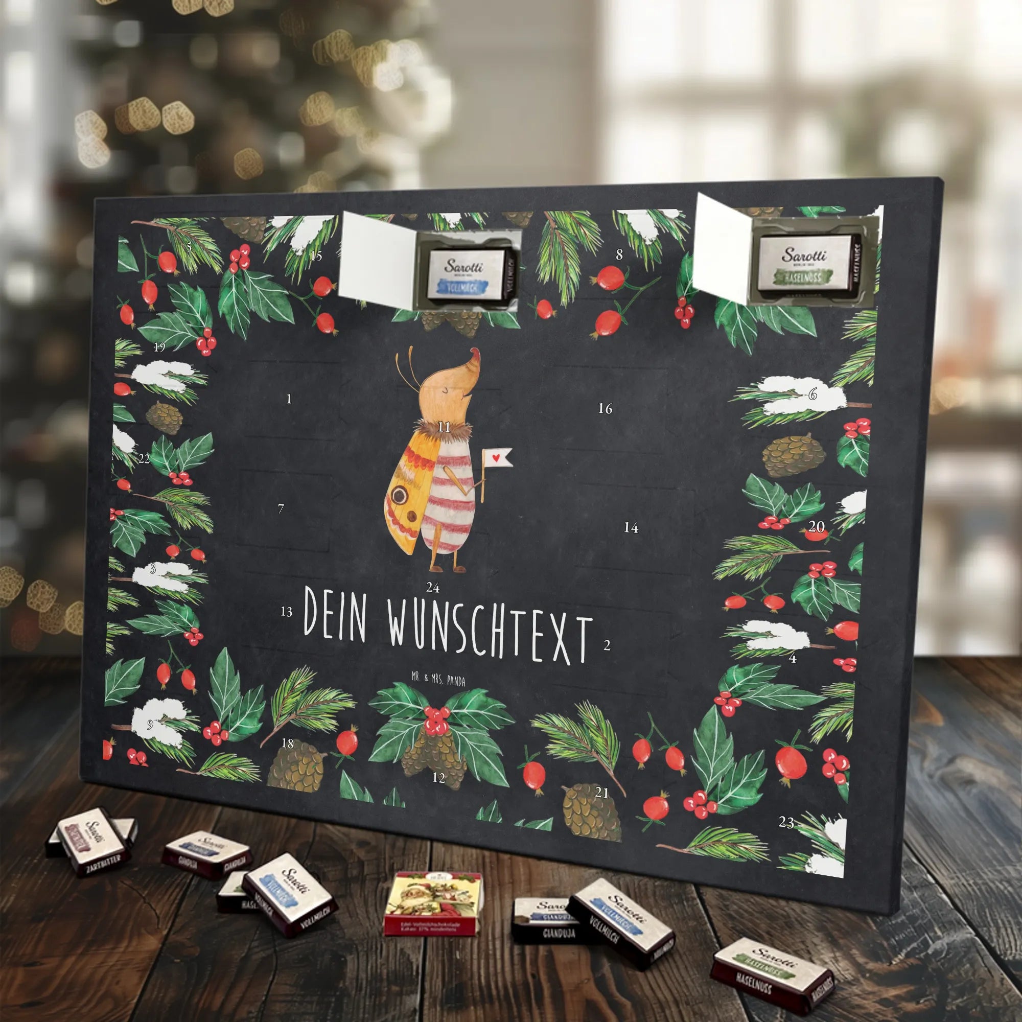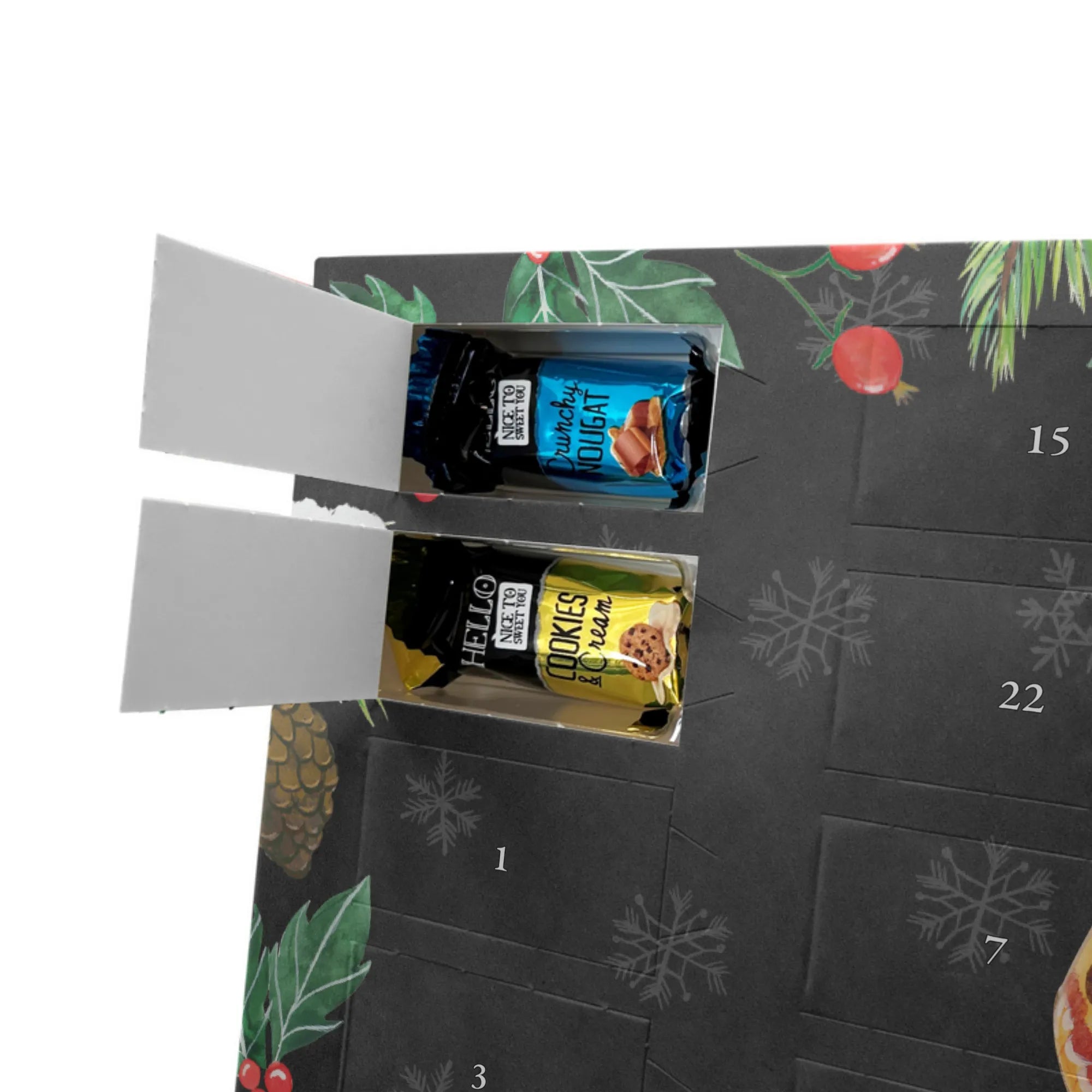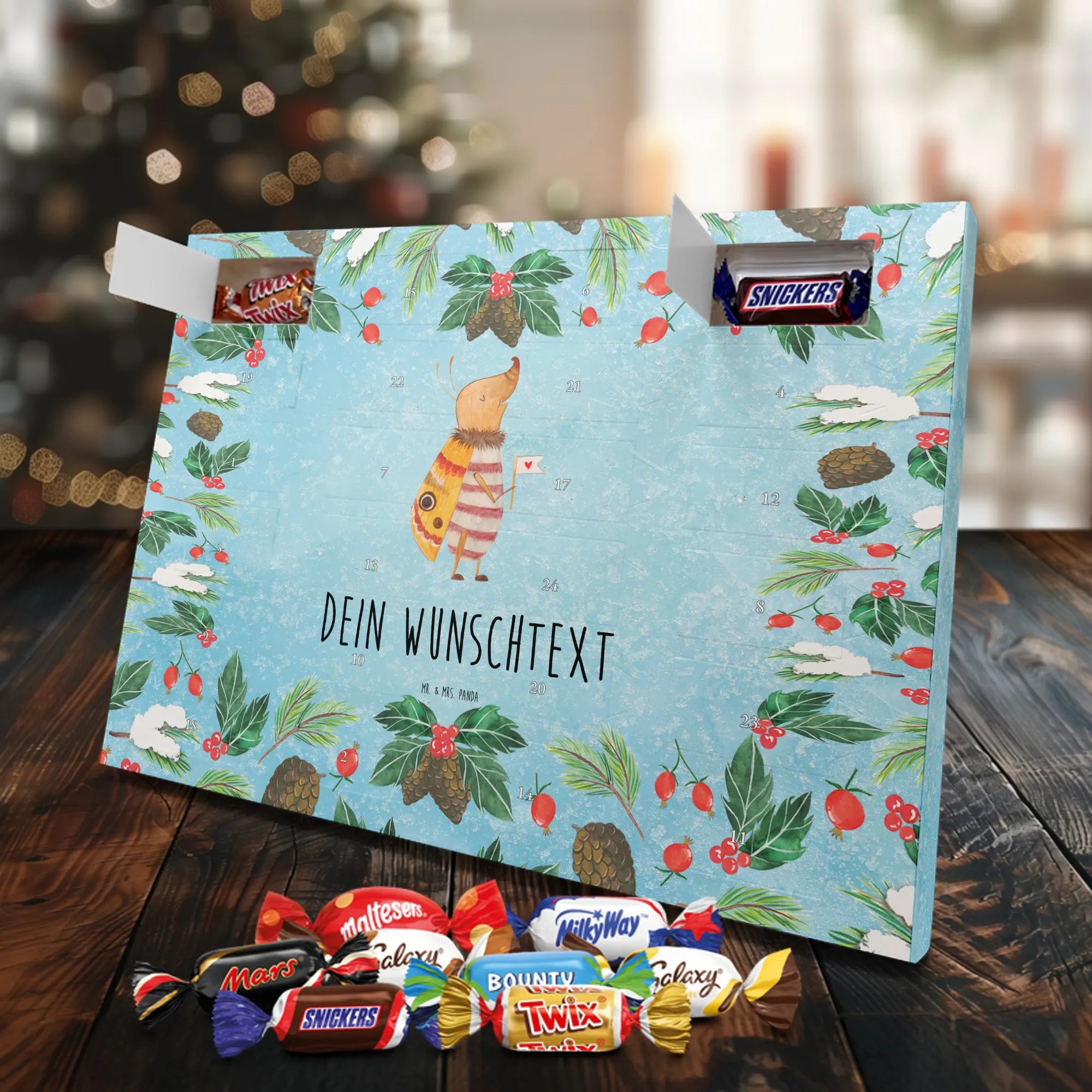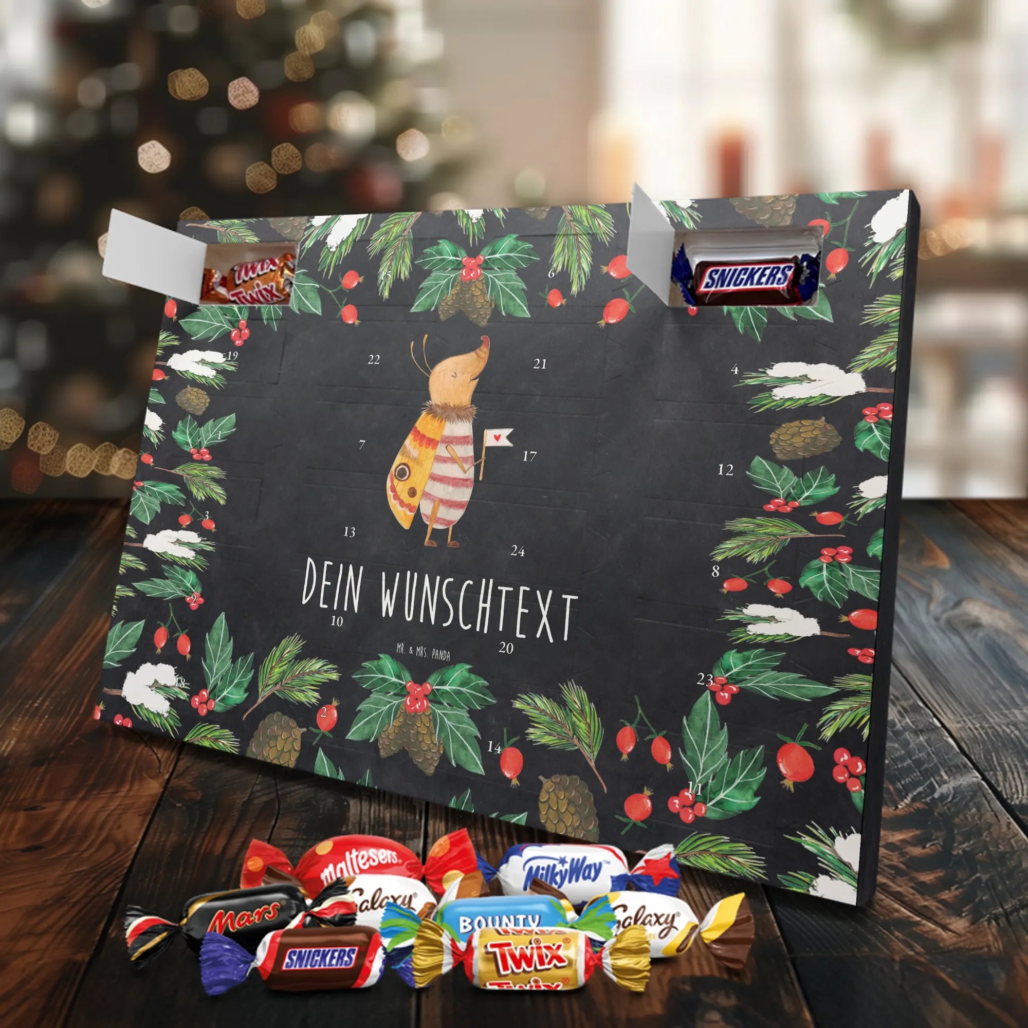 Personalisierter Schoko-Adventskalender von Mr. & Mrs. Panda – liebevoll gestaltet und ideal als individuelles Geschenk in der Adventszeit. Wir bedrucken den Kalender mit zauberhaften Motiven & herzlichen Sprüchen und personalisieren ihn mit deinem Wunschnamen oder Wunschtext. Die hochwertige Druckqualität kombiniert mit einer seidenmatten Oberflächenveredelung sorgt für ein edles Erscheinungsbild, und die bedruckten Seitenflächen geben dem Motiv zusätzlichen Charme. Der Kalender kann aufgehängt oder aufgestellt werden, sodass du ihn flexibel platzieren kannst. Gefüllt ist der Kalender mit Celebrations, die 24 hochwertige Überraschungen in 8 verschiedenen Sorten beinhalten: Maltesers, Mars, Snickers, Twix, Milky Way, Bounty, Galaxy und Galaxy Caramel. Maße: 325 mm x 225 mm x 27 mm – handlich und doch großzügig für die kleinen Leckereien hinter den Türchen. Ob für Kinder, Partner oder beste Freunde: dieser personalisierte Schoko-Adventskalender macht das Warten auf Weihnachten bunter und leckerer. Verschenke eine persönliche Erinnerung und jeden Tag ein kleines Schokoladen-Glück!
