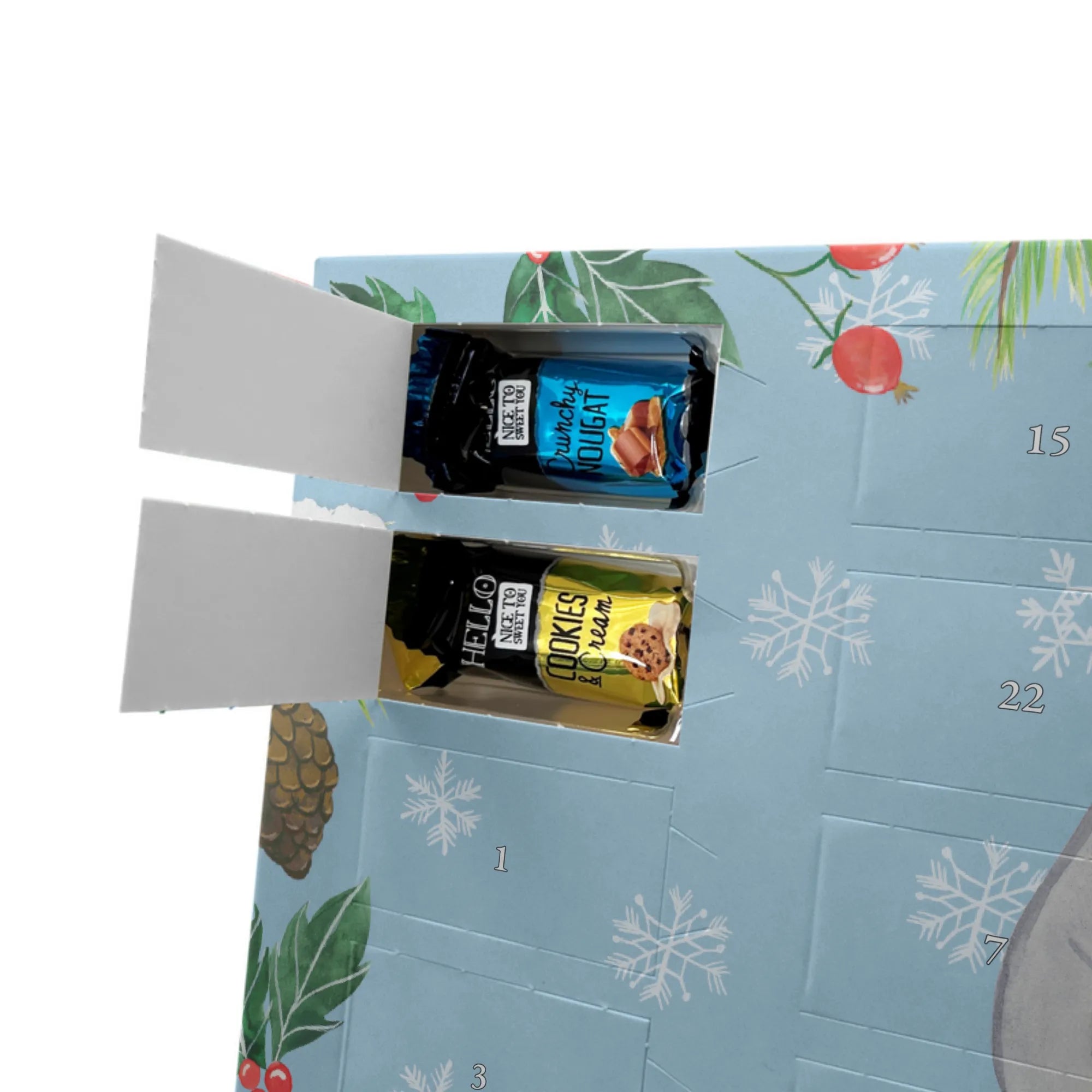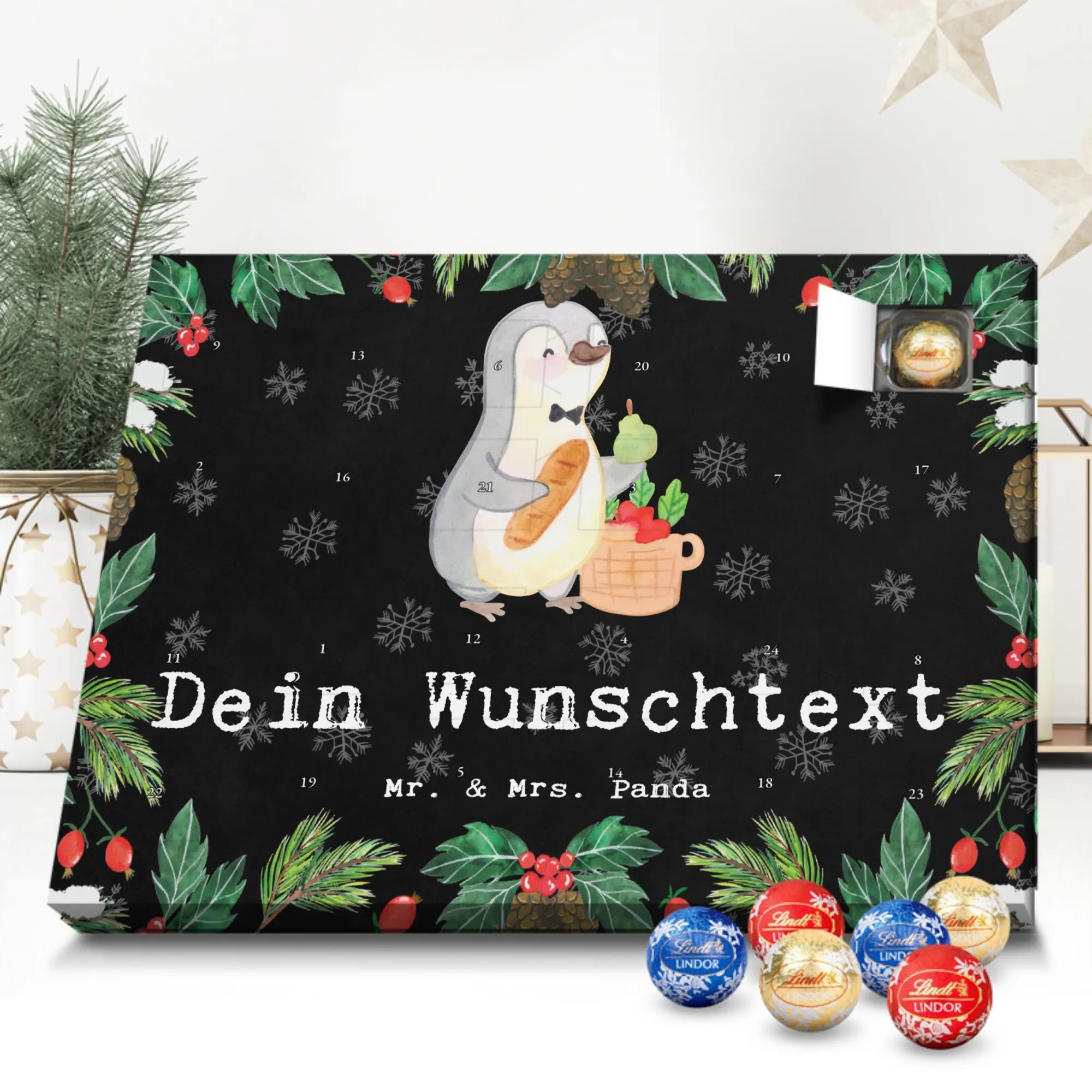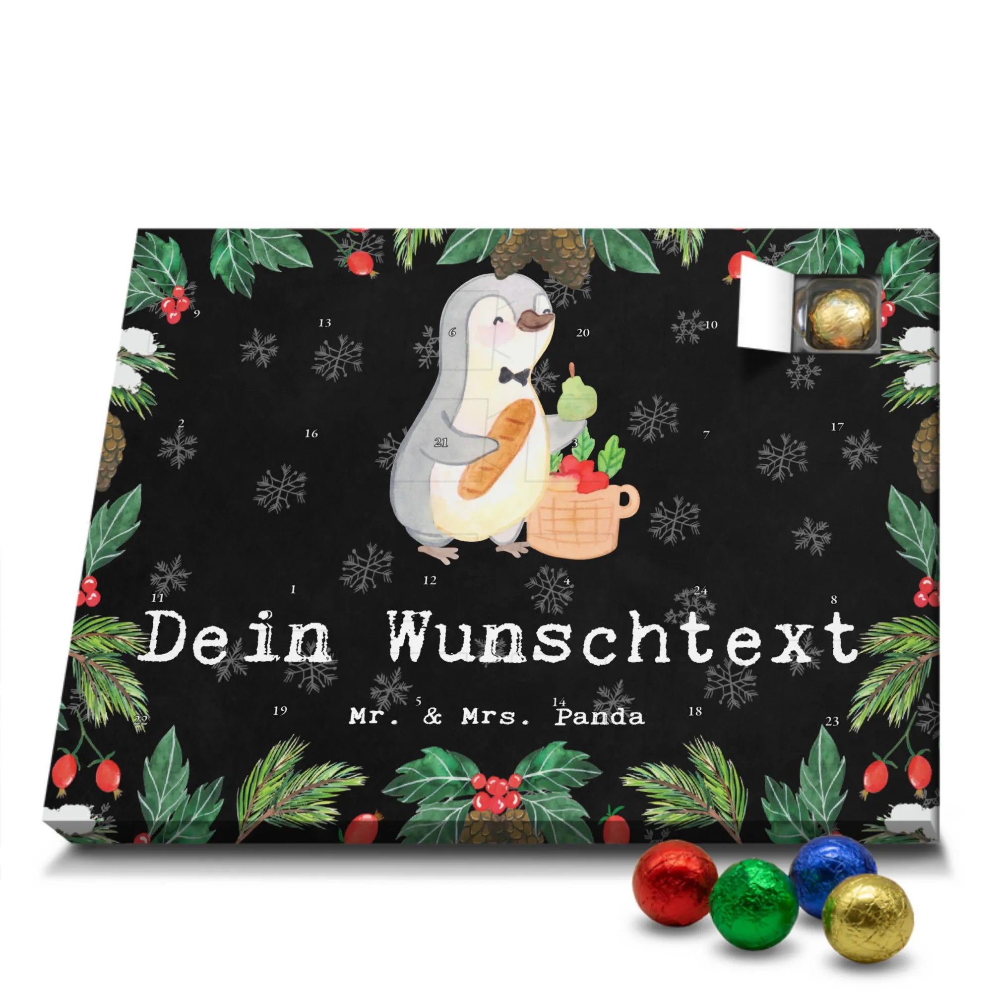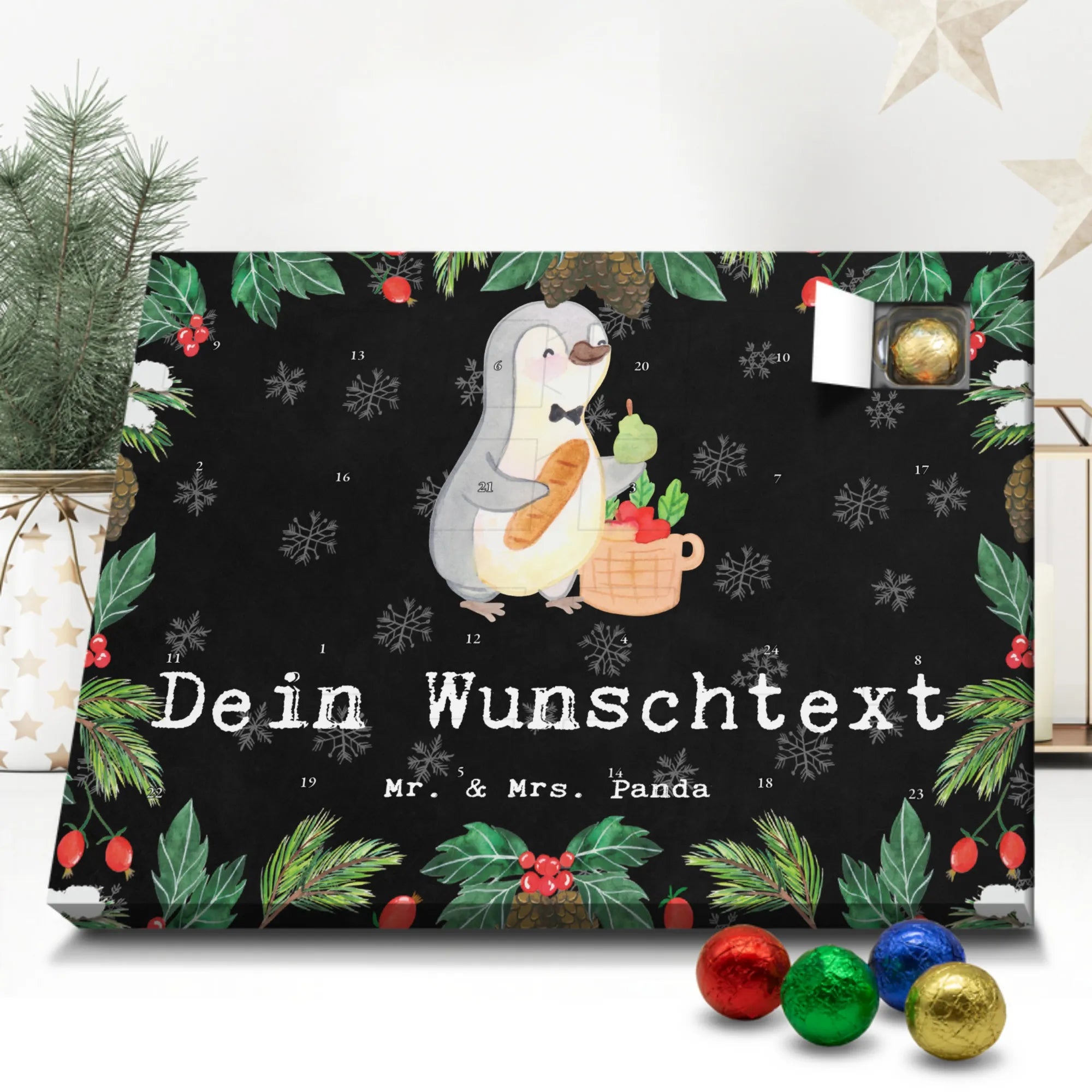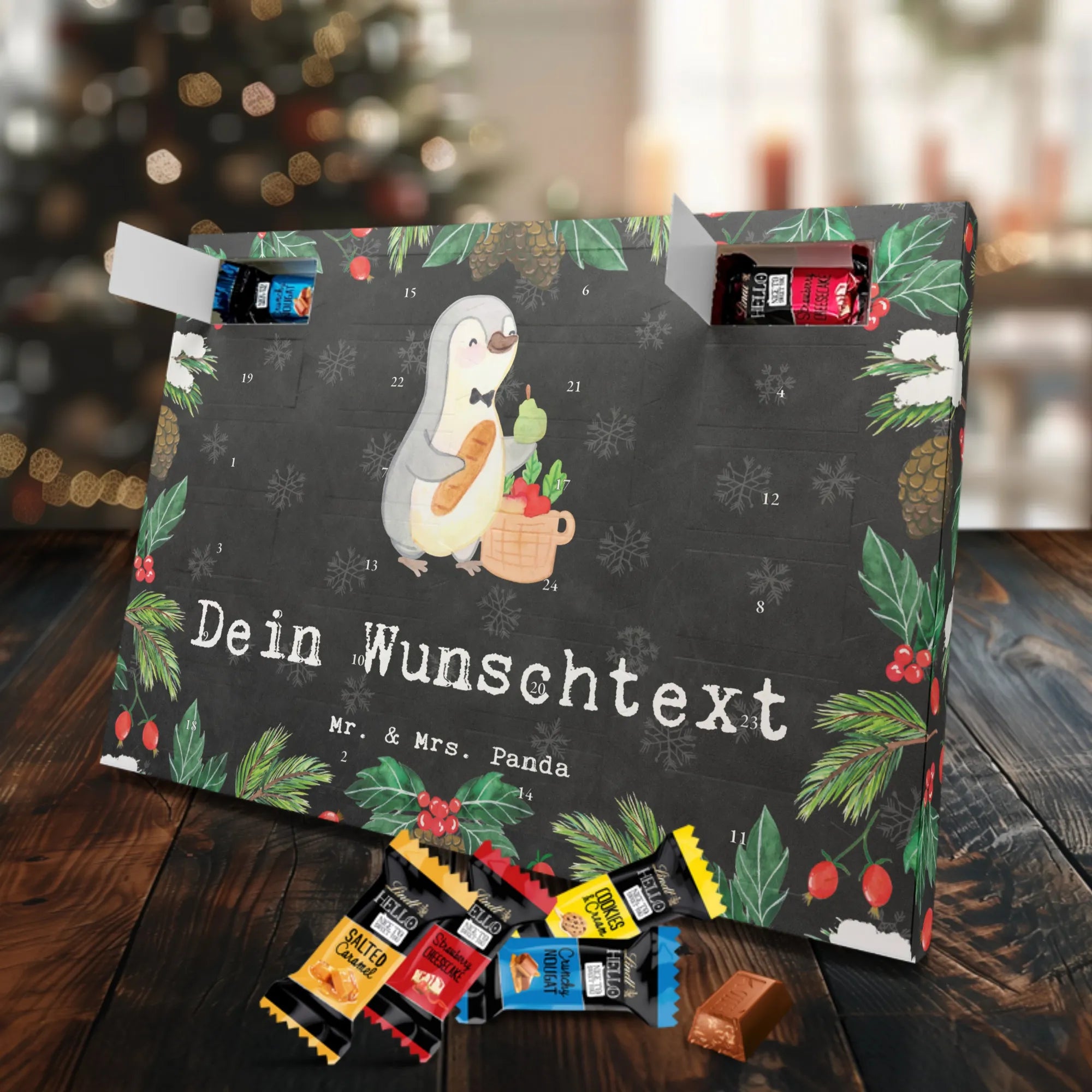 Mach die Adventszeit persönlich mit unserem Personalisierter Adventskalender mit Schokolade von Mr. & Mrs. Panda. Jeder Kalender ist liebevoll illustriert und bedruckt mit charmanten Sprüchen und Motiven – perfekt als Geschenk oder Deko für dein Zuhause. Du kannst deinen Wunschname oder einen kurzen Text hinzufügen, damit der Kalender ganz individuell wird. Die brillante Druckqualität und die seidenmatte Oberflächenveredelung sorgen für eine edle Optik, und auch die Seitenflächen sind komplett bedruckt. Maße: 233 mm x 178 mm x 24 mm. Die clevere Konstruktion erlaubt es, den Kalender aufzuhängen oder aufzustellen – flexibel und dekorativ zugleich. Gefüllt mit MARKENNAMEN Schokolade sowie köstlichen Schokoladenkugeln ist jeder Tag im Advent eine süße Überraschung. Wichtiger Hinweis: (Kann Spuren von Haselnüssen, Mandeln, Gluten und Soja enthalten!), kühl und trocken lagern! Egal ob für Kinder, Partner oder beste Freundin – dieser personalisierte Adventskalender bringt ein Lächeln und zaubert gemütliche Vorfreude. Bestell jetzt und gestalte deine Adventszeit mit einem Hauch Mr. & Mrs. Panda.