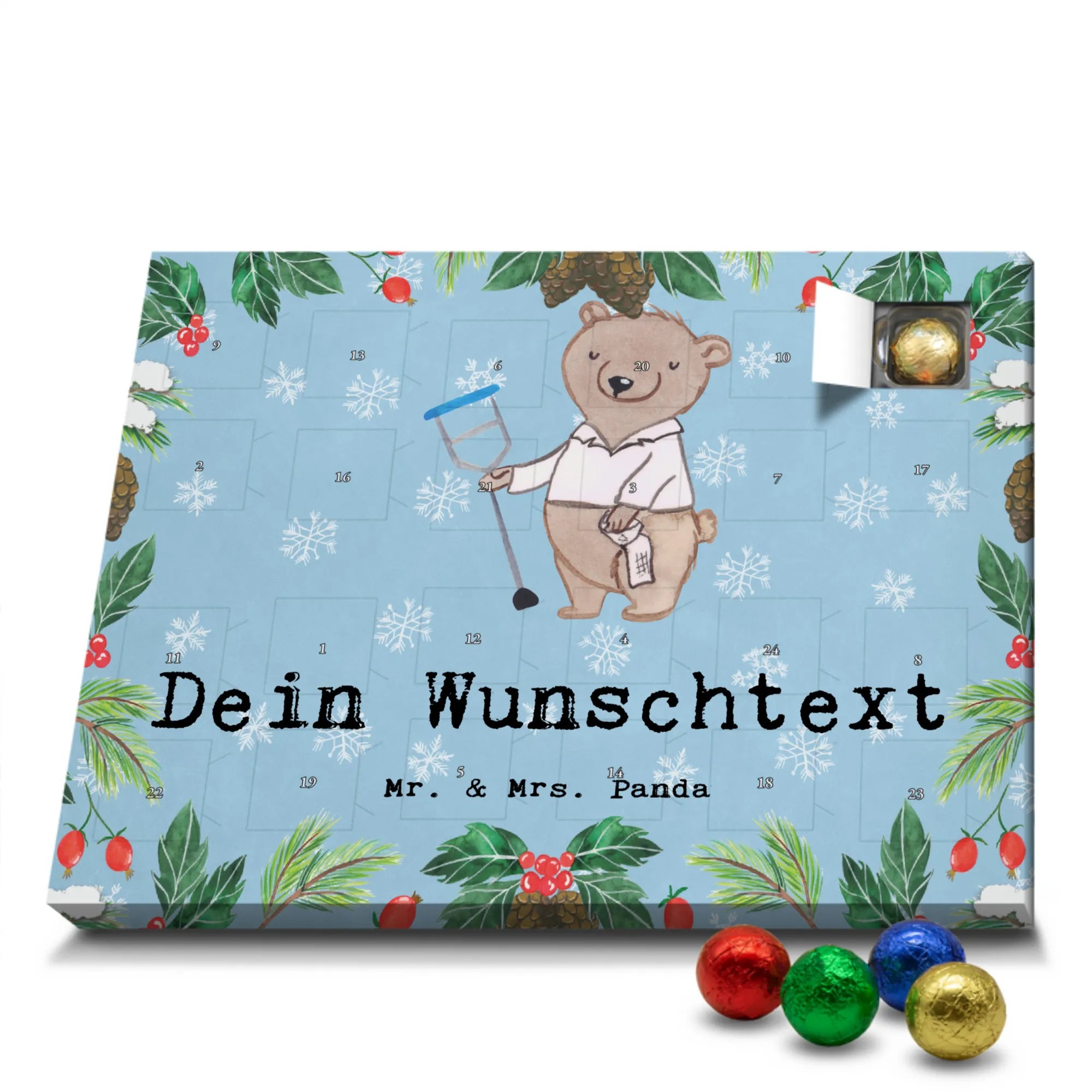 🐼 Personalisierter Adventskalender mit Wunschtext, seidenmatte Oberfläche, bedruckte Seitenflächen.