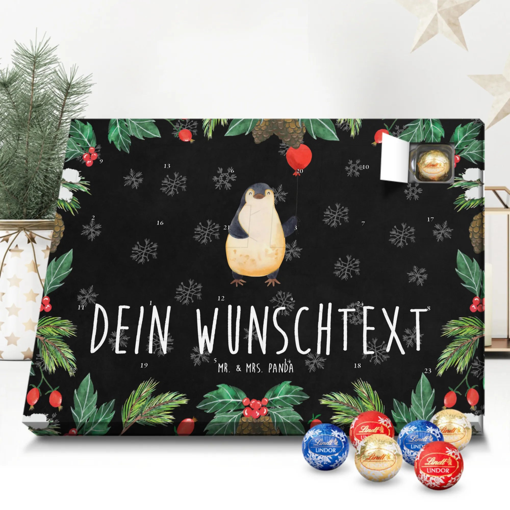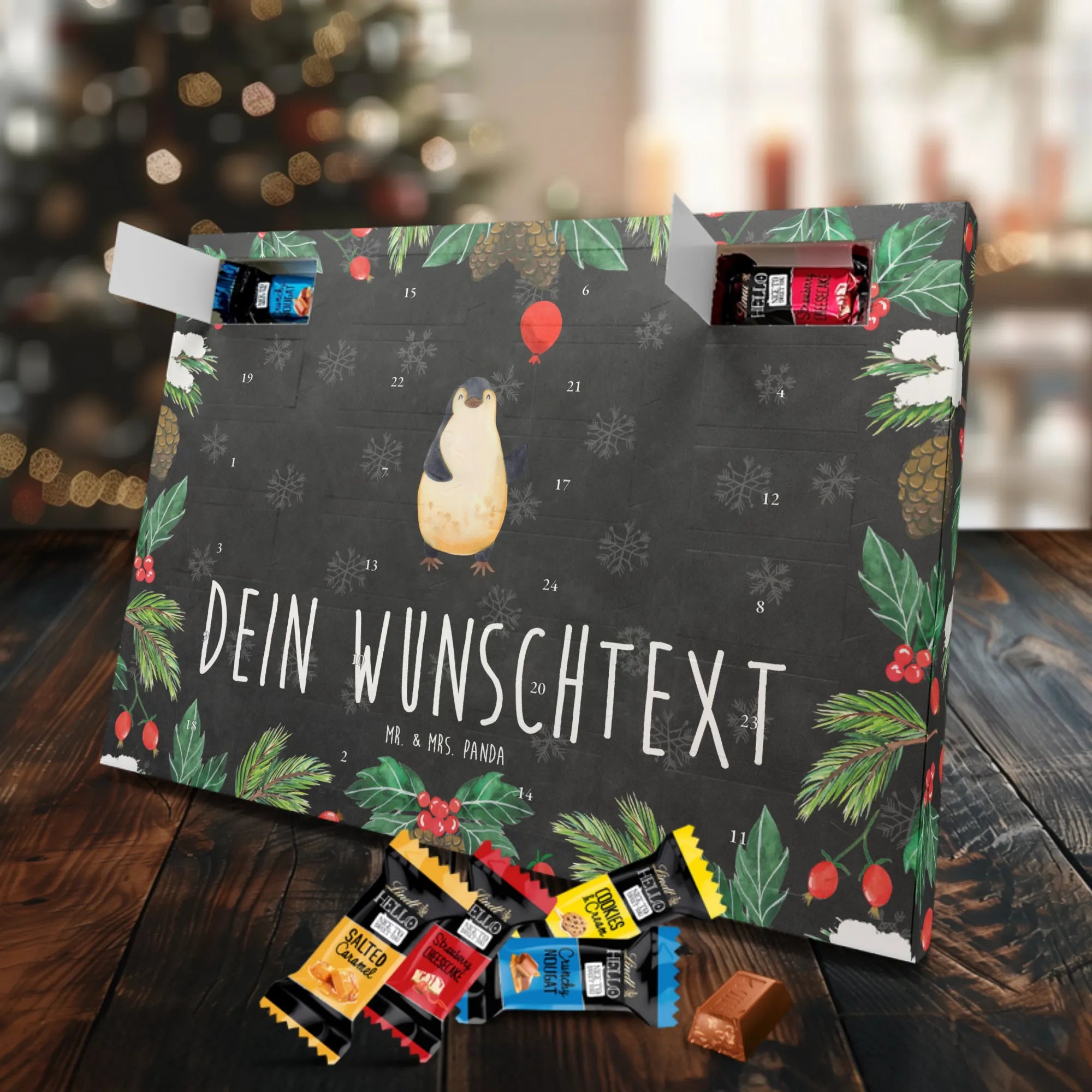 Personalisierter Schoko-Adventskalender von Mr. & Mrs. Panda – dein persönlicher Begleiter bis Weihnachten! Dieser zauberhafte Adventskalender ist bedruckt mit liebevollen Motiven und witzigen Sprüchen von Mr. & Mrs. Panda und lässt sich ganz einfach mit deinem Wunschtext oder Namen individualisieren. Die brillante Druckqualität in Kombination mit einer seidenmatten Oberflächenveredelung verleiht dem Kalender eine hochwertige Optik; auch die Seitenflächen sind bedruckt für ein rundum schönes Erscheinungsbild. Maße: 233 mm x 178 mm x 24 mm. Besonders praktisch: Du kannst den Kalender aufstellen oder an die Wand hängen – je nachdem, wo er am besten wirkt. Gefüllt mit Lindt Lindor Schokolade: 24 einzeln verpackte Markenschokoladen Kugeln in drei leckeren Sorten. Geschmacksrichtungen: Vollmilch, Feinherb und Weiße Schokolade. Zutaten: Zucker, pflanzliches Fett (Kokosnuss, Palmkern), Kakaobutter, Vollmilchpulver, Kakaomasse, Milchzucker, Magermilchpulver, Butterreinfett, Emulgator (Sojalecithin), Gerstenmalzextrakt, Aromen. Besondere Hinweise: Kann Haselnüsse und Mandeln enthalten. Ideal als Geschenk für Kinder, Partner oder beste Freunde – ein täglicher Schoko-Moment mit persönlicher Note.