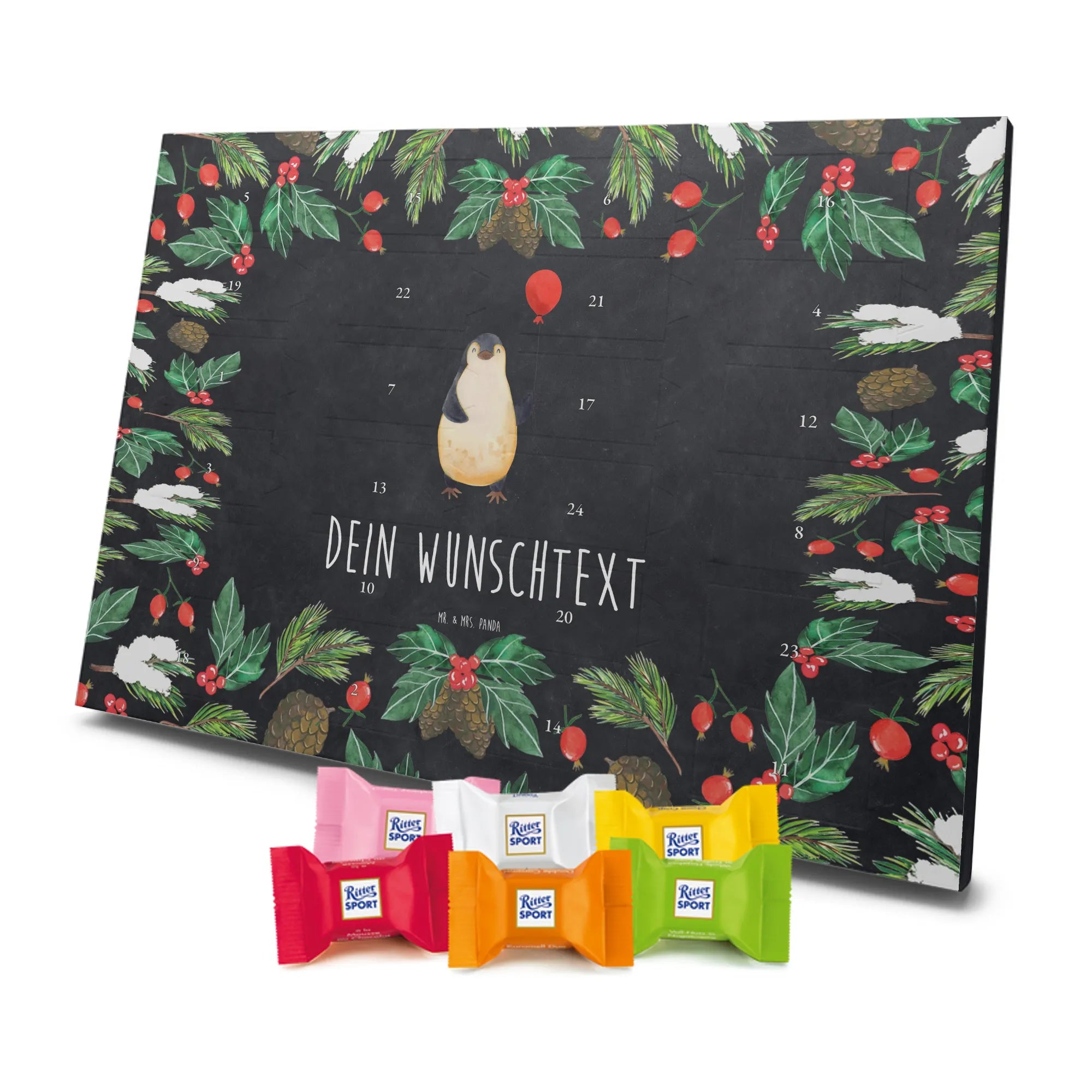 Suchst du einen besonderen Adventskalender, der persönlich und hochwertig ist? Unser Adventskalender mit Namen von Mr. & Mrs. Panda ist genau das – individualisierbar mit dem Namen deiner Liebsten oder einem kurzen Spruch und bedruckt mit unseren beliebten, charmanten Motiven. Die Druckqualität ist brillant, die seidenmatte Oberflächenveredelung verleiht dem Kalender eine elegante Haptik. Auch die Seitenflächen sind liebevoll bedruckt, sodass das Design rundum überzeugt. Du kannst den Kalender aufstellen oder an einer Stelle aufhängen, die du magst – die besondere Form macht beides möglich. Gefüllt ist der Kalender mit Ritter Sport Schokowürfeln in sechs beliebten Sorten: Mousse au Chocolat, Schoko Crisp, Voll-Nuss in Nougatcreme, Karamell Duo, Joghurt und Erdbeer-Joghurt. So gibt es hinter jedem Türchen eine kleine, leckere Überraschung. Maße: 325 mm x 225 mm x 27 mm – kompakt genug, um überall Platz zu finden, groß genug für 24 sorgfältig verpackte Schokowürfel.