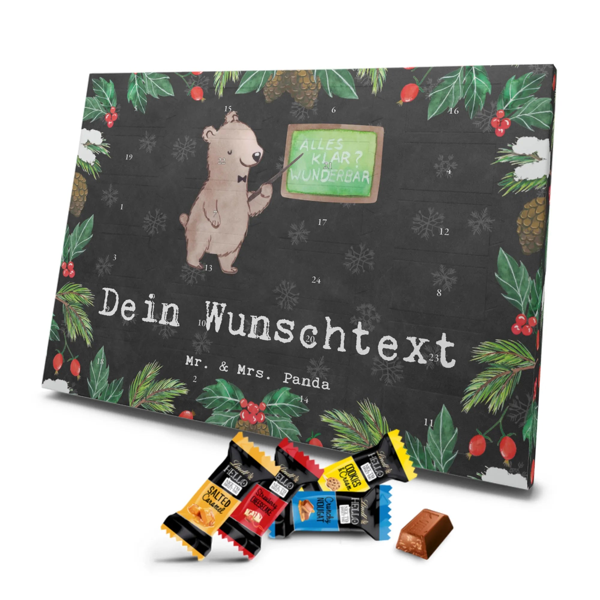 🐼 PERSONALISIERTER SCHOKO-ADVENTSKALENDER: Mit Wunschtext, bedruckt mit Mr. & Mrs. Panda Motiven, gefüllt mit MARKENNAMEN Schokolade.