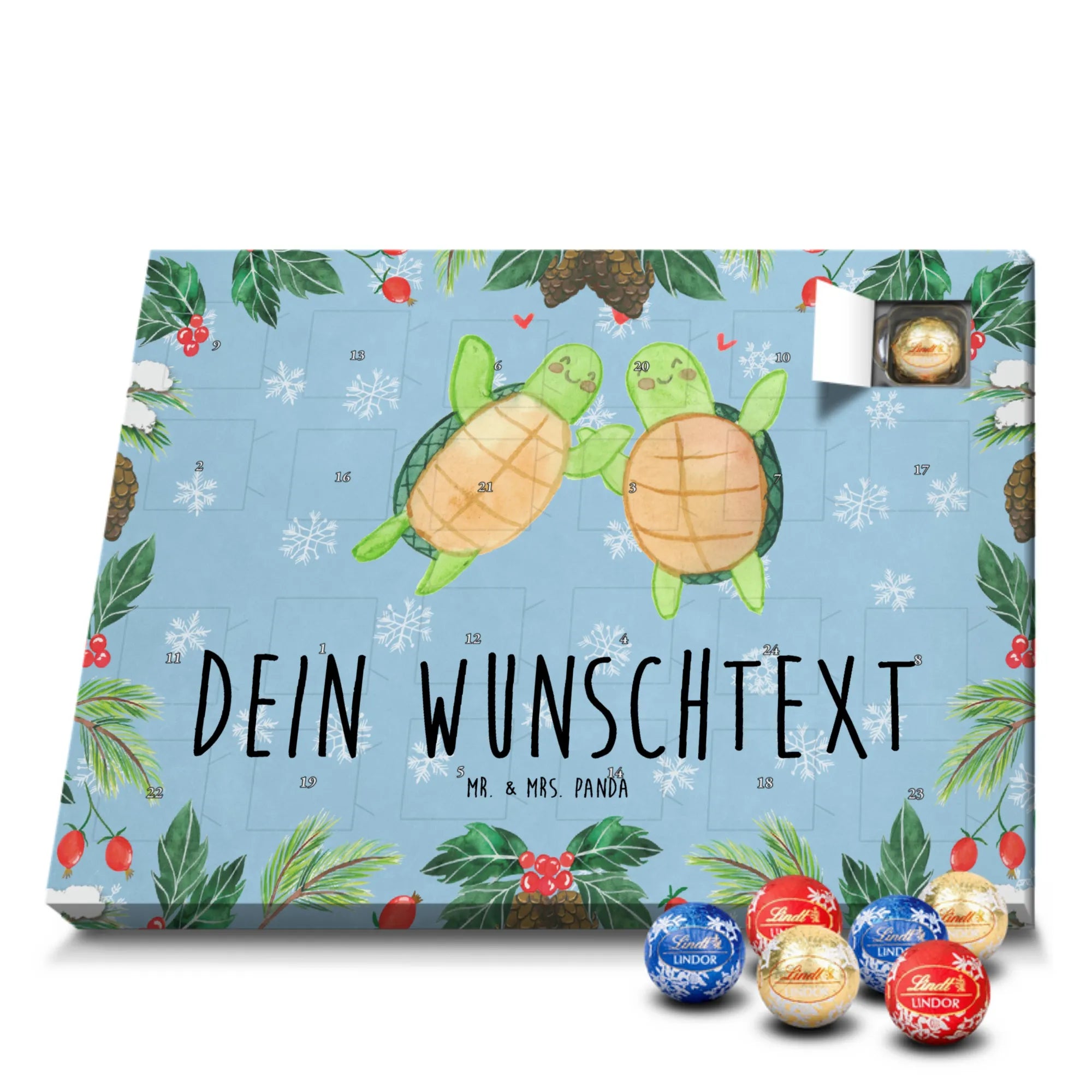Personalisierter Schoko Adventskalender „Schildkröten Paar“ – die perfekte Liebesüberraschung für deinen Schatz! 💕 Dieser Adventskalender aus der Liebe-Kollektion von Mr. & Mrs. Panda verbindet liebevolle Aquarell-Illustration mit zarter, seidenmatter Veredelung und bringt 24 süße Überraschungen in den Advent.