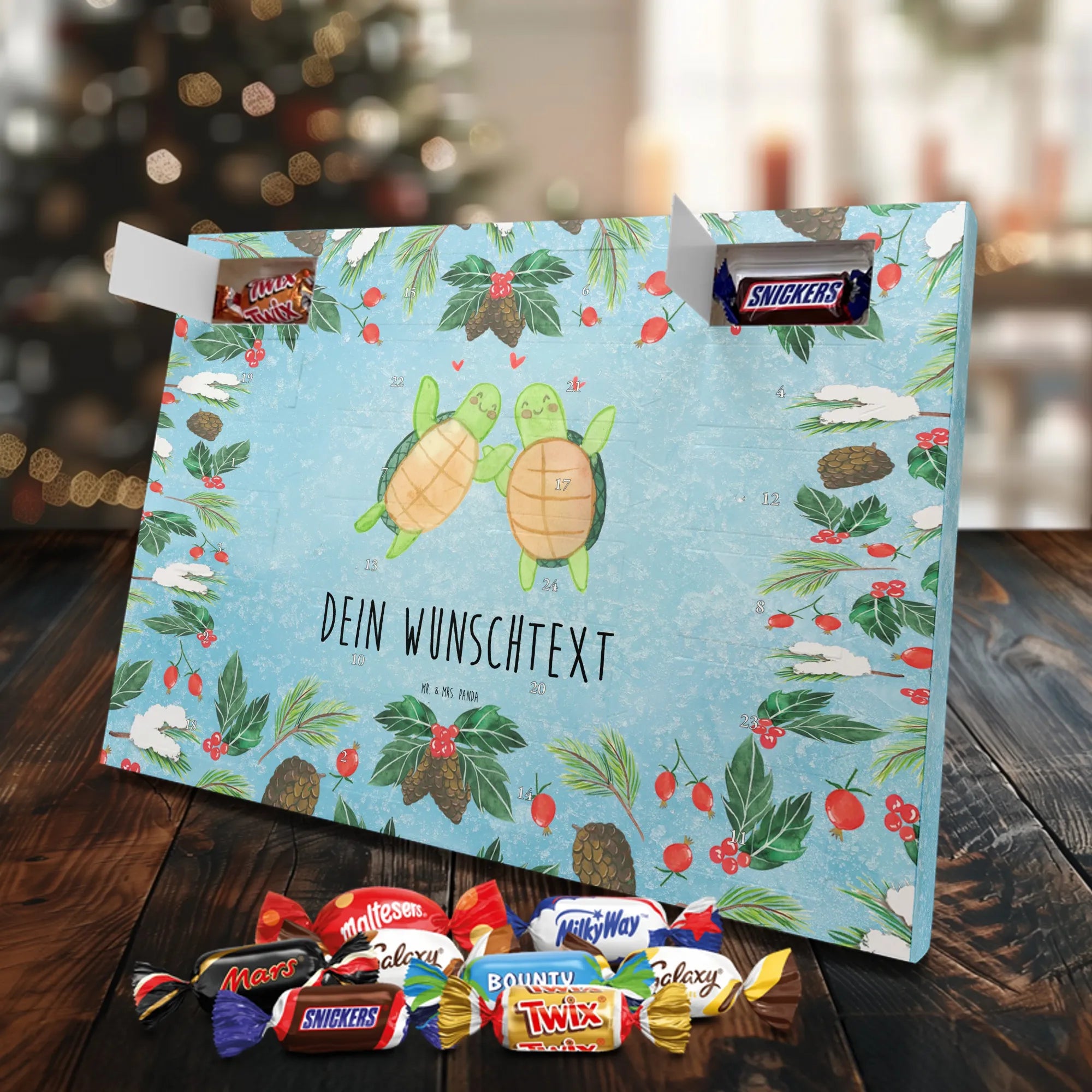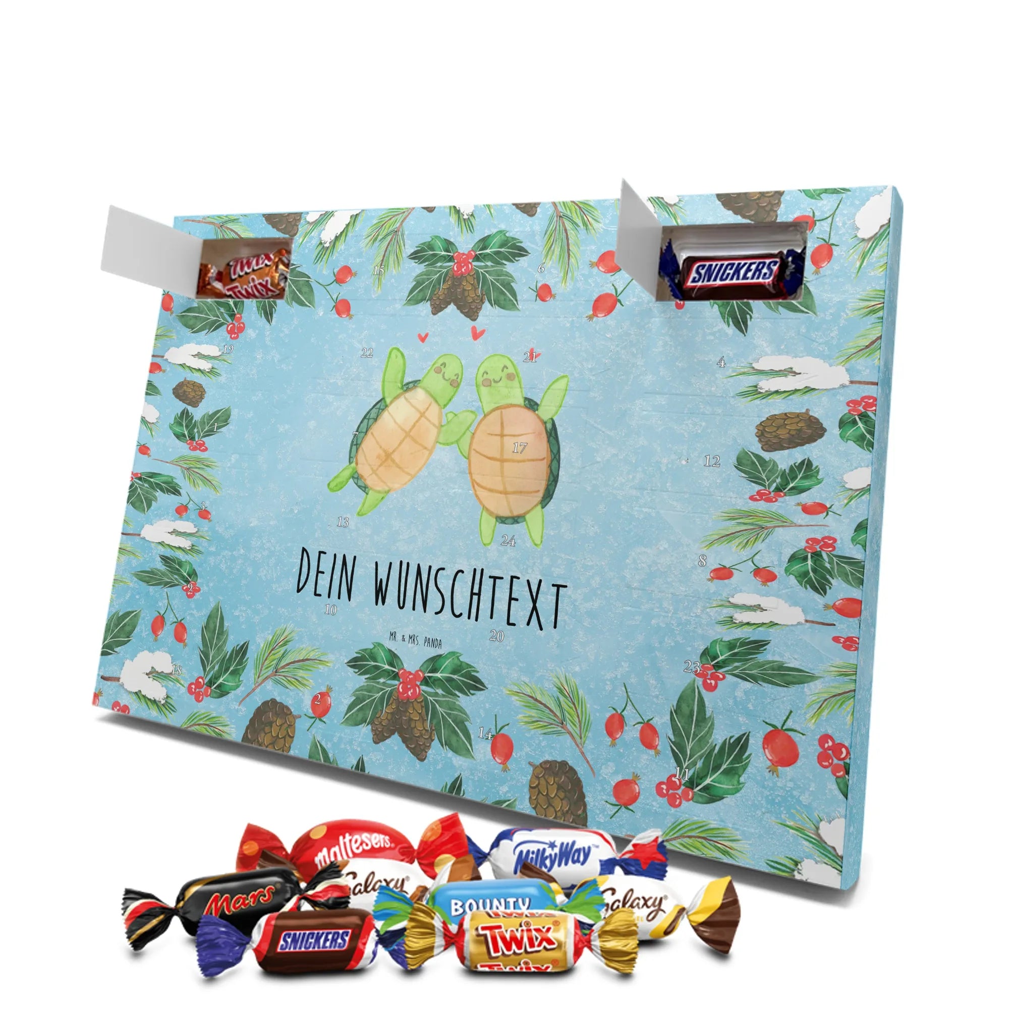 Personalisierter Schoko-Adventskalender von Mr. & Mrs. Panda – liebevoll gestaltet und ideal als individuelles Geschenk in der Adventszeit. Wir bedrucken den Kalender mit zauberhaften Motiven & herzlichen Sprüchen und personalisieren ihn mit deinem Wunschnamen oder Wunschtext. Die hochwertige Druckqualität kombiniert mit einer seidenmatten Oberflächenveredelung sorgt für ein edles Erscheinungsbild, und die bedruckten Seitenflächen geben dem Motiv zusätzlichen Charme. Der Kalender kann aufgehängt oder aufgestellt werden, sodass du ihn flexibel platzieren kannst. Gefüllt ist der Kalender mit Celebrations, die 24 hochwertige Überraschungen in 8 verschiedenen Sorten beinhalten: Maltesers, Mars, Snickers, Twix, Milky Way, Bounty, Galaxy und Galaxy Caramel. Maße: 325 mm x 225 mm x 27 mm – handlich und doch großzügig für die kleinen Leckereien hinter den Türchen. Ob für Kinder, Partner oder beste Freunde: dieser personalisierte Schoko-Adventskalender macht das Warten auf Weihnachten bunter und leckerer. Verschenke eine persönliche Erinnerung und jeden Tag ein kleines Schokoladen-Glück!