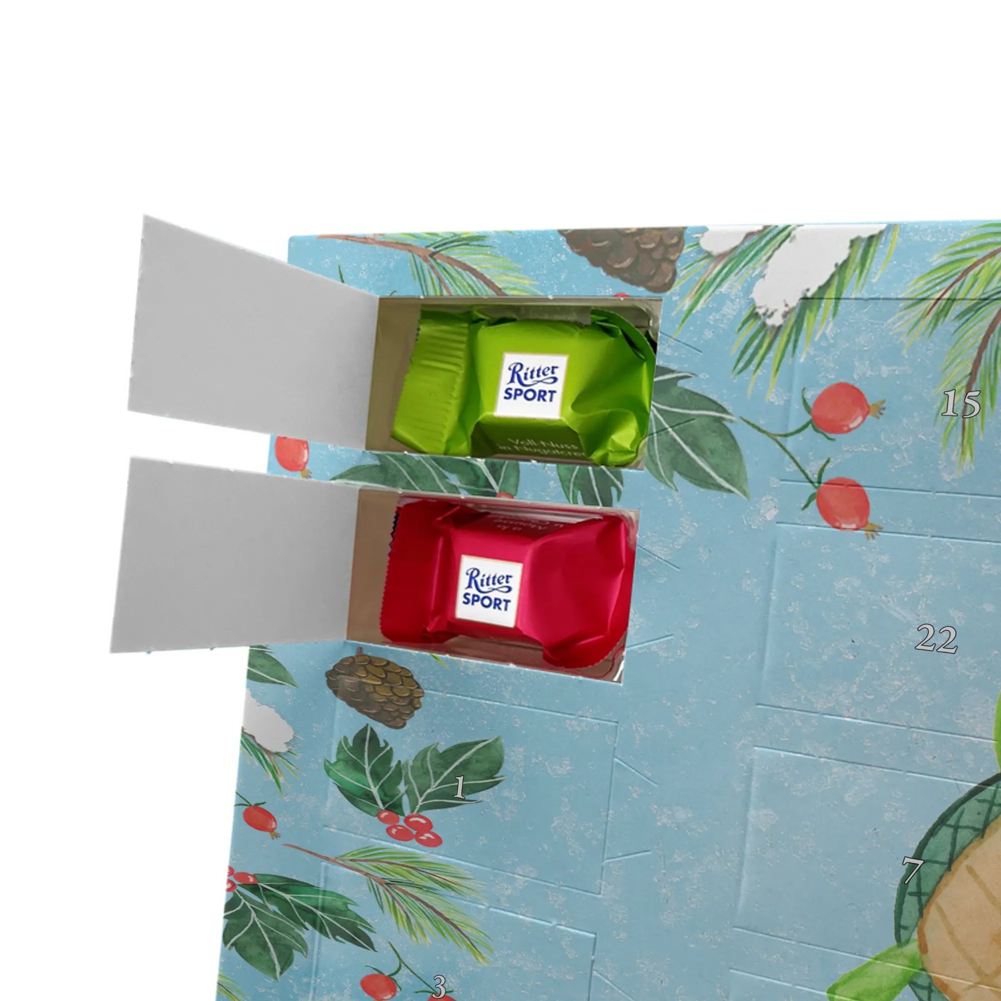 Suchst du einen besonderen Adventskalender, der persönlich und hochwertig ist? Unser Adventskalender mit Namen von Mr. & Mrs. Panda ist genau das – individualisierbar mit dem Namen deiner Liebsten oder einem kurzen Spruch und bedruckt mit unseren beliebten, charmanten Motiven. Die Druckqualität ist brillant, die seidenmatte Oberflächenveredelung verleiht dem Kalender eine elegante Haptik. Auch die Seitenflächen sind liebevoll bedruckt, sodass das Design rundum überzeugt. Du kannst den Kalender aufstellen oder an einer Stelle aufhängen, die du magst – die besondere Form macht beides möglich. Gefüllt ist der Kalender mit Ritter Sport Schokowürfeln in sechs beliebten Sorten: Mousse au Chocolat, Schoko Crisp, Voll-Nuss in Nougatcreme, Karamell Duo, Joghurt und Erdbeer-Joghurt. So gibt es hinter jedem Türchen eine kleine, leckere Überraschung. Maße: 325 mm x 225 mm x 27 mm – kompakt genug, um überall Platz zu finden, groß genug für 24 sorgfältig verpackte Schokowürfel.