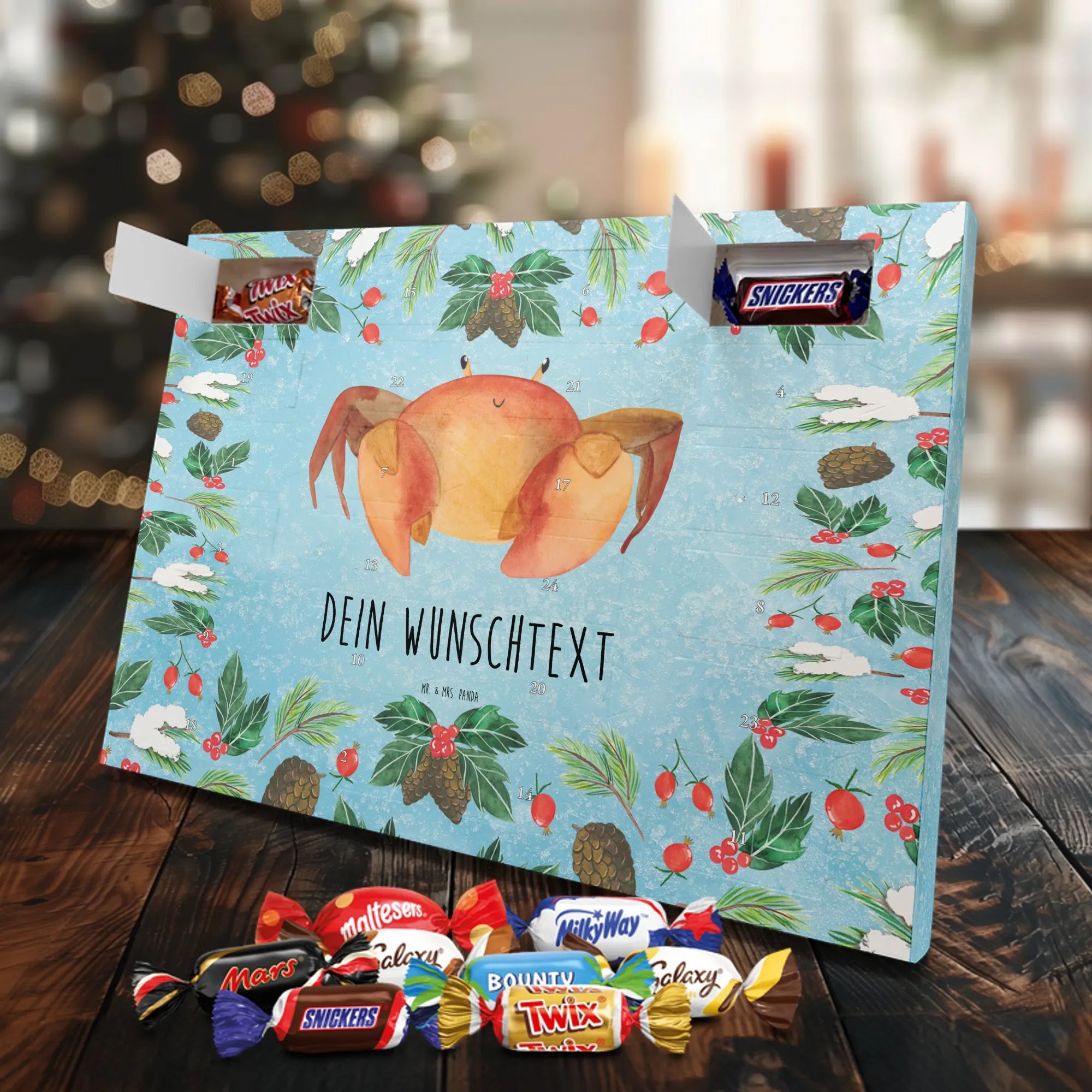 Adventskalender mit Namen von Mr. & Mrs. Panda – die süße und persönliche Art, die Adventszeit zu feiern! Dieser liebevoll gestaltete Adventskalender ist bedruckt mit zauberhaften Motiven & Sprüchen von Mr. & Mrs. Panda und lässt sich ganz nach deinem Geschmack personalisieren: Dein Name oder ein kurzer Wunschtext wird hochwertig aufgedruckt. Die brillante Druckqualität kombiniert mit einer seidenmatten Oberflächenveredelung sorgt für ein edles Finish, und auch die Seitenflächen sind hübsch bedruckt, sodass das Design aus jedem Blickwinkel wirkt. Besonders praktisch: Du kannst den Kalender aufhängen oder einfach aufstellen – perfekt für den Weihnachtsbaum, die Wand oder das Regal. Der Kalender ist gefüllt mit Celebrations und beinhaltet 24 leckere Füllungen in 8 verschiedenen Sorten wie Maltesers, Mars, Snickers, Twix, Milky Way, Bounty, Galaxy und Galaxy Caramel – für jeden Tag bis Heiligabend eine kleine Freude. Maße: 325 mm x 225 mm x 27 mm – handlich und trotzdem großzügig genug für die Schoko-Überraschungen. Verschenke Vorfreude und Persönlichkeit in einem – ideal für Freunde, Familie oder als liebevolle Aufmerksamkeit für dich selbst.