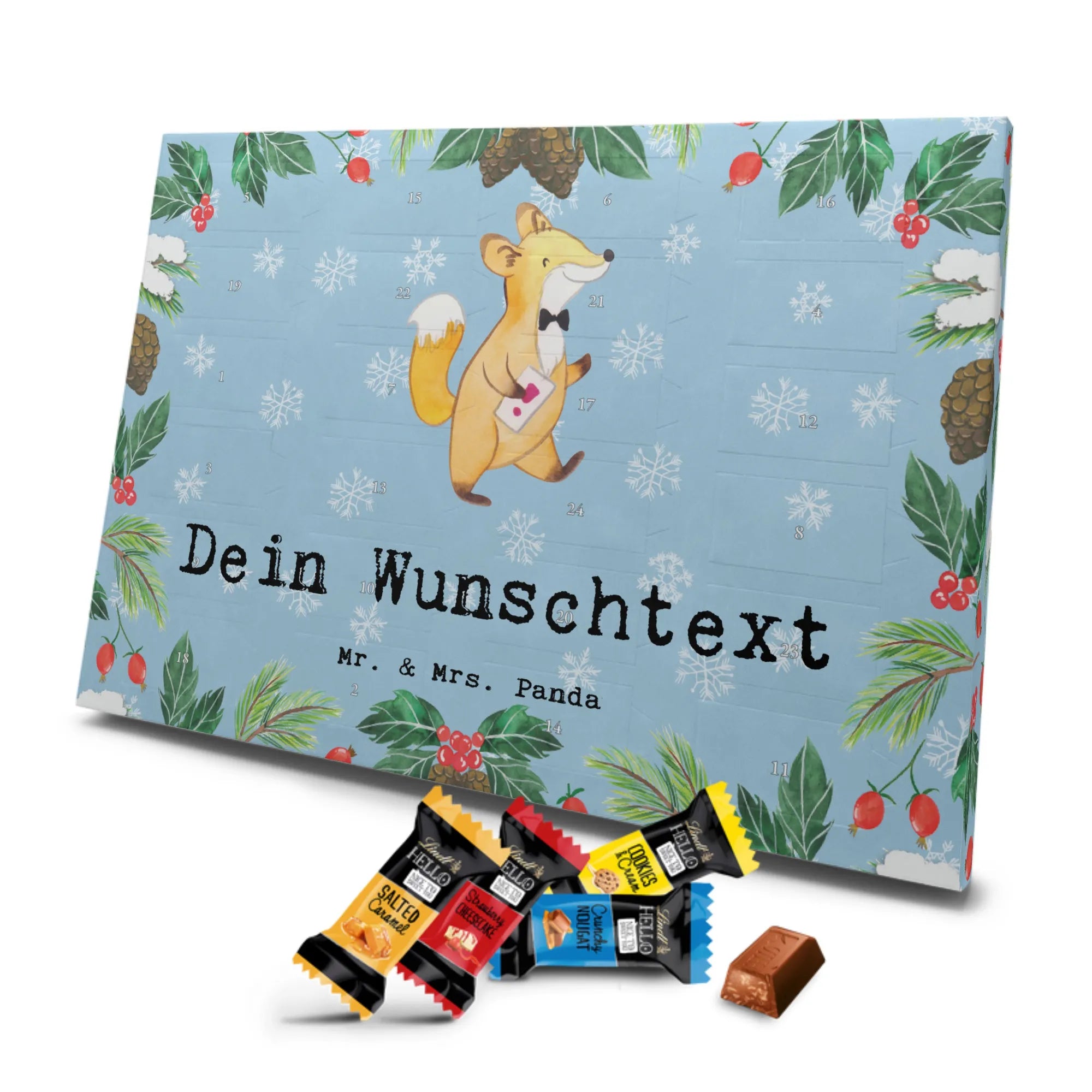 Unser Personalisierter Schoko-Adventskalender von Mr. & Mrs. Panda bringt Freude ins Adventsfenster und zaubert jedem ein Lächeln aufs Gesicht. Du gestaltest ihn ganz individuell: wähle deinen Wunschtext oder Namen und wir drucken ihn auf den Kalender – inklusive bedruckter Seitenflächen für ein rundum schönes Ergebnis. Die seidenmatte Oberflächenveredelung sorgt für eine elegante Haptik, während die brillante Druckqualität die Motive zum Strahlen bringt. Der Kalender ist flexibel einsetzbar, denn er kann aufgehängt oder einfach aufgestellt werden. Gefüllt mit Lindt Hello: 24 einzelne Schokoladen Mini Sticks in vier leckeren Geschmacksrichtungen (Karamell-Schokoladenkuchen, Kekse, Knuspriger Nougat, Erdbeer-Cheesecake). Zutaten und Allergene (Milcheiweiß, Milchzucker, Soja, Weizen, Haselnüsse; kann Mandeln und andere Schalenfrüchte enthalten) sind ausgewiesen. Ideal als persönliches Geschenk für Familienmitglieder, Freundinnen oder für dich selbst – mit viel Liebe gestaltet von Mr. & Mrs. Panda. Maße: 325 mm x 225 mm x 27 mm, praktische Größe für Regal oder Wand.