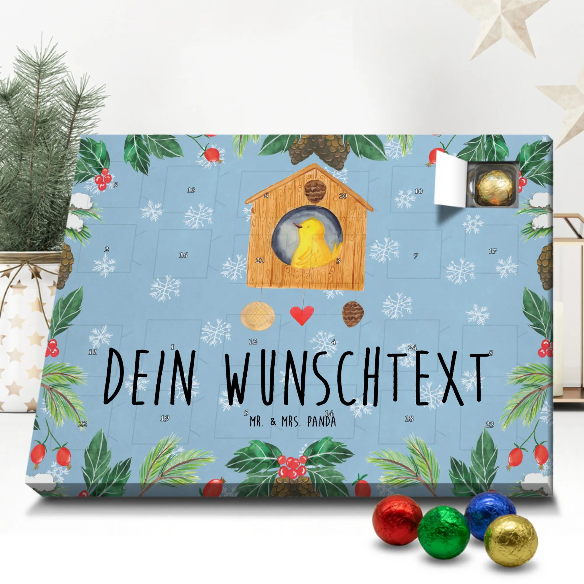 Wunderschöner Personalisierter Schoko Adventskalender von Mr. & Mrs. Panda – ein liebevoll gestalteter Adventskalender, den du ganz nach deinem Geschmack personalisieren kannst. Der Kalender ist bedruckt mit wunderschönen Motiven und herzlichen Sprüchen von Mr. & Mrs. Panda und bietet dir Platz für deinen Wunschnamen oder einen kurzen Wunschtext. Die brillante Druckqualität überzeugt durch eine seidenmatte Oberflächenveredelung, die Farben lebendig und edel wirken lässt. Alle Seitenflächen sind bedruckt, sodass der Kalender von allen Seiten ein Hingucker ist. Maße: 233 mm x 178 mm x 24 mm. Besonders praktisch: Der Kalender kann aufgehängt oder aufgestellt werden – so findest du überall den perfekten Platz für deine Adventszeit. Gefüllt mit MARKENNAMEN Schokolade und leckeren Schokoladenkugeln, sorgt er für süße Vorfreude an jedem Adventstag. Hinweis: (Kann Spuren von Haselnüssen, Mandeln, Gluten und Soja enthalten!), kühl und trocken lagern! Dieser personalisierte Schoko Adventskalender ist das ideale Geschenk für Freunde, Familie oder dich selbst – persönlich, hübsch verpackt und mit liebevollen Details. Bestell ihn schnell und gestalte deinen Advent mit einem Hauch Mr. & Mrs. Panda – individuell, hochwertig und voller Charme.
