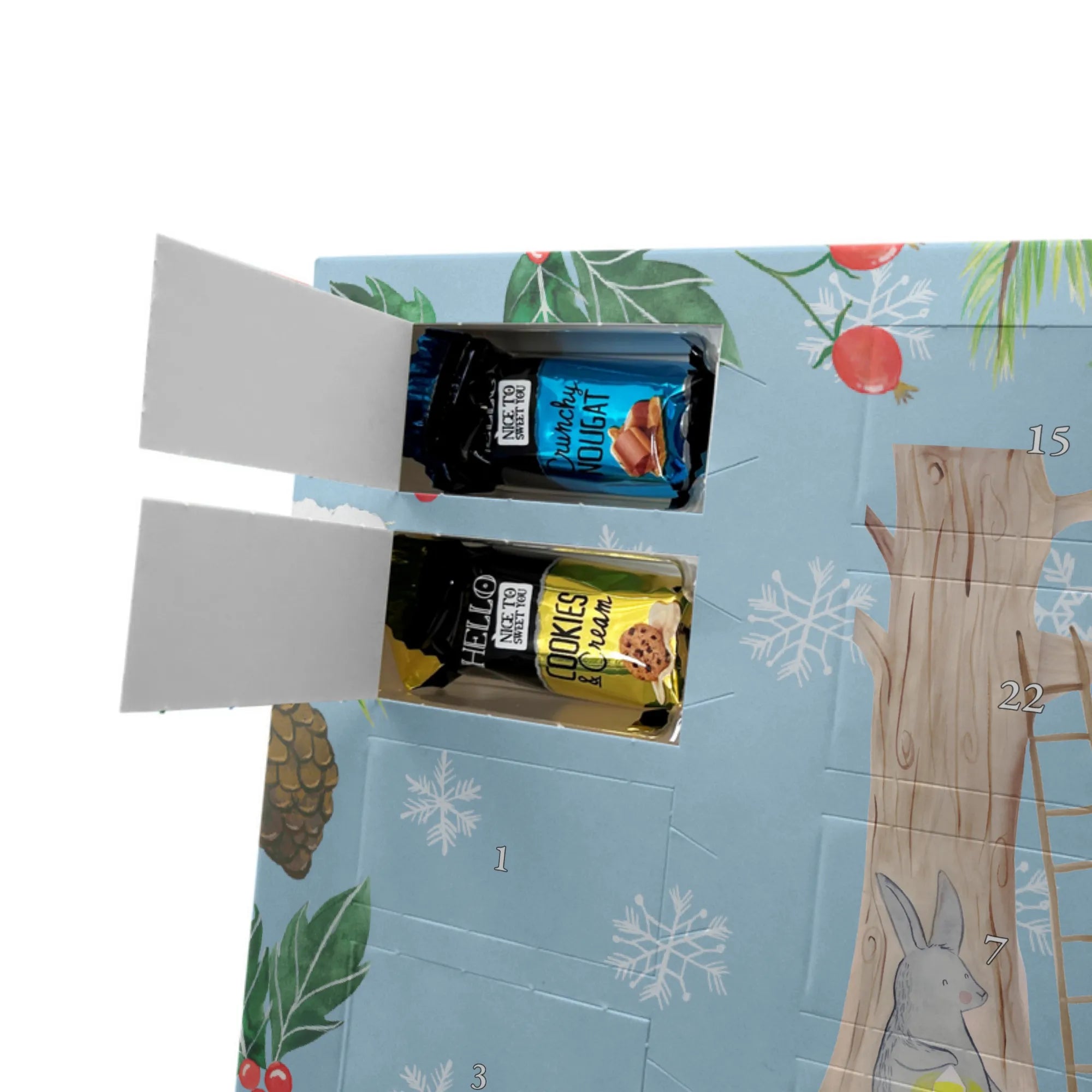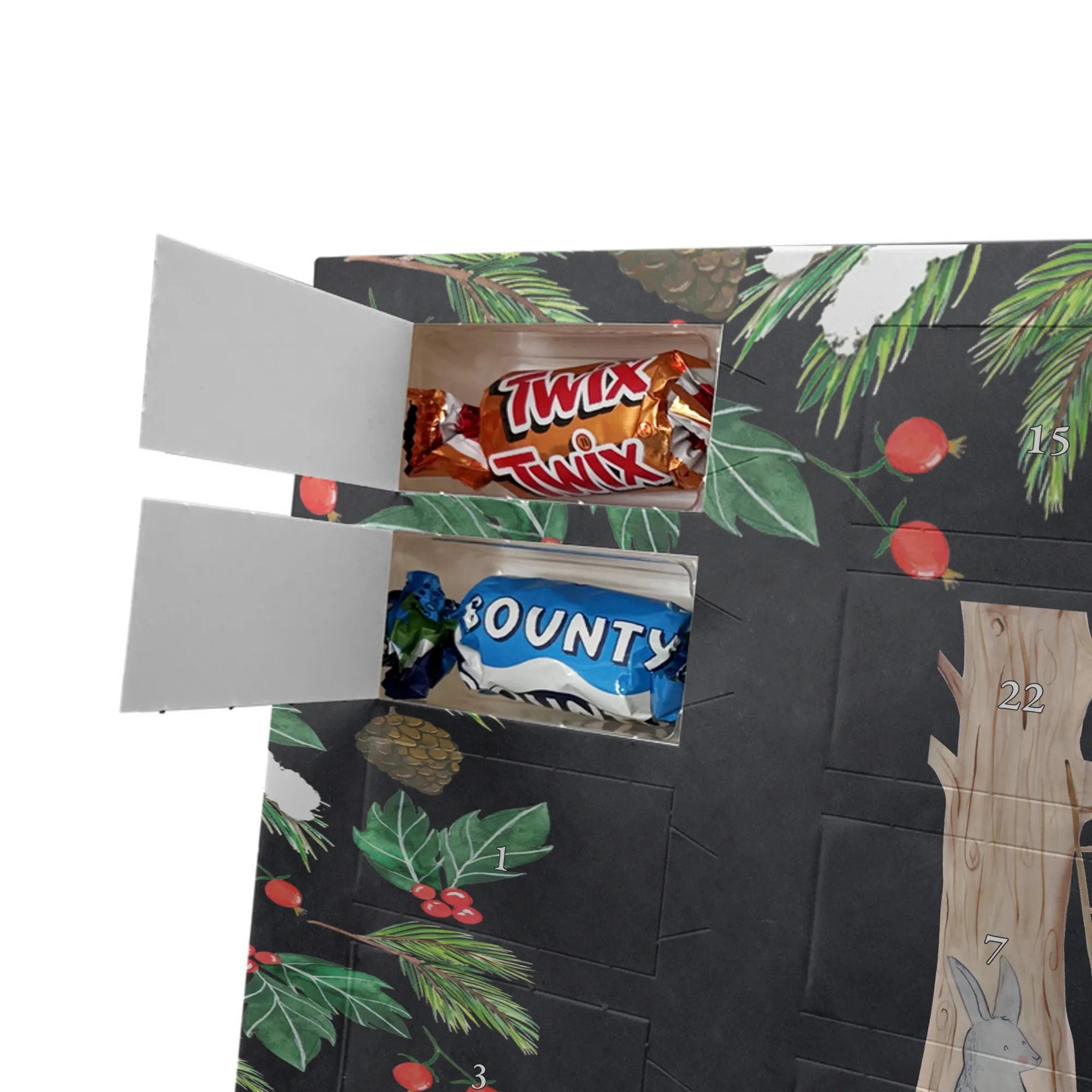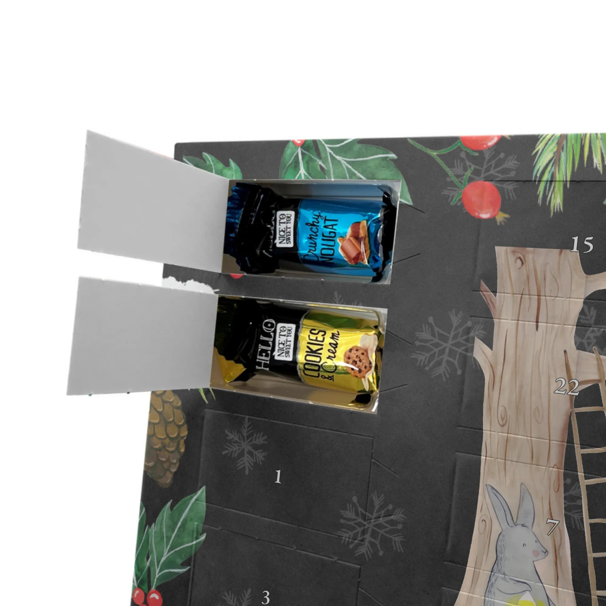 Personalisierter Schoko-Adventskalender von Mr. & Mrs. Panda – liebevoll gestaltet und ideal als individuelles Geschenk in der Adventszeit. Wir bedrucken den Kalender mit zauberhaften Motiven & herzlichen Sprüchen und personalisieren ihn mit deinem Wunschnamen oder Wunschtext. Die hochwertige Druckqualität kombiniert mit einer seidenmatten Oberflächenveredelung sorgt für ein edles Erscheinungsbild, und die bedruckten Seitenflächen geben dem Motiv zusätzlichen Charme. Der Kalender kann aufgehängt oder aufgestellt werden, sodass du ihn flexibel platzieren kannst. Gefüllt ist der Kalender mit Celebrations, die 24 hochwertige Überraschungen in 8 verschiedenen Sorten beinhalten: Maltesers, Mars, Snickers, Twix, Milky Way, Bounty, Galaxy und Galaxy Caramel. Maße: 325 mm x 225 mm x 27 mm – handlich und doch großzügig für die kleinen Leckereien hinter den Türchen. Ob für Kinder, Partner oder beste Freunde: dieser personalisierte Schoko-Adventskalender macht das Warten auf Weihnachten bunter und leckerer. Verschenke eine persönliche Erinnerung und jeden Tag ein kleines Schokoladen-Glück!