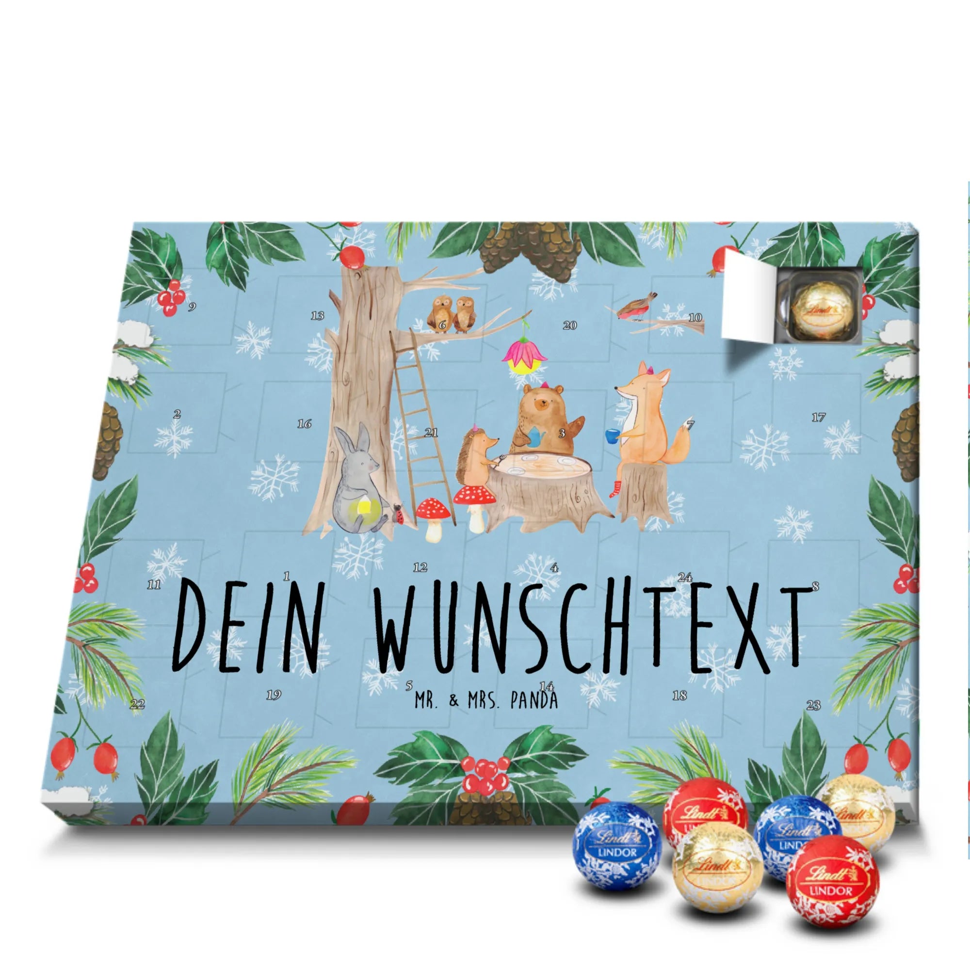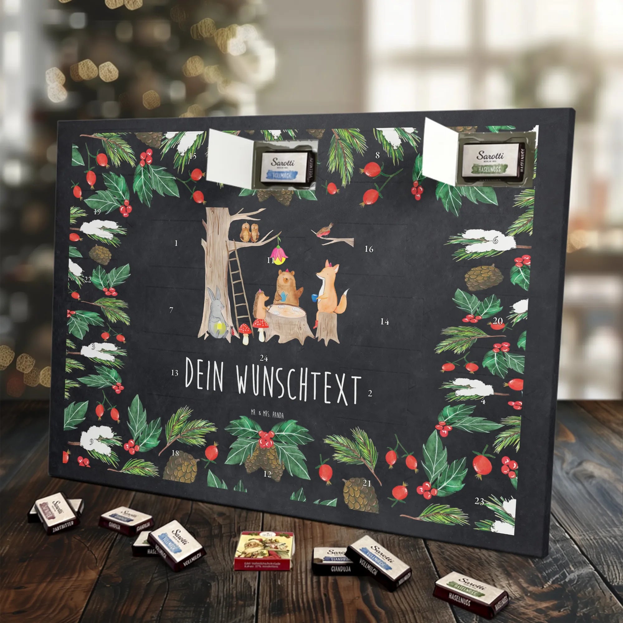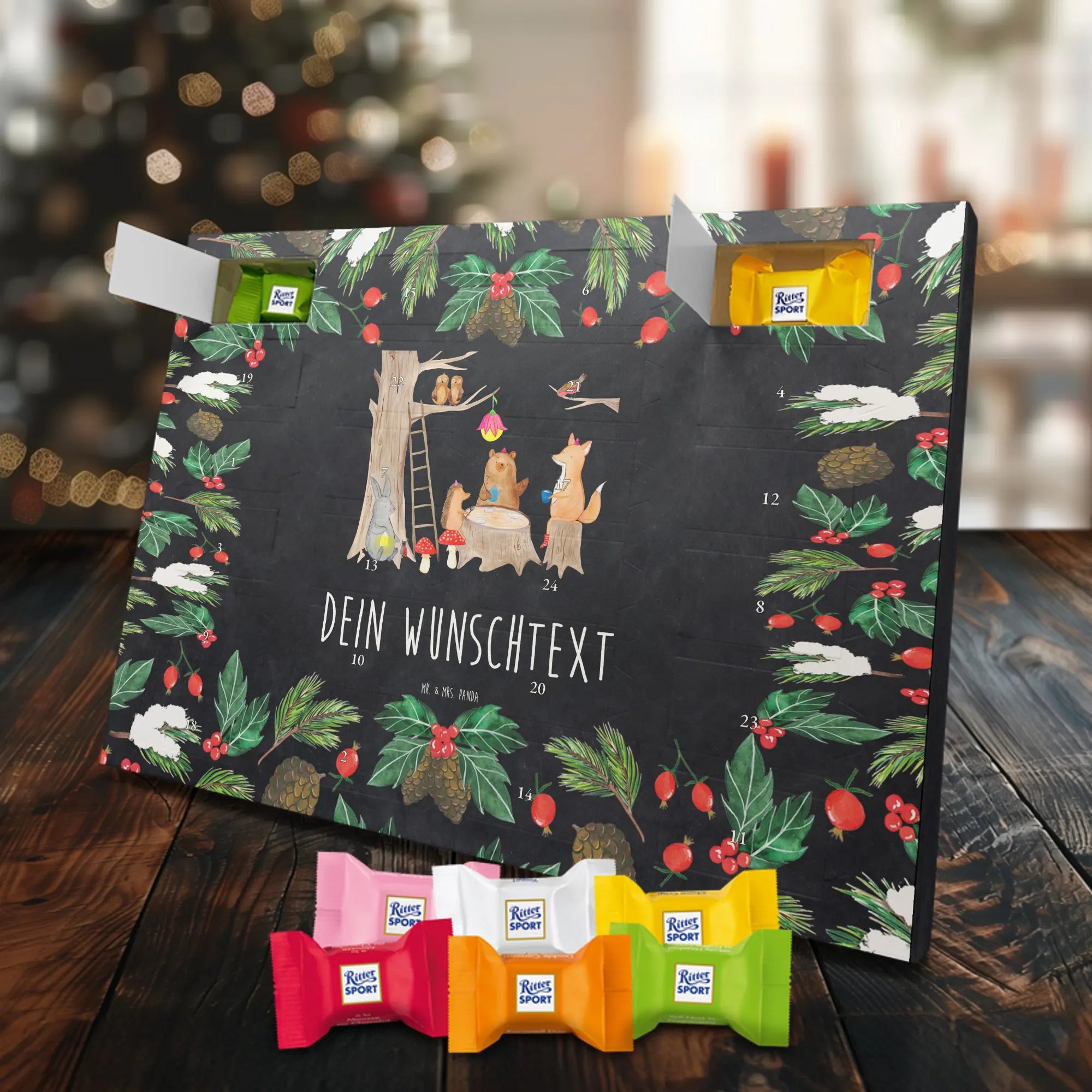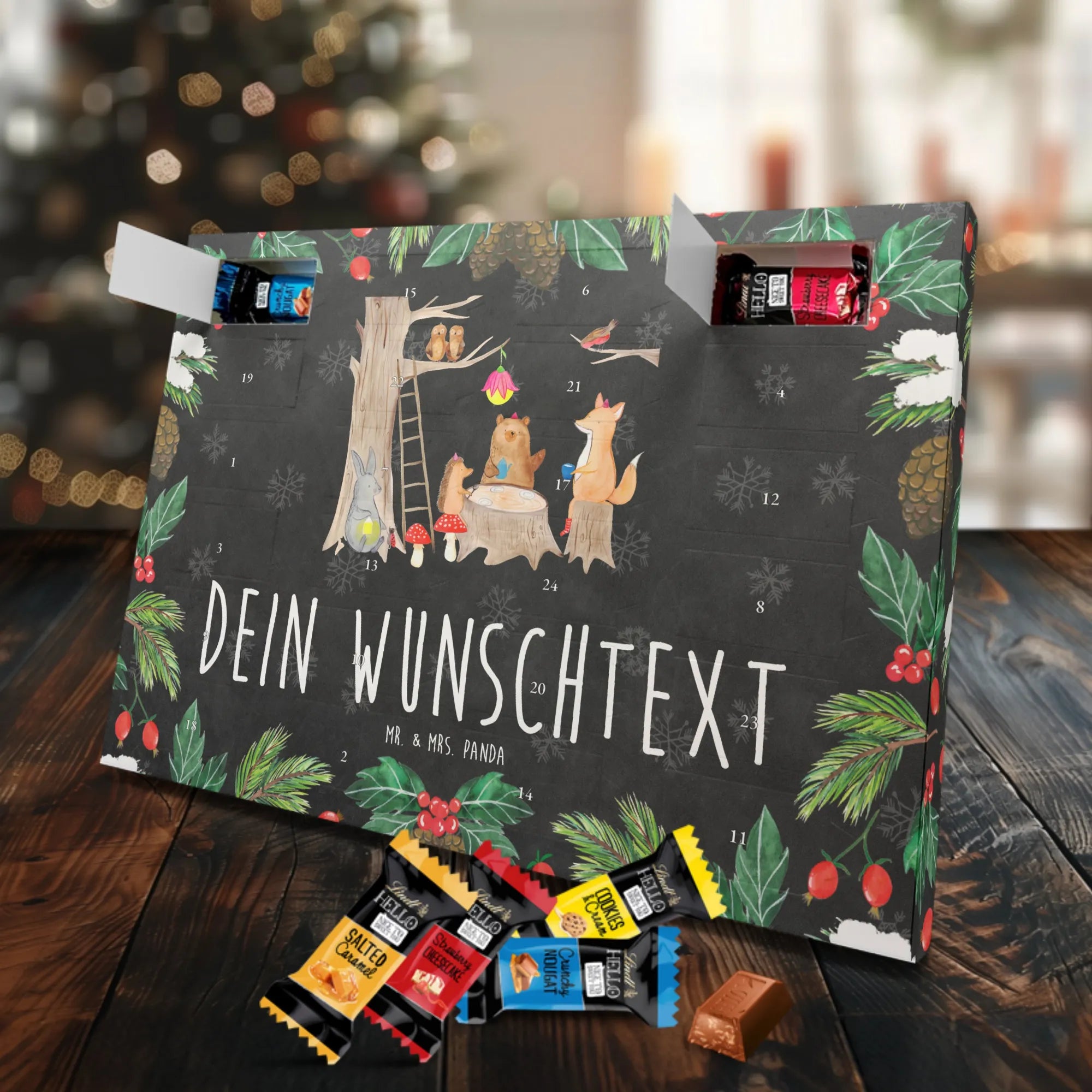 Warum du ihn liebst: Charmantes Waldmotiv, persönliche Namensoption, leckere Markenschokolade und hochwertige Verarbeitung – ein Adventskalender mit Herz von Mr. & Mrs. Panda.