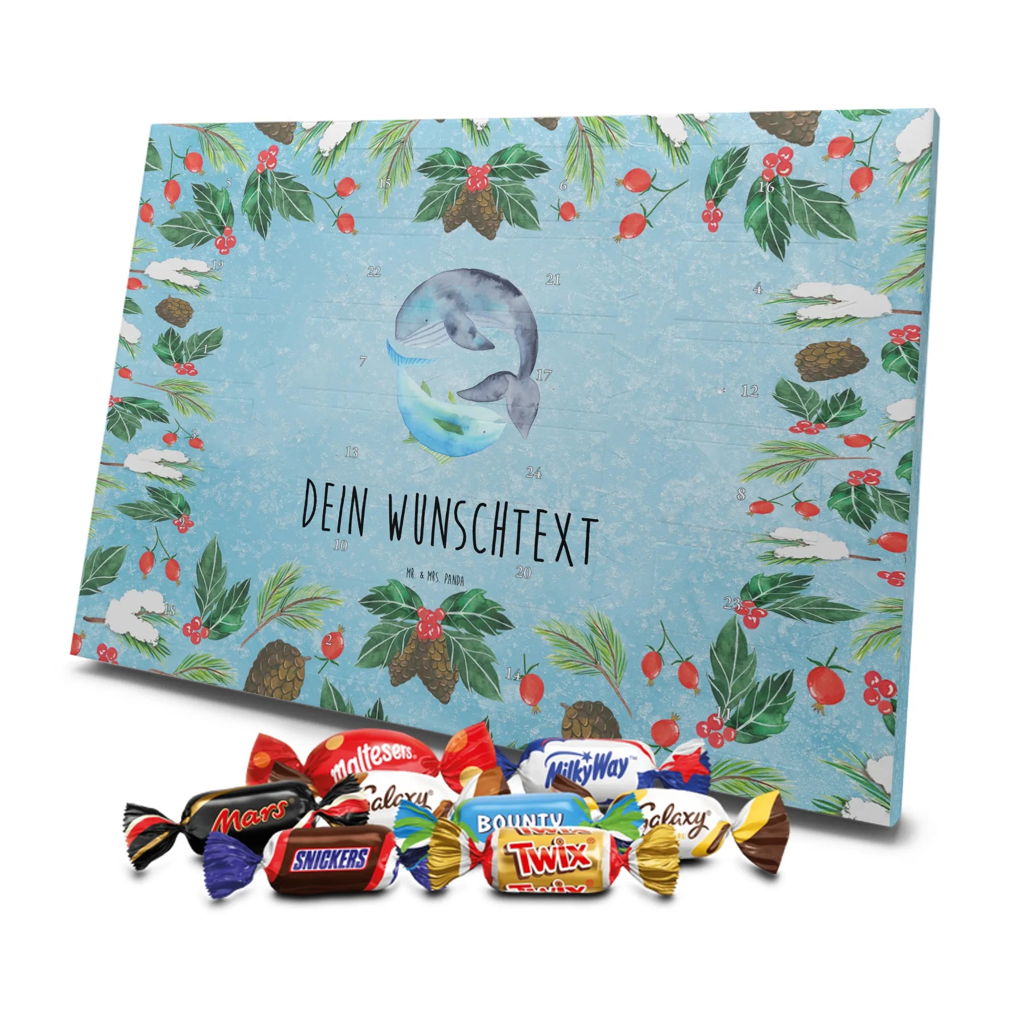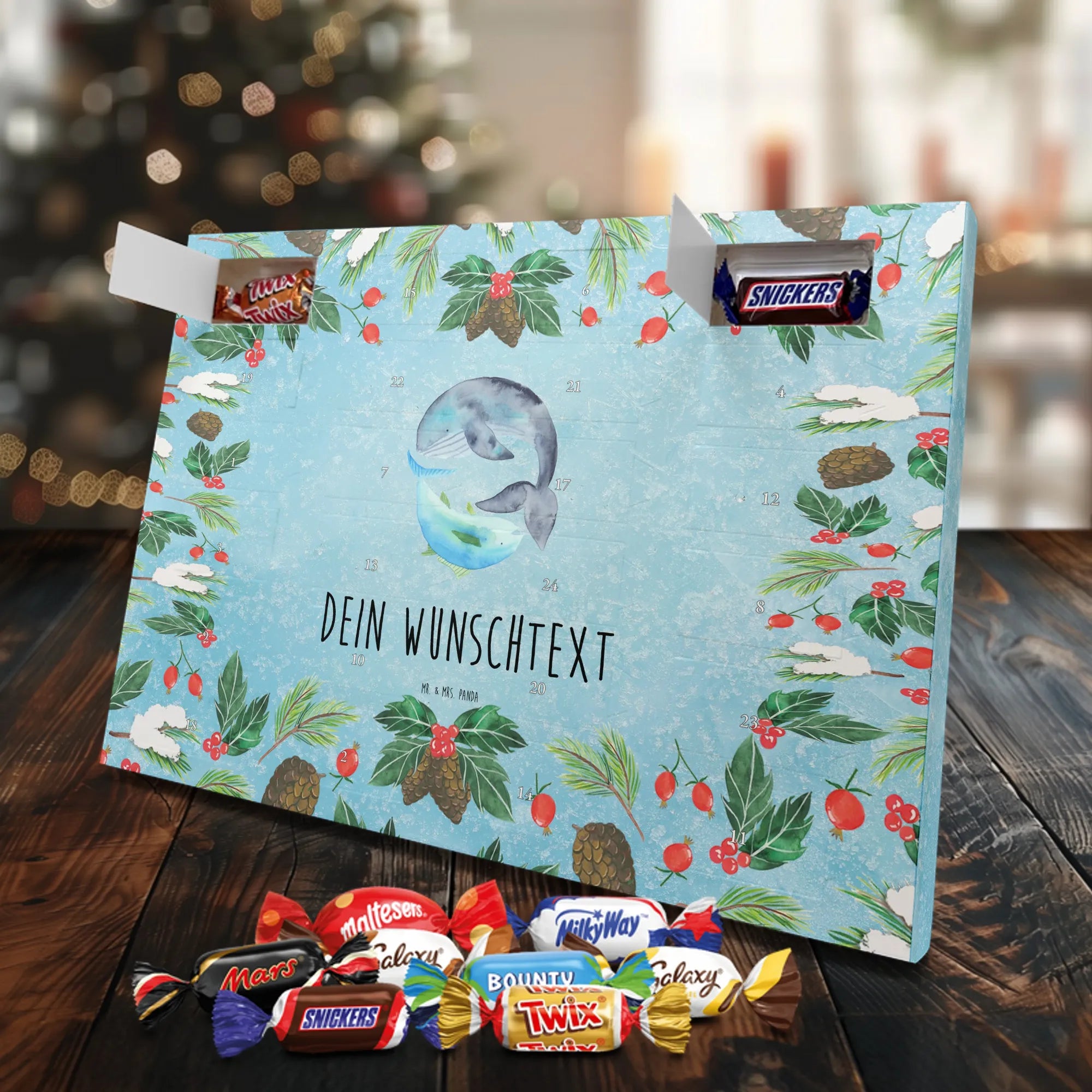 Personalisierter Schoko-Adventskalender von Mr. & Mrs. Panda – liebevoll gestaltet und ideal als individuelles Geschenk in der Adventszeit. Wir bedrucken den Kalender mit zauberhaften Motiven & herzlichen Sprüchen und personalisieren ihn mit deinem Wunschnamen oder Wunschtext. Die hochwertige Druckqualität kombiniert mit einer seidenmatten Oberflächenveredelung sorgt für ein edles Erscheinungsbild, und die bedruckten Seitenflächen geben dem Motiv zusätzlichen Charme. Der Kalender kann aufgehängt oder aufgestellt werden, sodass du ihn flexibel platzieren kannst. Gefüllt ist der Kalender mit Celebrations, die 24 hochwertige Überraschungen in 8 verschiedenen Sorten beinhalten: Maltesers, Mars, Snickers, Twix, Milky Way, Bounty, Galaxy und Galaxy Caramel. Maße: 325 mm x 225 mm x 27 mm – handlich und doch großzügig für die kleinen Leckereien hinter den Türchen. Ob für Kinder, Partner oder beste Freunde: dieser personalisierte Schoko-Adventskalender macht das Warten auf Weihnachten bunter und leckerer. Verschenke eine persönliche Erinnerung und jeden Tag ein kleines Schokoladen-Glück!