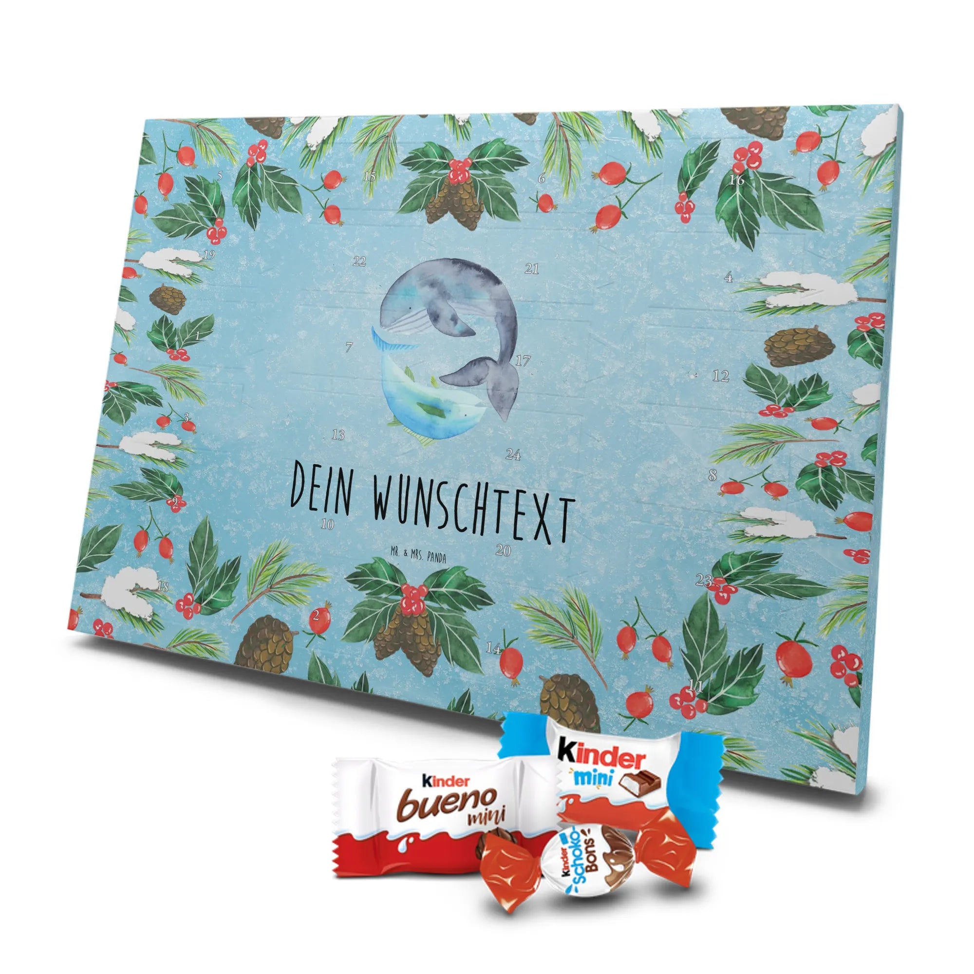 Wunderschöner Personalisierter Schoko Adventskalender von Mr. & Mrs. Panda – perfekt, um die Vorweihnachtszeit besonders persönlich zu gestalten. Unser liebevoll gestalteter Adventskalender ist bedruckt mit wunderschönen Motiven & Sprüchen von Mr. & Mrs. Panda und lässt sich mit deinem Wunschnamen oder Wunschtext personalisieren. Die brillante Druckqualität mit seidenmatter Oberflächenveredelung sorgt für einen edlen Look, und auch die Seitenflächen sind bedruckt, sodass der Kalender von allen Seiten ein Hingucker ist. Du kannst ihn sowohl aufgehängt als auch aufgestellt verwenden, je nachdem, wie es bei dir am besten passt. Maße: 355 mm x 245 mm x 11 mm – kompakt genug, um überall Platz zu finden, und groß genug für eine schöne Überraschung hinter jedem Türchen. Besonderheit: kann aufgehängt oder aufgestellt werden, ideal für Tisch, Regal oder Wand. Gefüllt mit kinder® Schokolade: Adventskalender gefüllt mit kinder® Schokolade; Inhalt: kinder® Schoko-Bons, kinder® Bueno mini und kinder® Schokolade mini. Ein toller persönlicher Adventsteller für Freunde, Familie oder dich selbst – zaubere jeden Tag ein Lächeln ins Gesicht mit süßen Highlights und einem liebevollen Design von Mr. & Mrs. Panda.