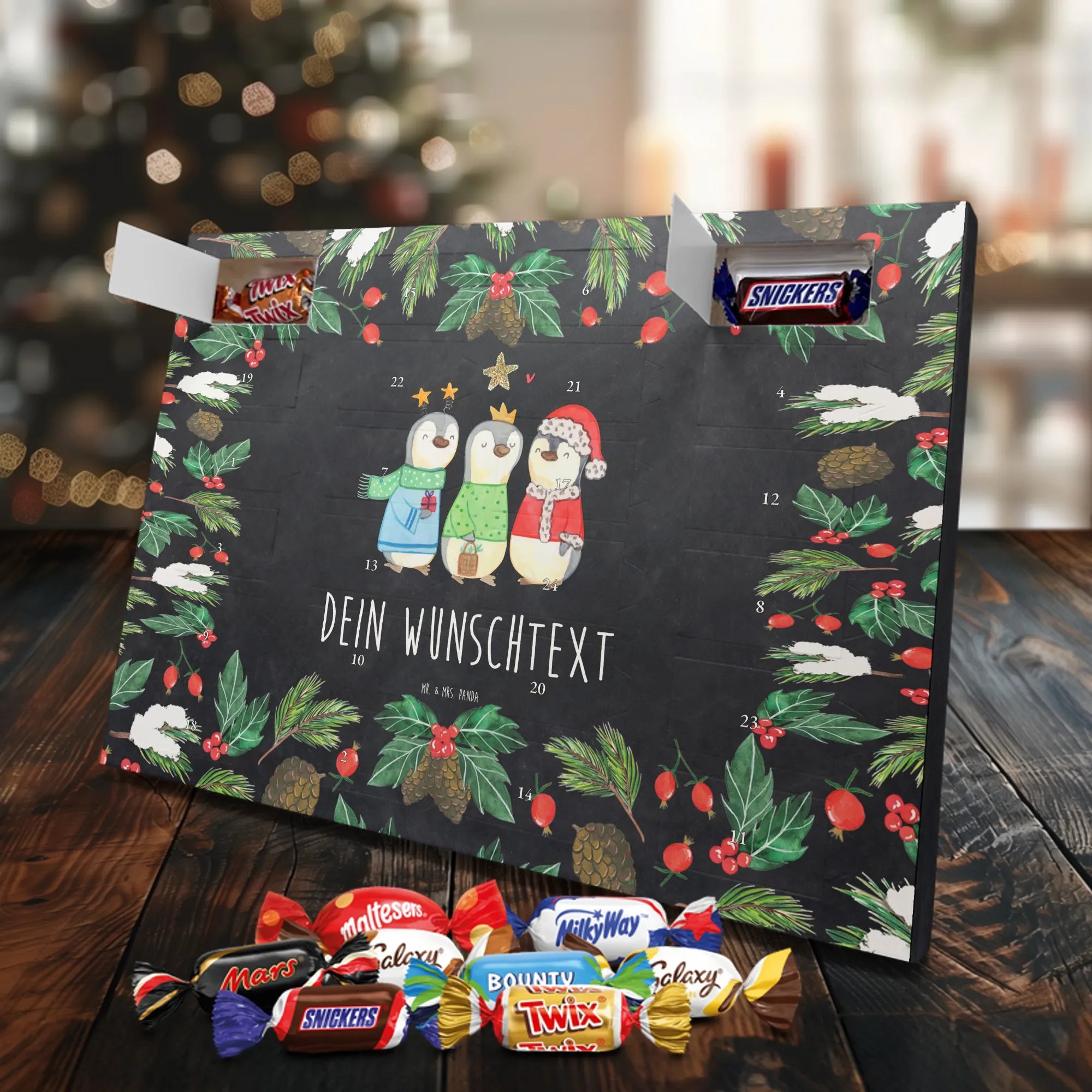 Personalisierter Schoko-Adventskalender von Mr. & Mrs. Panda – liebevoll gestaltet und ideal als individuelles Geschenk in der Adventszeit. Wir bedrucken den Kalender mit zauberhaften Motiven & herzlichen Sprüchen und personalisieren ihn mit deinem Wunschnamen oder Wunschtext. Die hochwertige Druckqualität kombiniert mit einer seidenmatten Oberflächenveredelung sorgt für ein edles Erscheinungsbild, und die bedruckten Seitenflächen geben dem Motiv zusätzlichen Charme. Der Kalender kann aufgehängt oder aufgestellt werden, sodass du ihn flexibel platzieren kannst. Gefüllt ist der Kalender mit Celebrations, die 24 hochwertige Überraschungen in 8 verschiedenen Sorten beinhalten: Maltesers, Mars, Snickers, Twix, Milky Way, Bounty, Galaxy und Galaxy Caramel. Maße: 325 mm x 225 mm x 27 mm – handlich und doch großzügig für die kleinen Leckereien hinter den Türchen. Ob für Kinder, Partner oder beste Freunde: dieser personalisierte Schoko-Adventskalender macht das Warten auf Weihnachten bunter und leckerer. Verschenke eine persönliche Erinnerung und jeden Tag ein kleines Schokoladen-Glück!