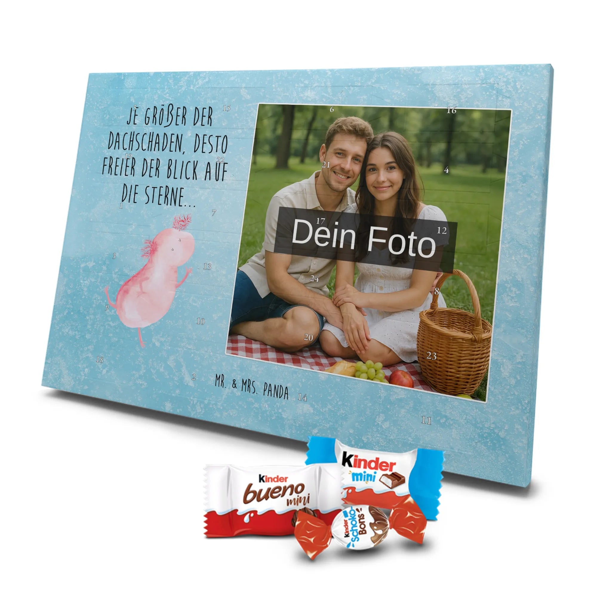 Schoko Foto Adventskalender personalisiert – ein zauberhaftes Produkt von Mr. & Mrs. Panda, das Erinnerungen und Süßigkeiten kombiniert. Gestalte die Vorderseite mit einem persönlichen Foto und überrasche deine Liebsten jeden Tag im Advent. Unsere Designs mit niedlichen Illustrationen und liebevollen Sprüchen runden das Foto perfekt ab. Bitte lade ein hochauflösendes Foto hoch und prüfe den Bildausschnitt, damit das Druckbild optimal wird. Verwende nur Bilder, für die du die Rechte besitzt oder die Freigabe der abgebildeten Personen vorliegt. Beachte: Wir schneiden oder bearbeiten die Fotos nicht; personalisierte Foto-Artikel sind von der Rückgabe ausgeschlossen. Der Kalender besticht durch brillante Druckqualität, seidenmatte Oberflächenveredelung und bedruckte Seitenflächen für ein hochwertiges Finish. Maße: 355 mm x 245 mm x 11 mm. Du kannst den Kalender aufstellen oder ihn an der Wand aufhängen. Gefüllt mit kinder® Schokolade – inklusive kinder® Schoko-Bons, kinder® Bueno mini und kinder® Schokolade mini. Ein warmherziges, persönliches Geschenk mit dem typischen Mr. & Mrs. Panda Flair, das Vorfreude und Geschmack vereint.